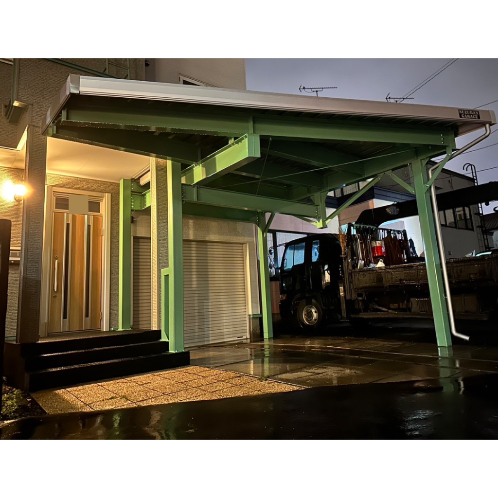 The鈴蘭ガレージカーポート!!!狭い空間をうまく使って玄関・ガレージ前をカバー°˖✧ 鉄骨塗装色:ライトグリーン(特注色) アルミ破風:シルバー ドレンパイプ:シルバー