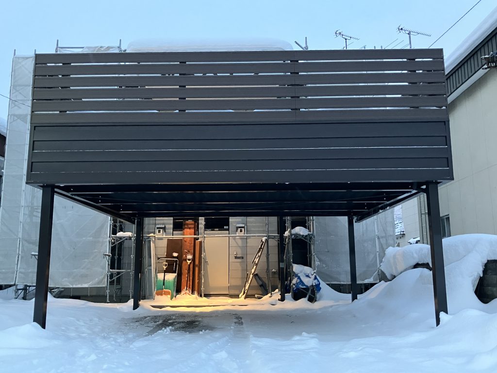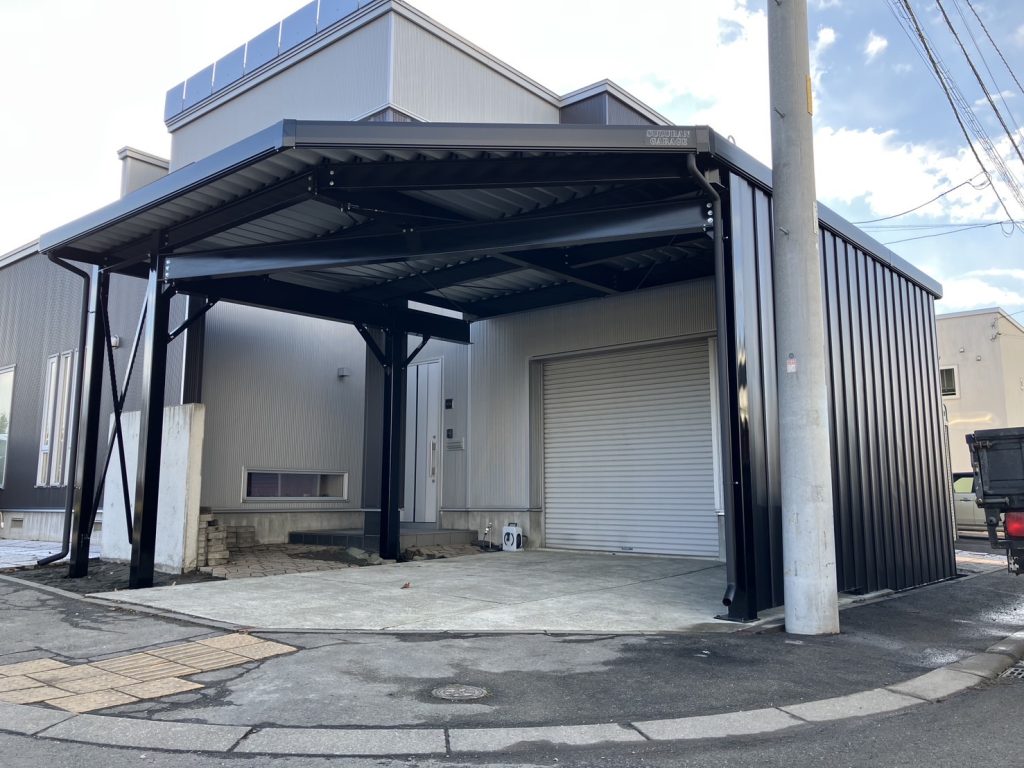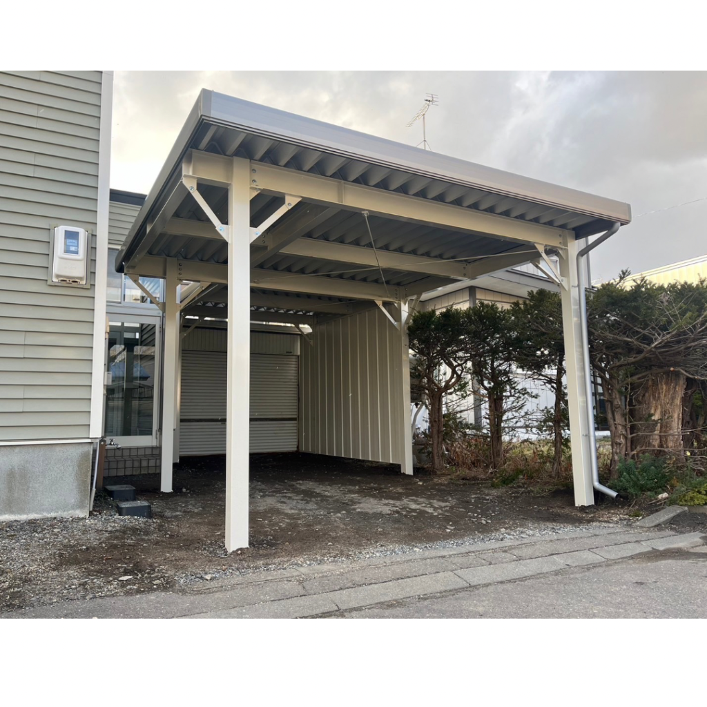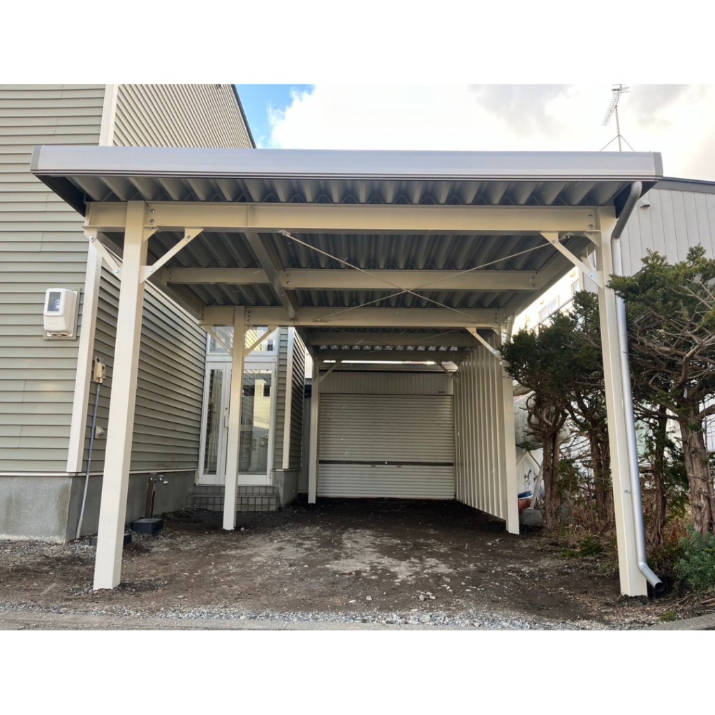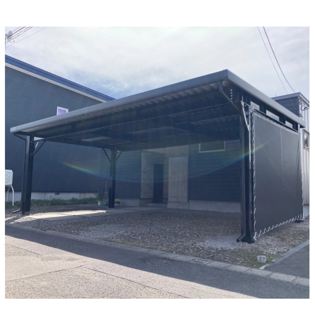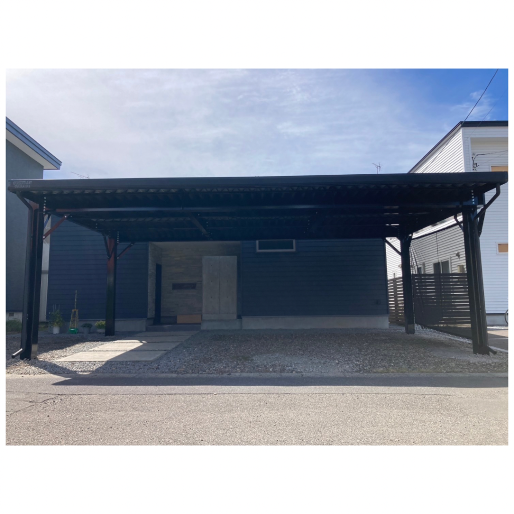 変わった形になりますがすべての希望をかなえています!!!前からでも横からでも駐車可能。雪が落ちる部分には屋根はかけずに!!! 鉄骨塗装色:ブラック アルミ破風:ブラック ドレンパイプ:ブラック