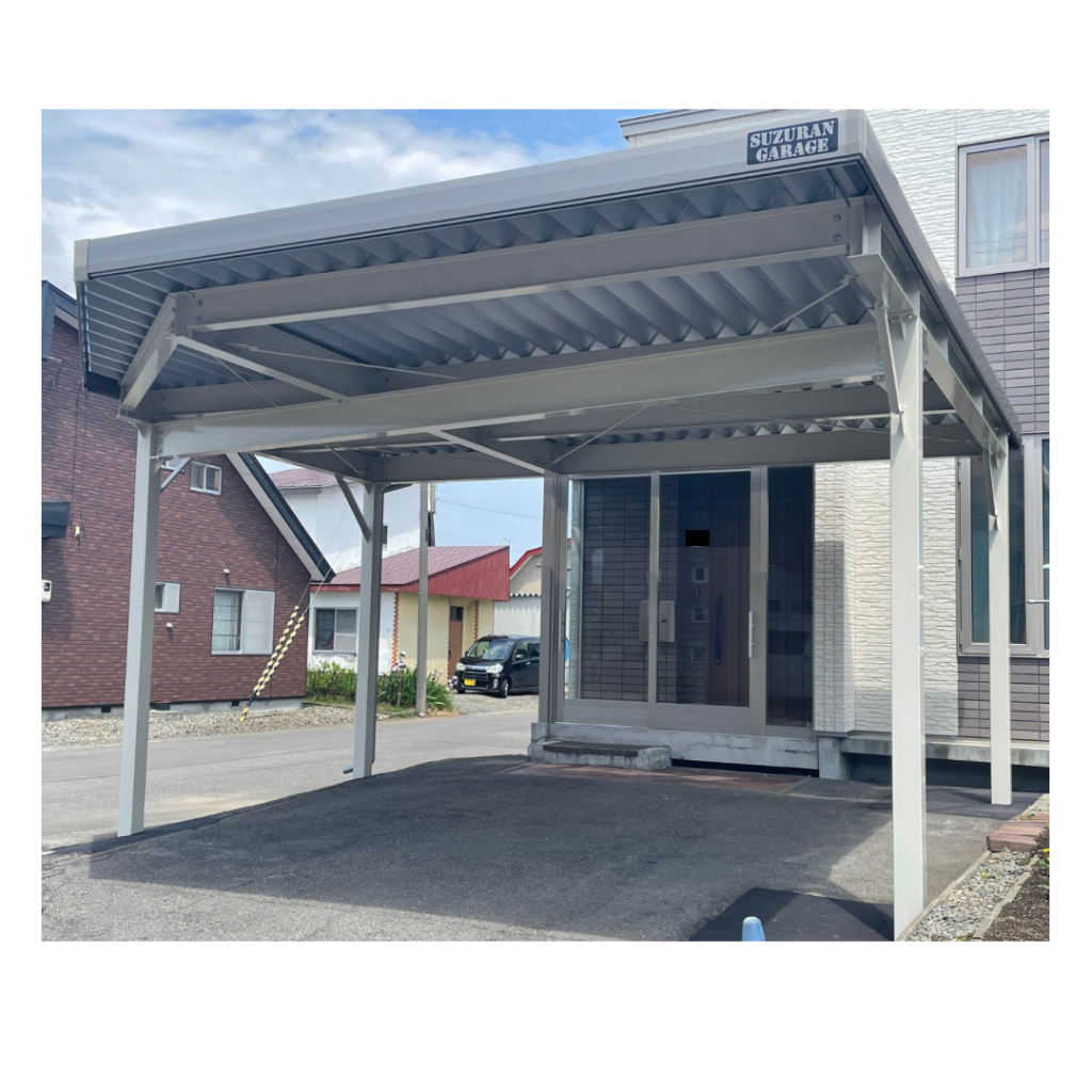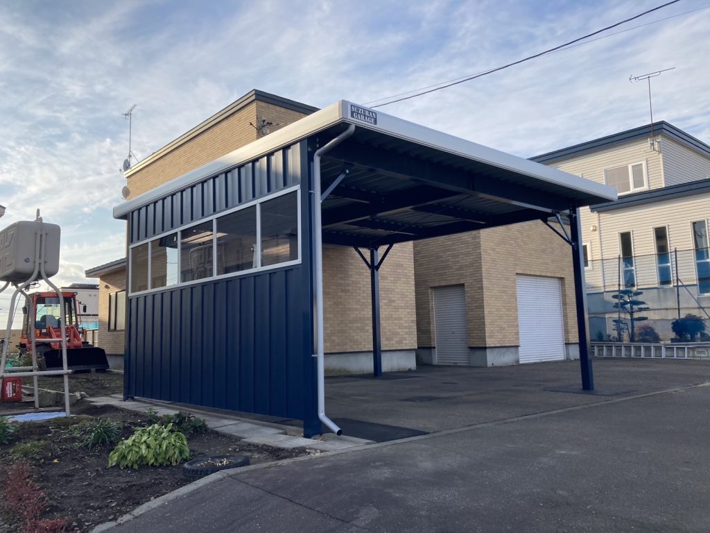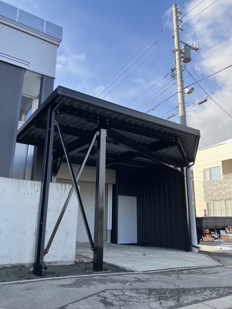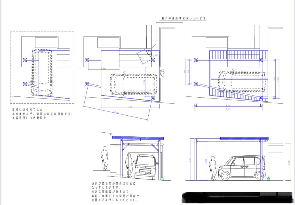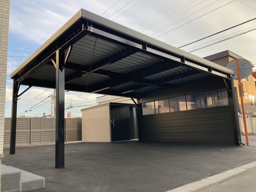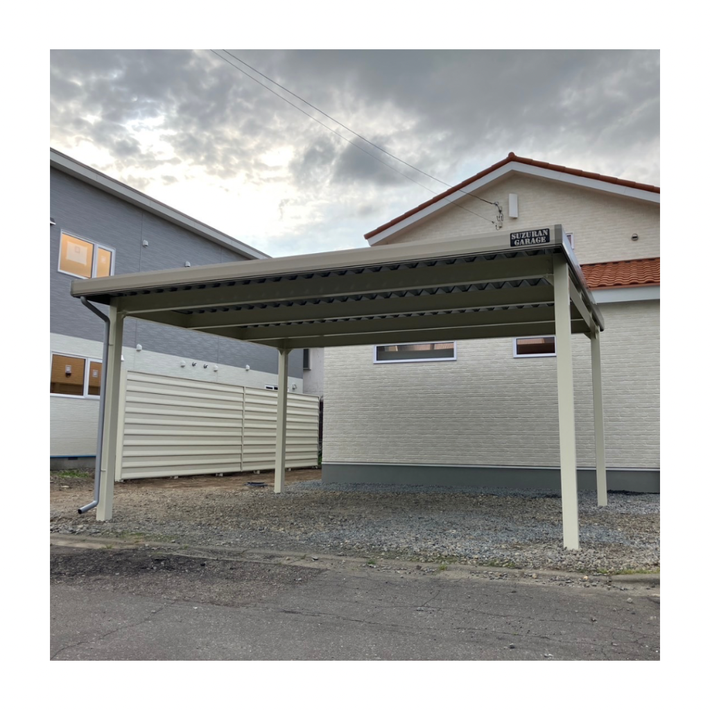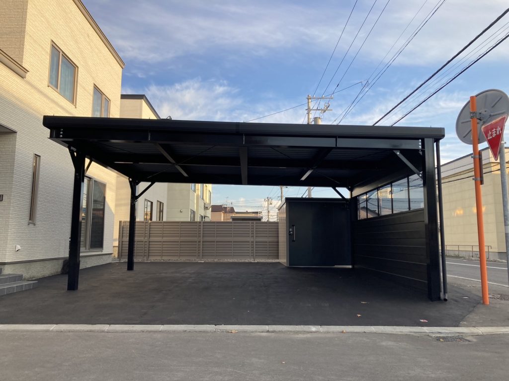 変わった形になりますがすべての希望をかなえています!!!前からでも横からでも駐車可能。雪が落ちる部分には屋根はかけずに!!! 鉄骨塗装色:ブラック アルミ破風:ブラック ドレンパイプ:ブラック