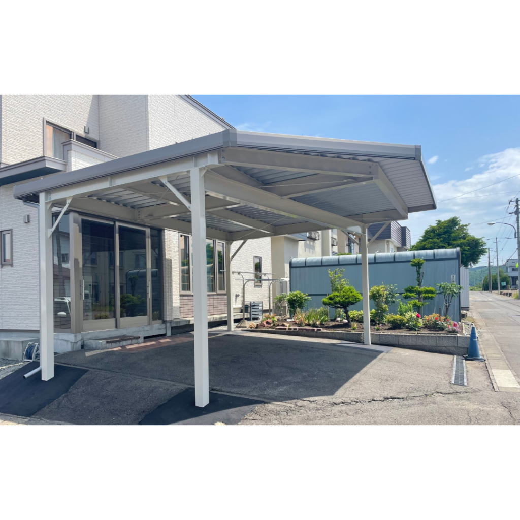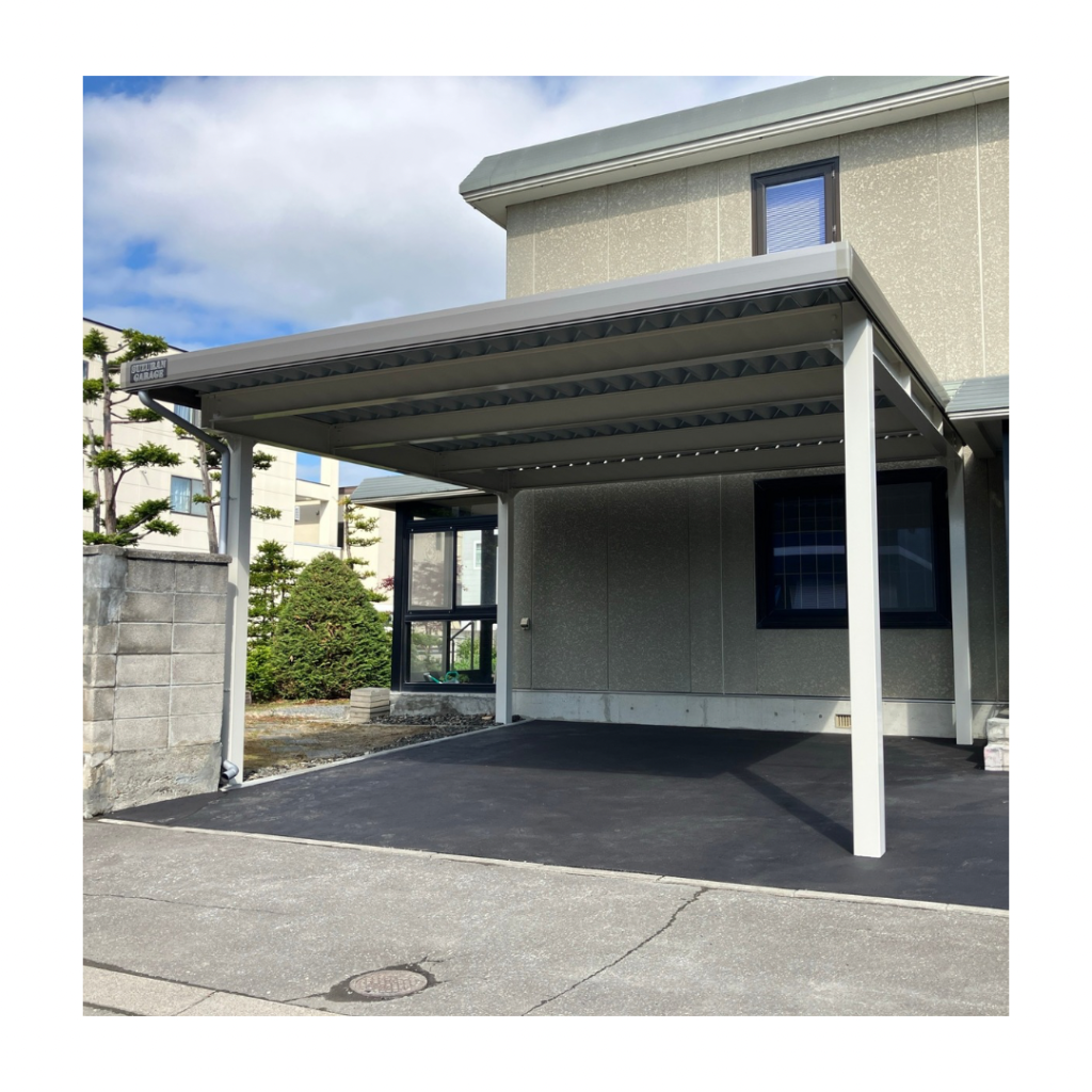 隅切り角地に合わせたカーポート施工!!! 鉄骨塗装色:ホワイトアイボリー アルミ破風:アーバングレー ドレンパイプ:シルバー