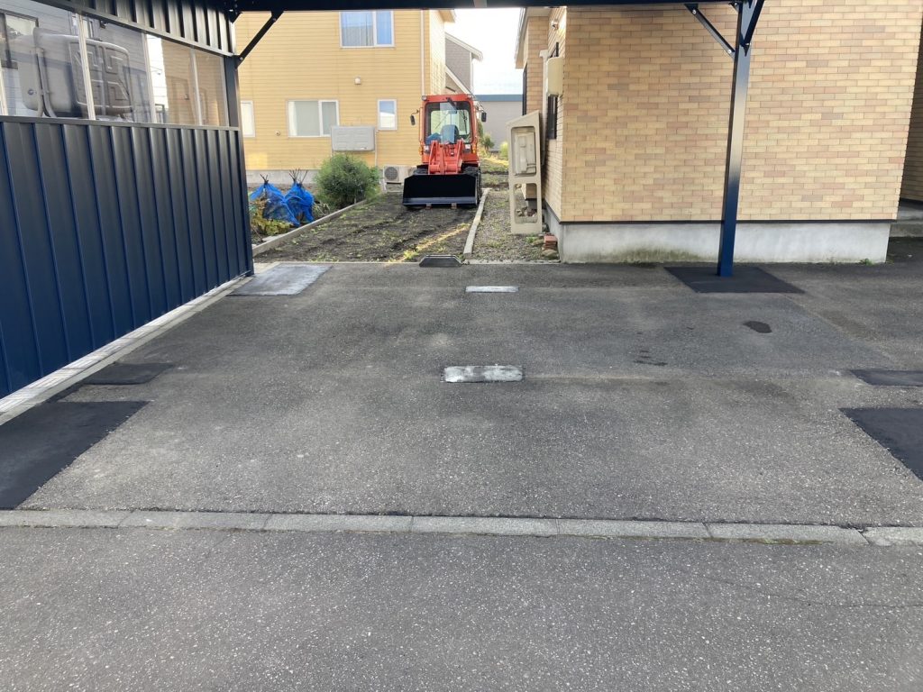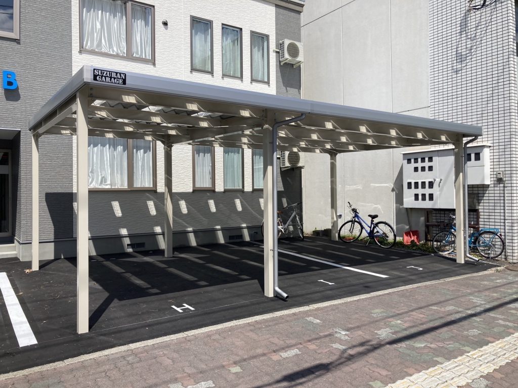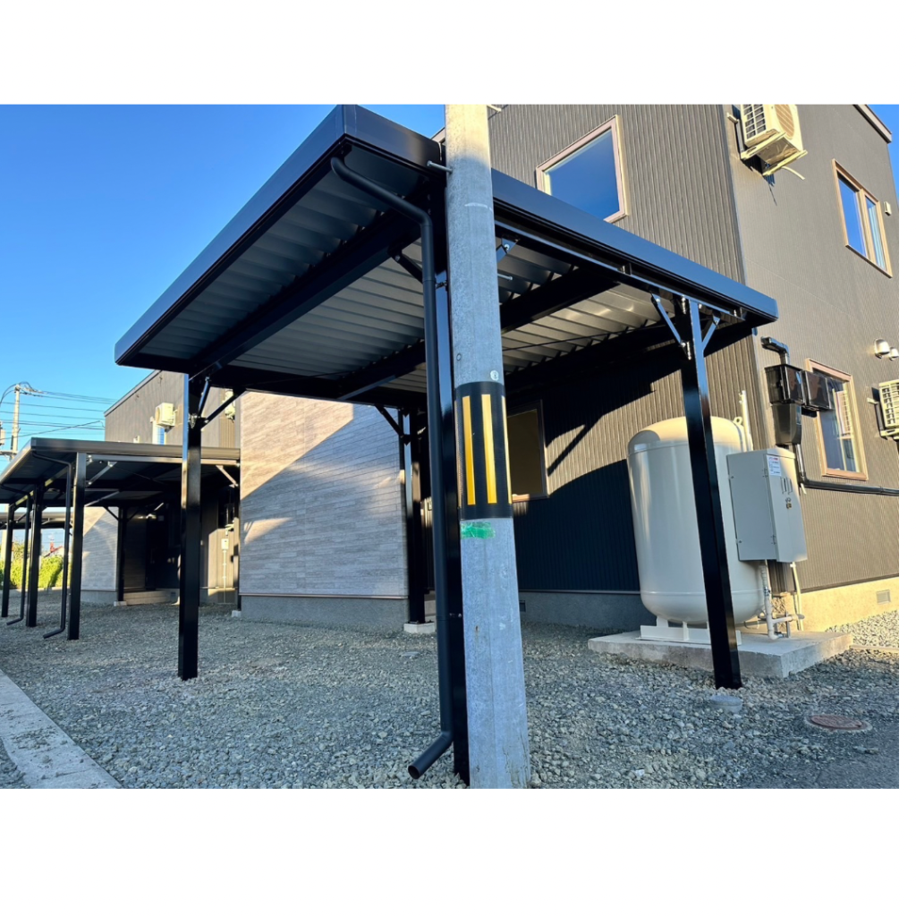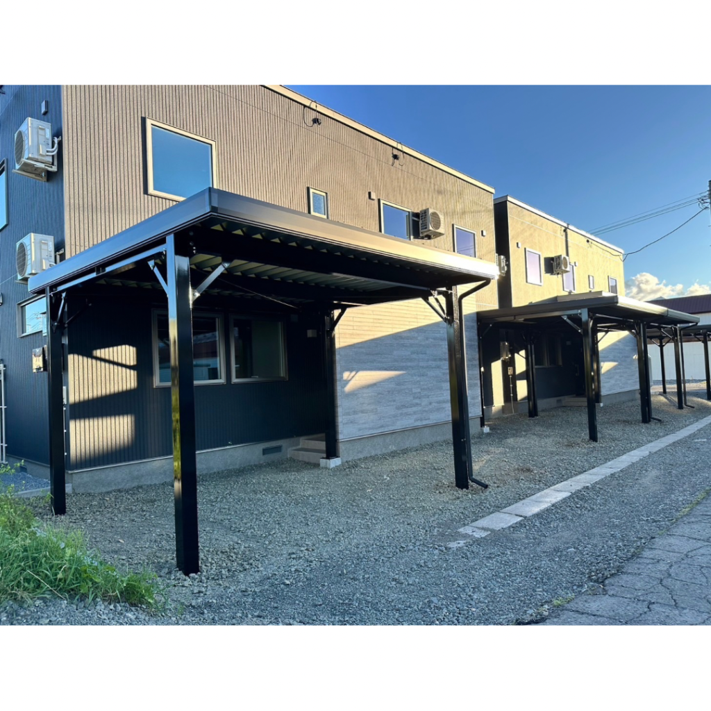 アパート前に1台用ワイドカーポート4棟施工°˖✧ 鉄骨塗装色:ブラック アルミ破風:ブラック ドレンパイプ:ブラック