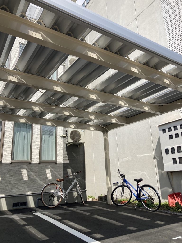 マンション前に光を取り入れるための透明ポリカ素材を使用してカーポートを設置!!! 鉄骨塗装色:ベージュ アルミ破風:シルバー ドレンパイプ:シルバー