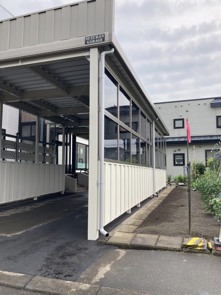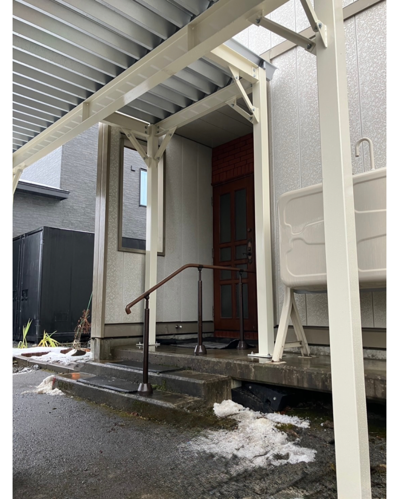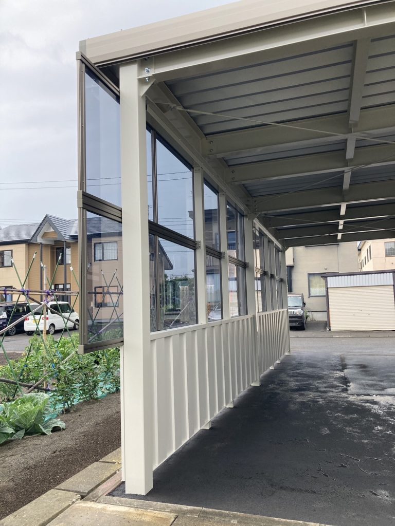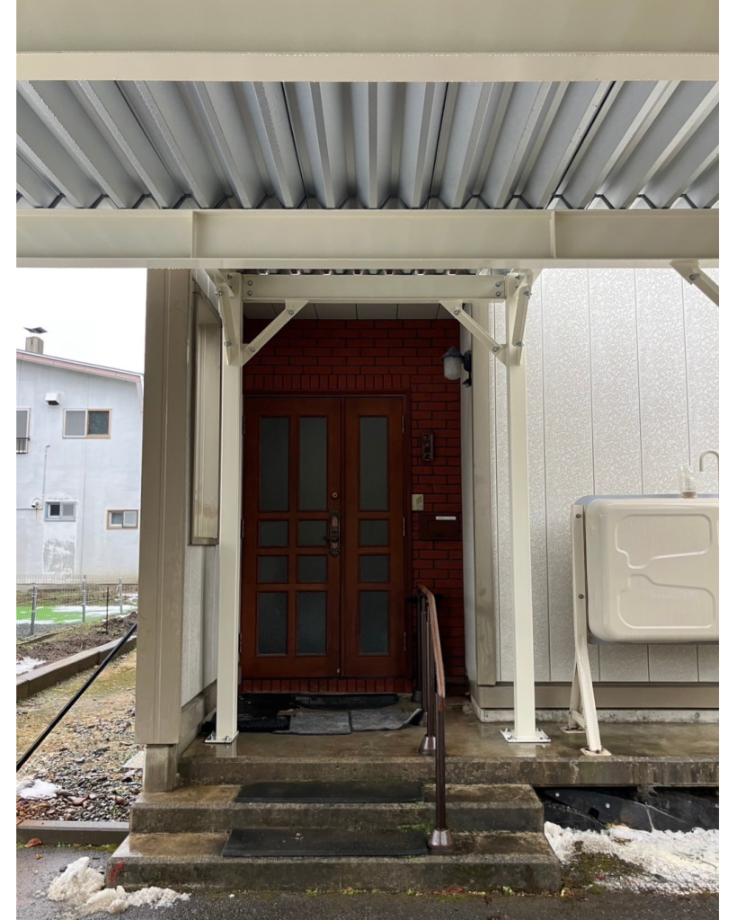 玄関前まで屋根をギリギリ延ばして雪が降る季節に大活躍!!! 鉄骨塗装色:リッチクリーム アルミ破風:アーバングレー ドレンパイプ:シルバー