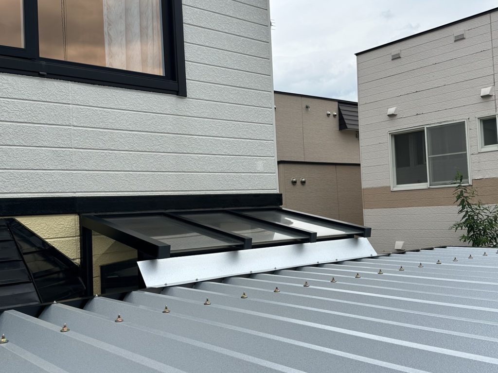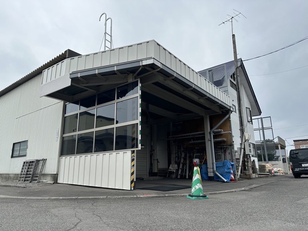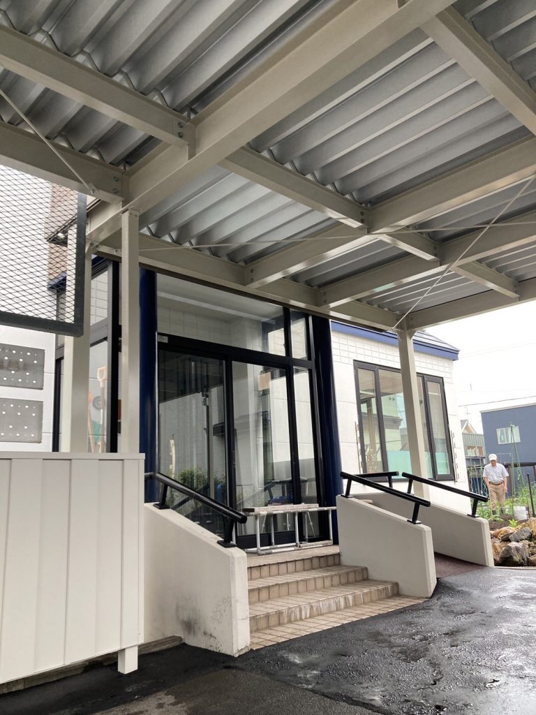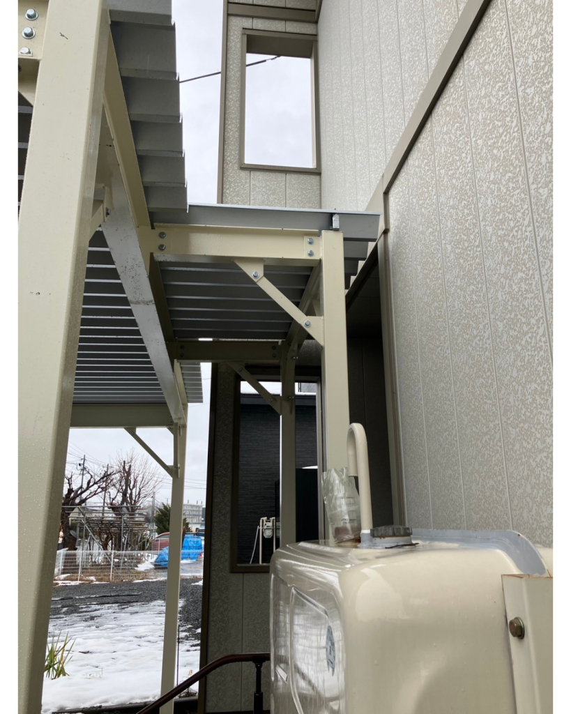 玄関前まで屋根をギリギリ延ばして雪が降る季節に大活躍!!! 鉄骨塗装色:リッチクリーム アルミ破風:アーバングレー ドレンパイプ:シルバー
