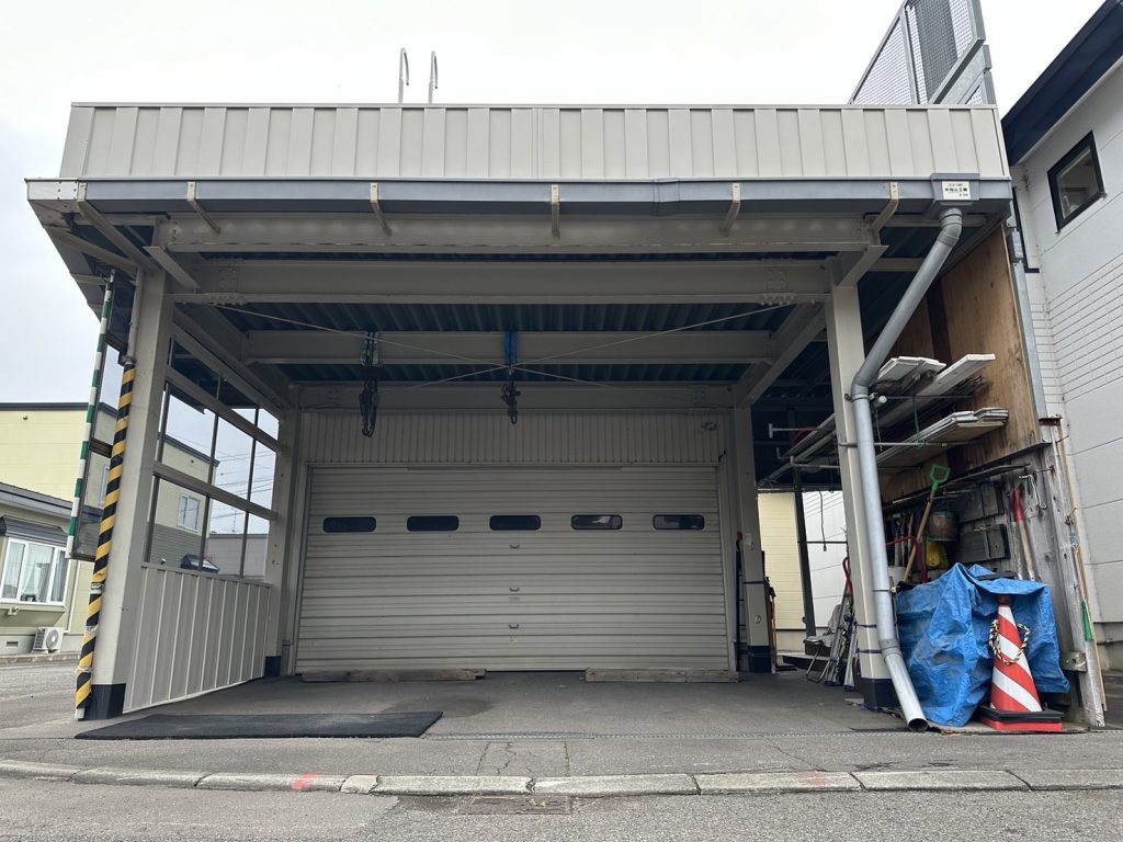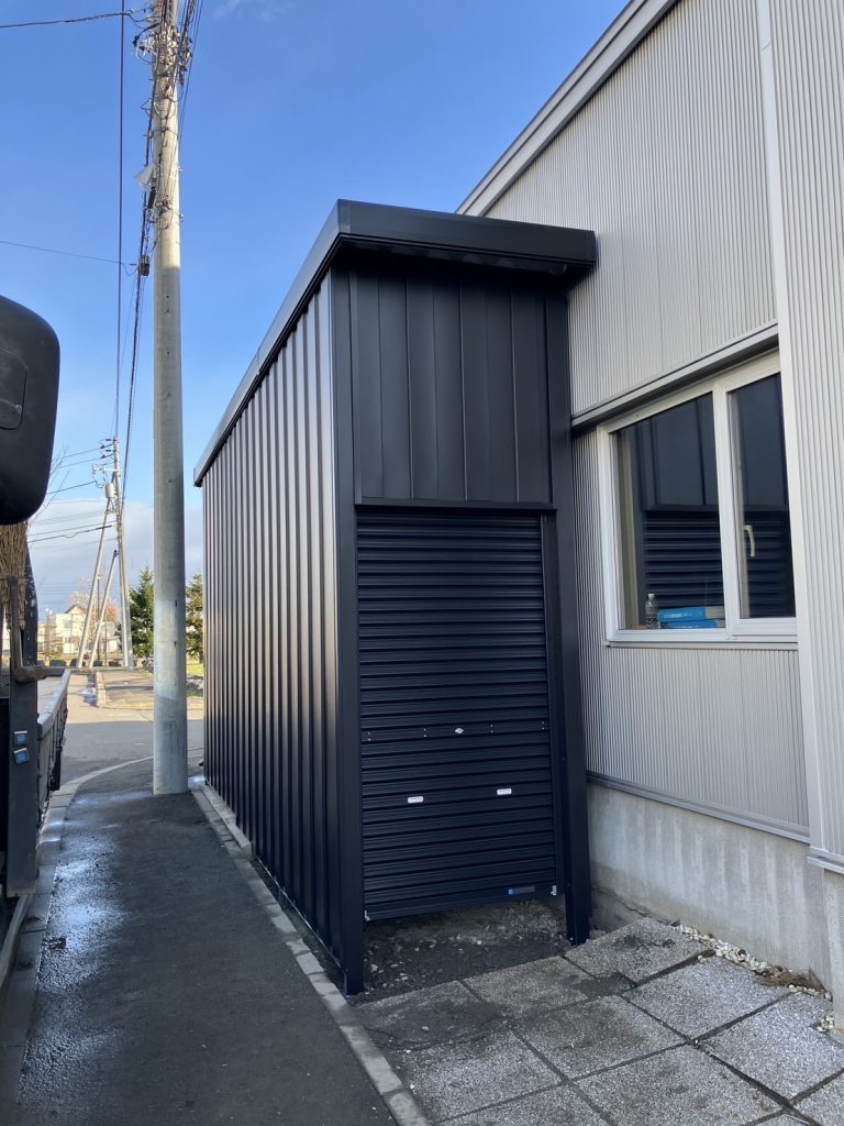 隅切りの土地に合わせて施工!!!狭いスペースも1台用のバイクガレージに!!! 鉄骨塗装色:ブラック 外壁色:ブラック(縦) アルミ破風:ブラック シャッター:シルバーグレー/ブラック ドレンパイプ:ブラック