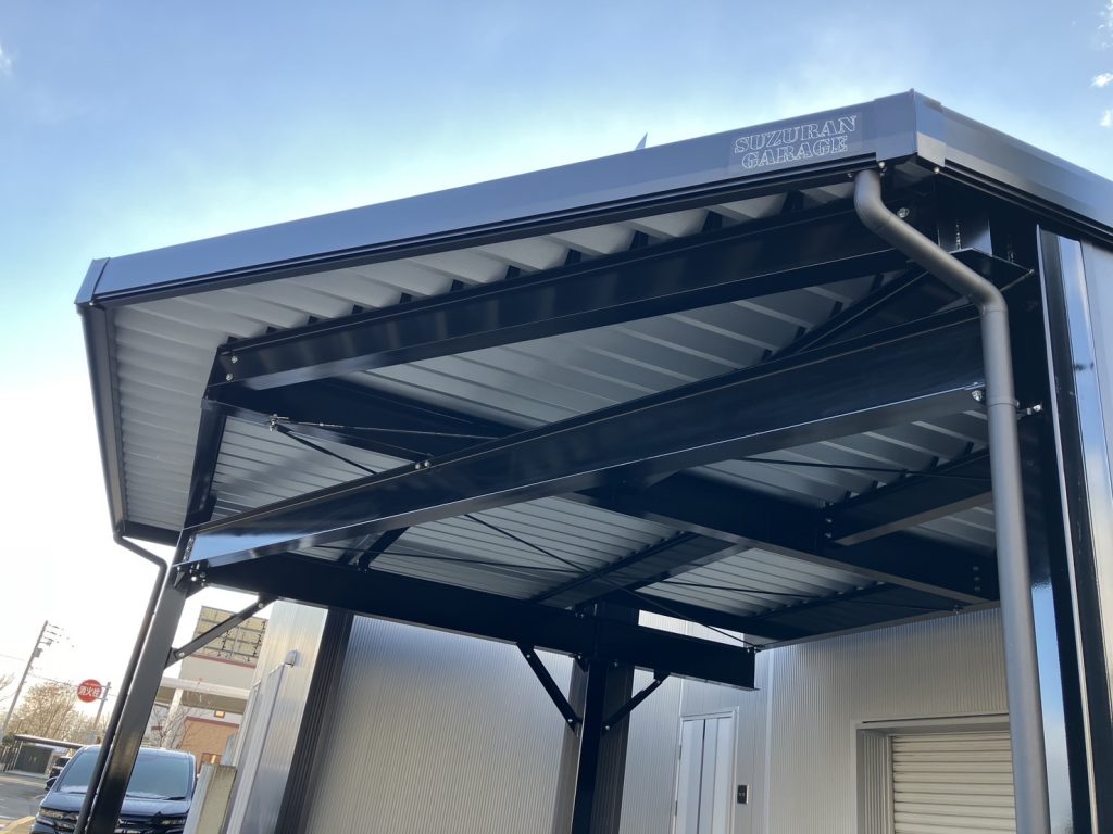 間口は2台用ワイドよりも広めの6.4Mで高さも2.5Mを確保!!! 鉄骨塗装色:ブラック 外壁色:ブラック(縦) アルミ破風:ブラック ドレンパイプ:ブラック
