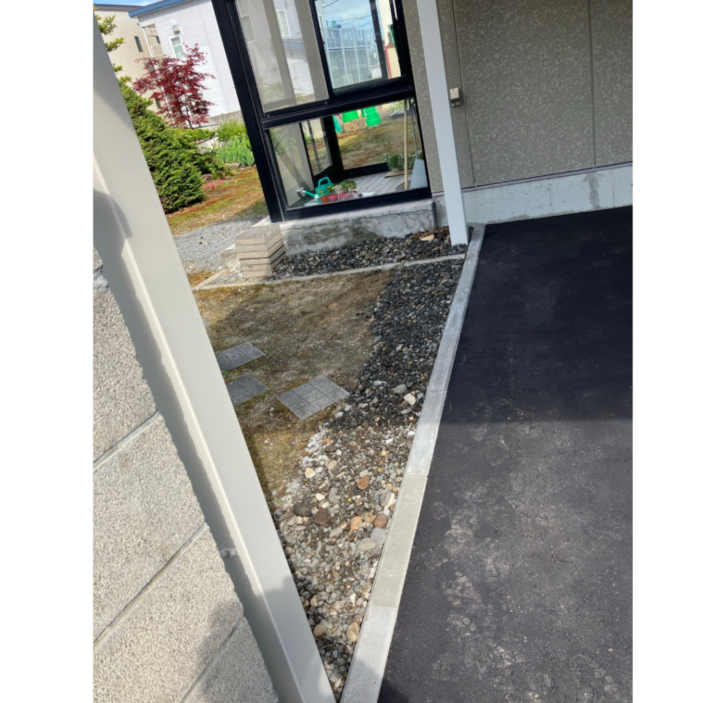 既存のガレージを半分の大きさに加工して活かしつつ、その前に1台用ロングカーポートを施工!!!乗り降りの際のことも考えて屋根を玄関まで伸ばしストレスフリーに!!! 鉄骨塗装色:ホワイトアイボリー アルミ破風:アーバングレー ドレンパイプ:シルバー
