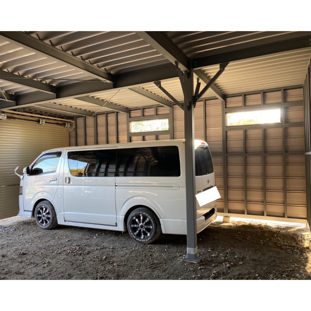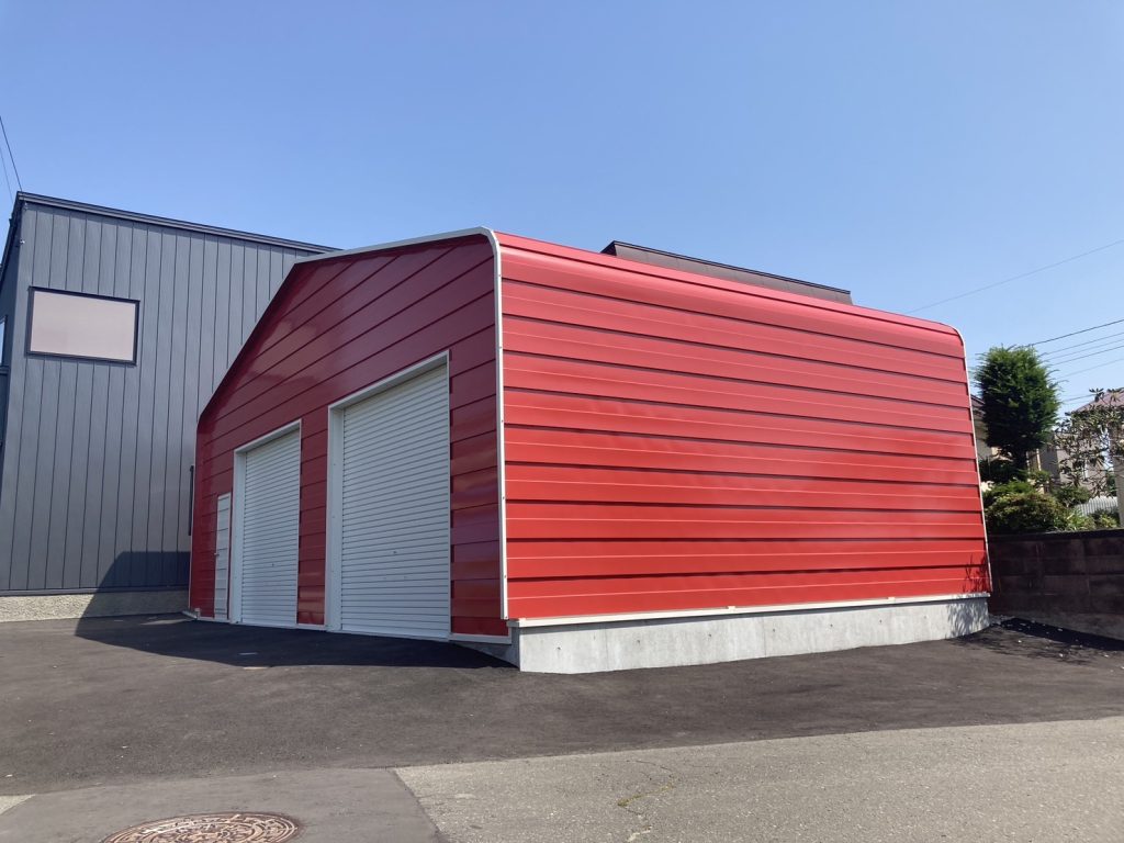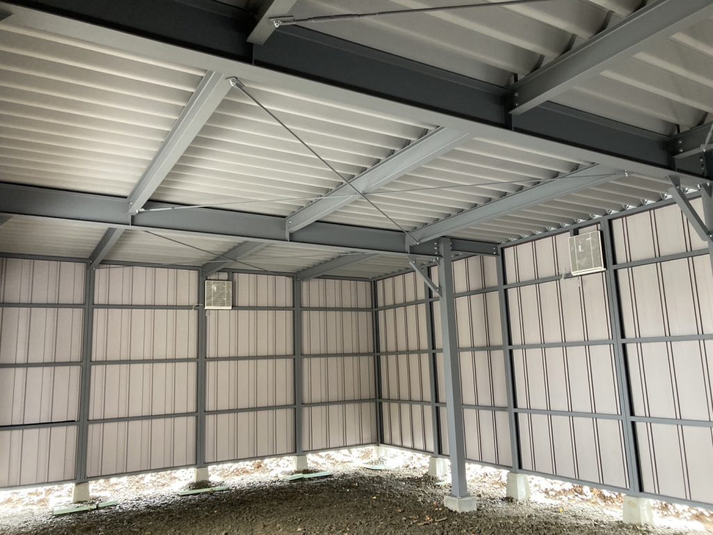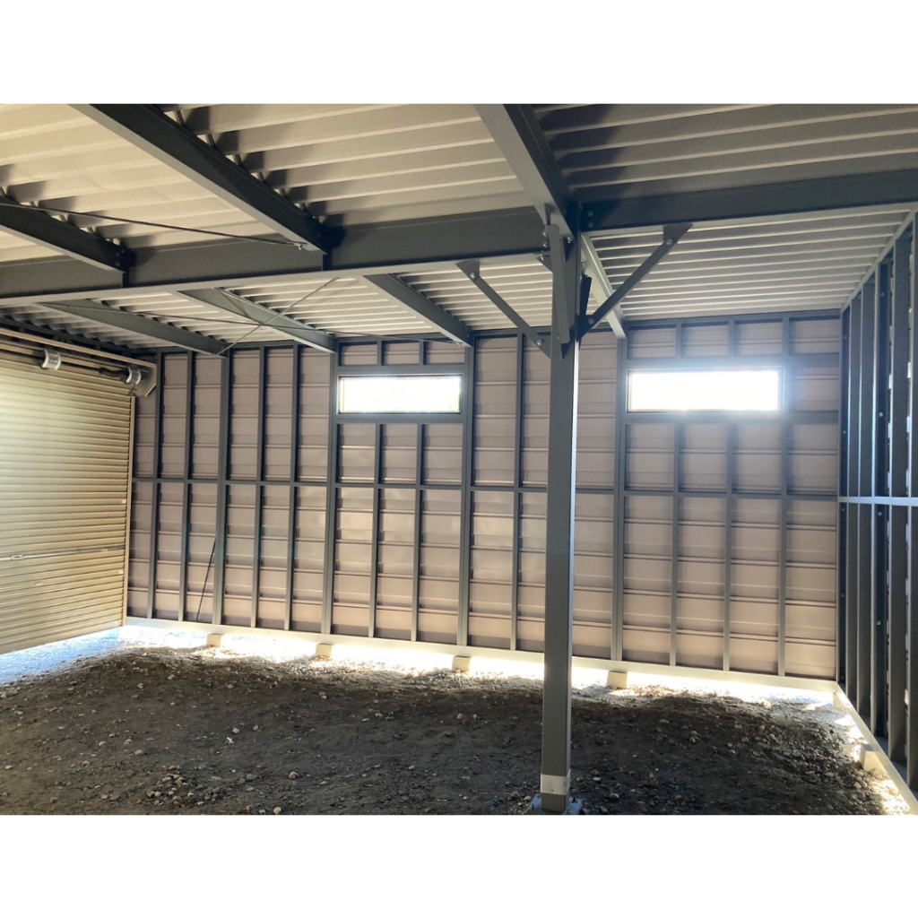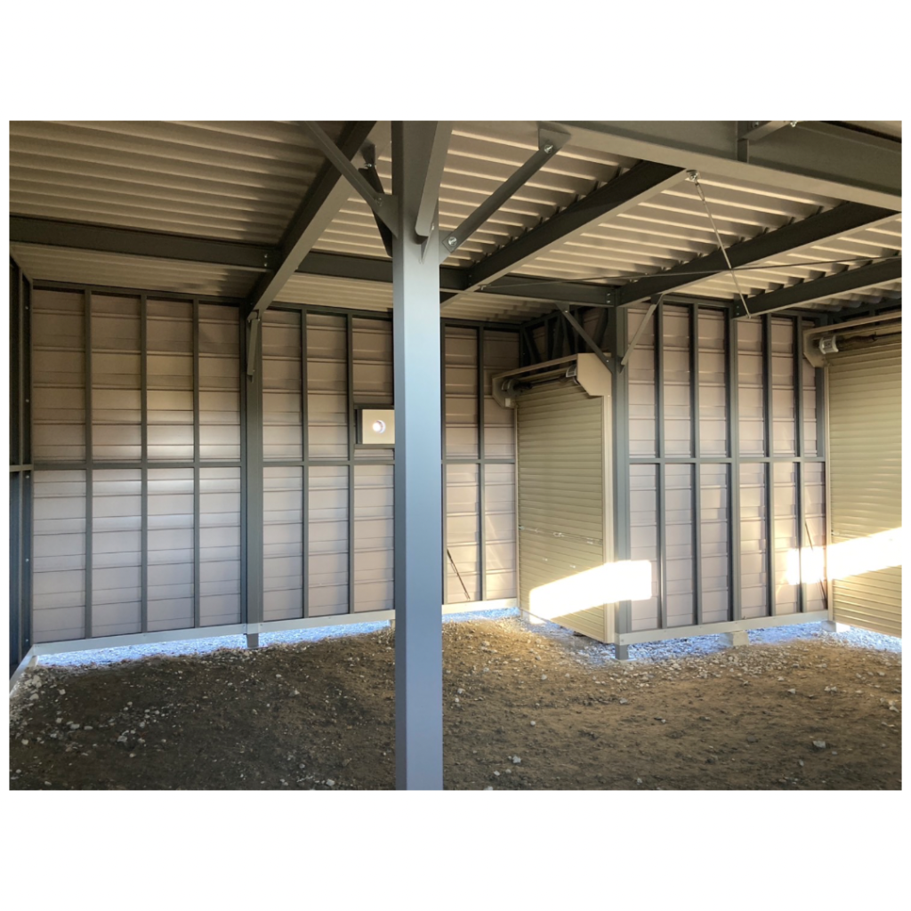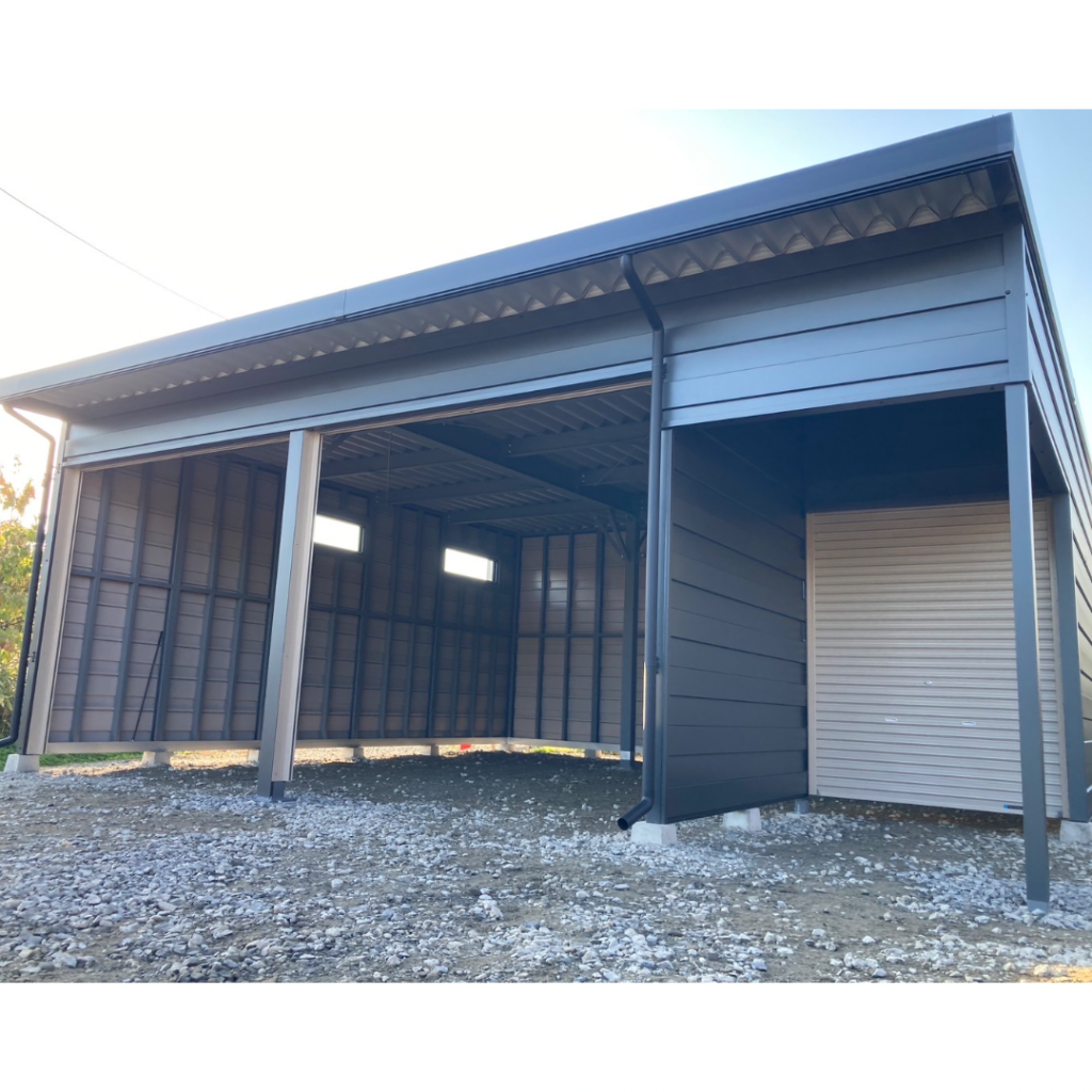 使用上で邪魔にならない場所に柱を設置。広い空間お確保!! 鉄骨塗装色:グレー 外壁色:ダークレッド(縦) アルミ破風:アーバングレー シャッター:ペールベージュ ドレンパイプ:シルバー