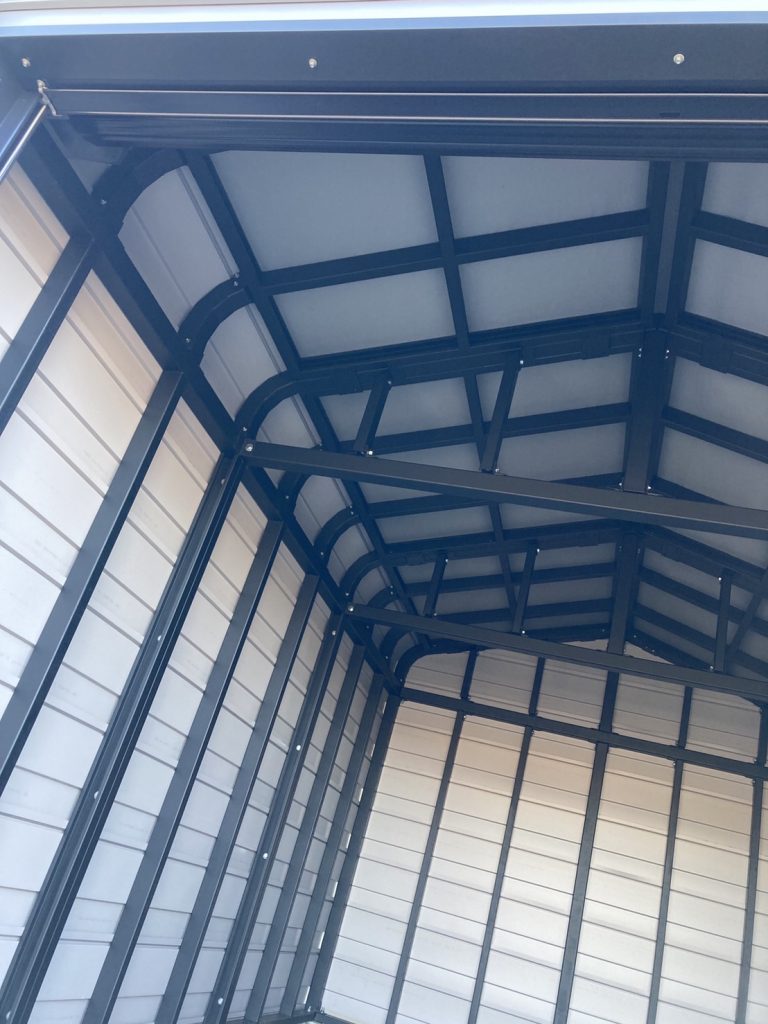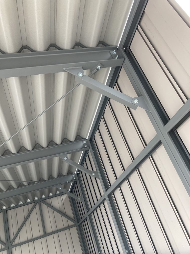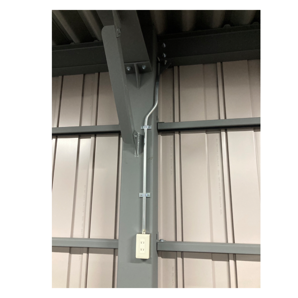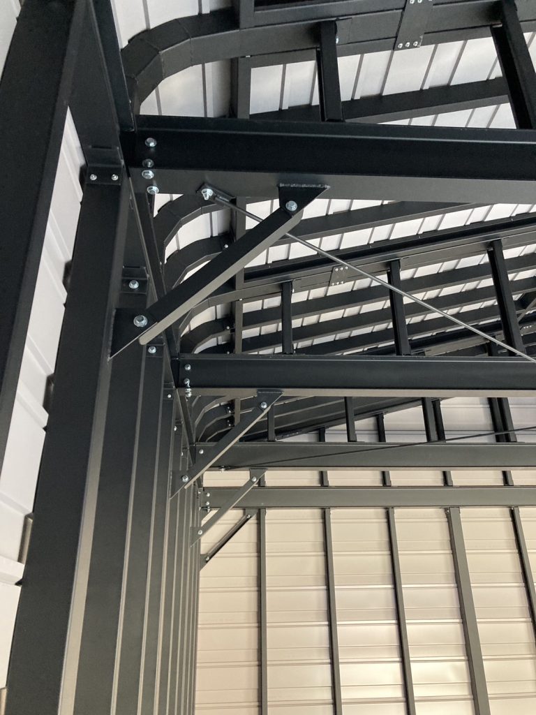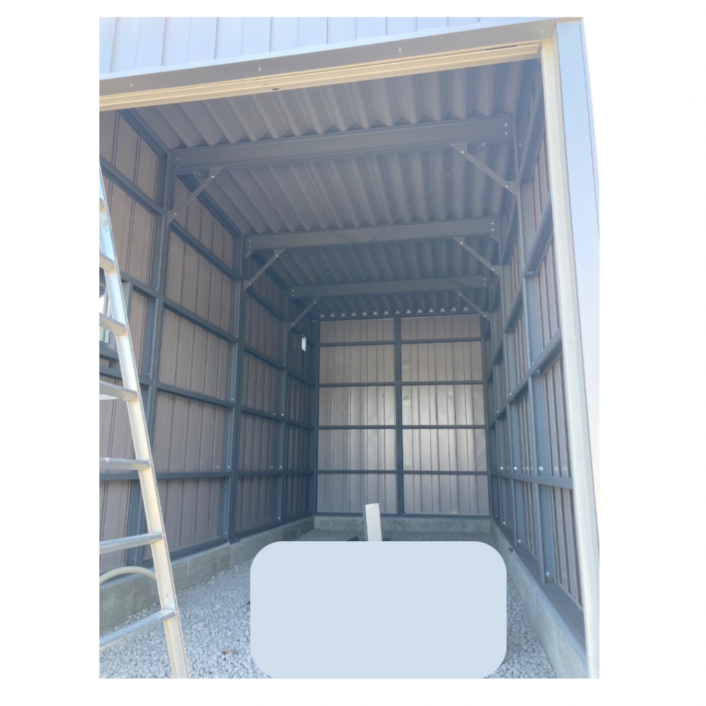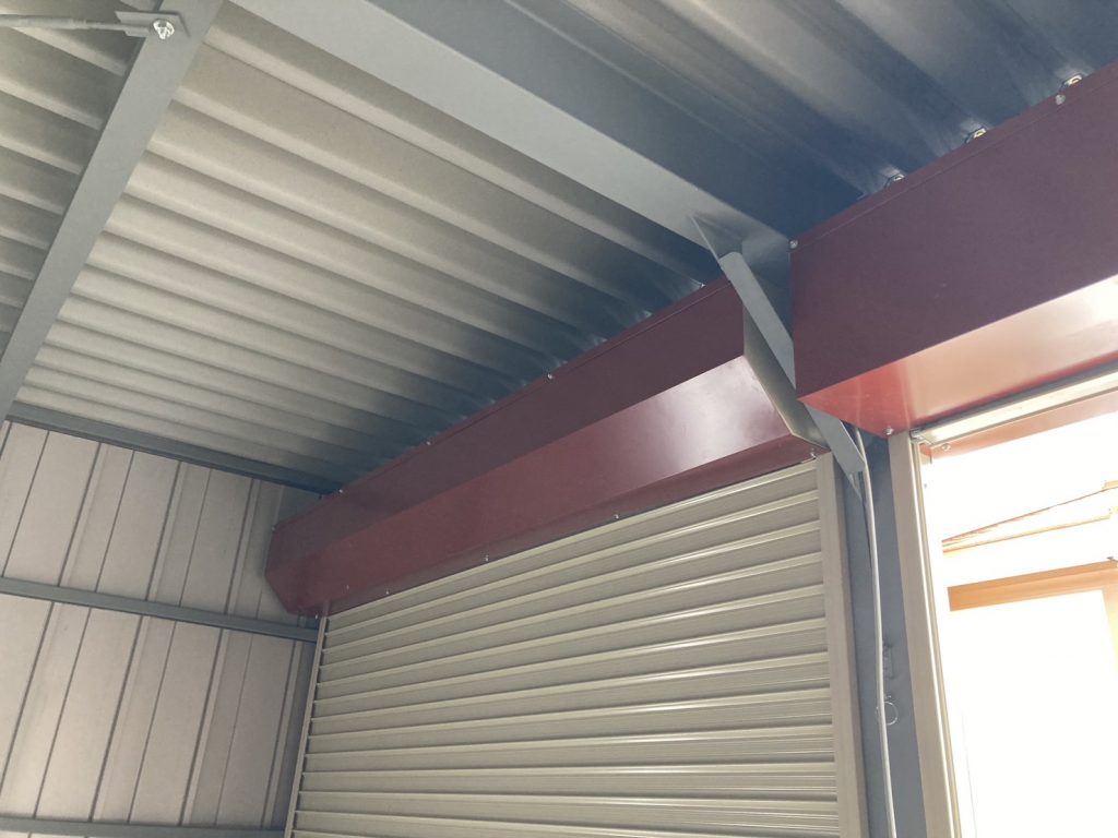 使用上で邪魔にならない場所に柱を設置。広い空間お確保!! 鉄骨塗装色:グレー 外壁色:ダークレッド(縦) アルミ破風:アーバングレー シャッター:ペールベージュ ドレンパイプ:シルバー