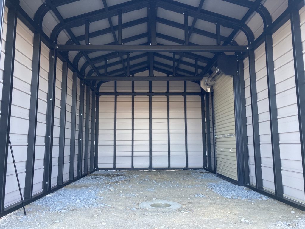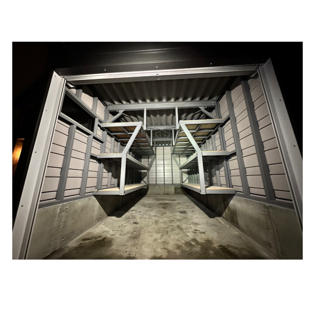 大型バイクが2台収納可能!!オプションの棚をつけて収納もバッチリ!!内部は土間コンクリートで仕上げています。 鉄骨塗装色:グレー 外壁色:シルバー(横) アルミ破風:ブラック シャッター:ブラック ドレンパイプ:ブラック