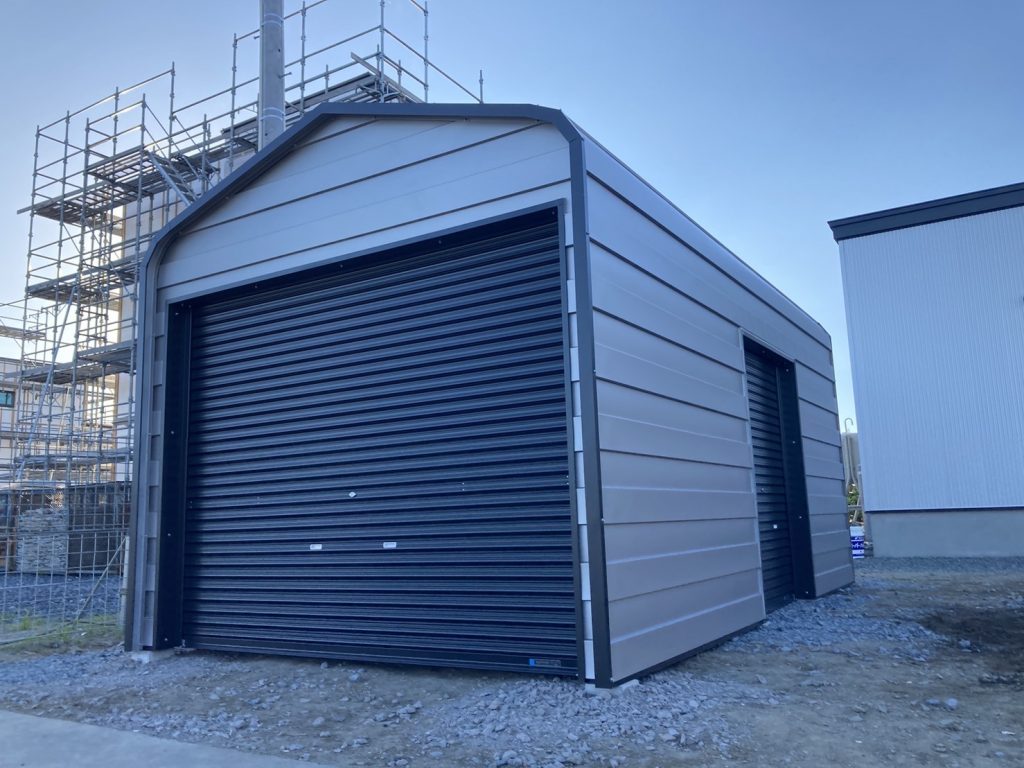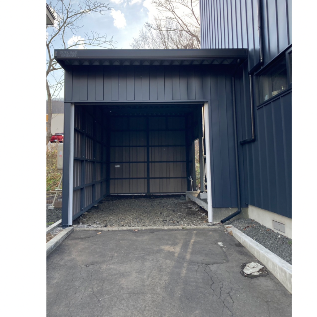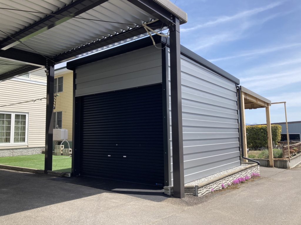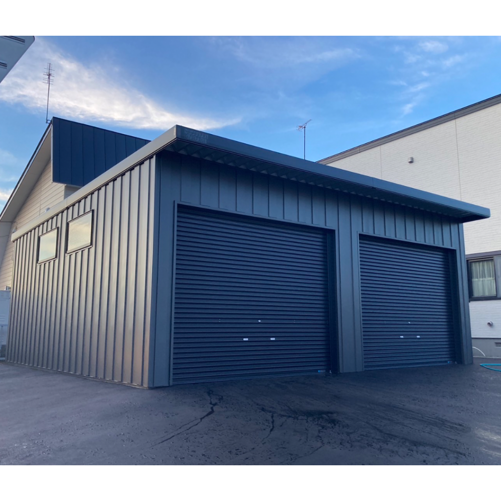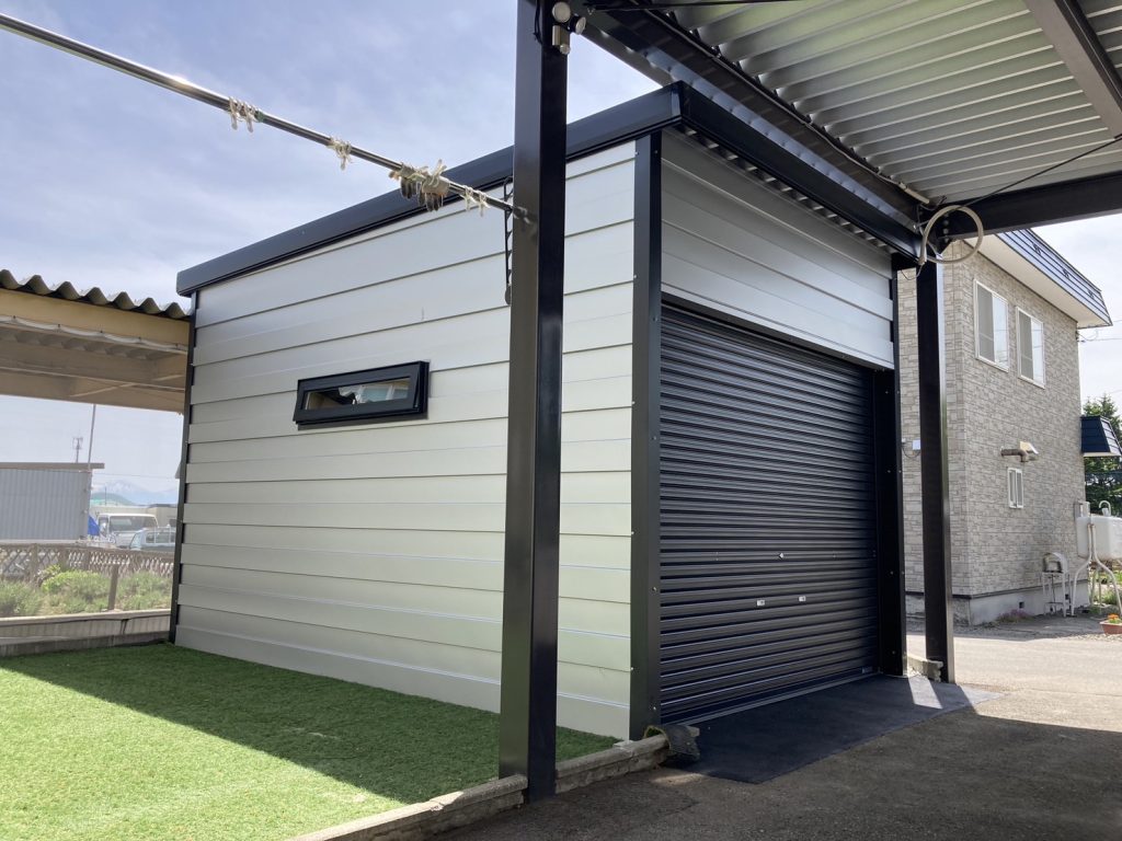 企業様敷地内施工ガレージ 鉄骨塗装色:グレー 外壁色:マットホワイト(縦) アルミ破風:シルバー シャッター:シルバーグレー ドレンパイプ:シルバー アルミドア:シルバー