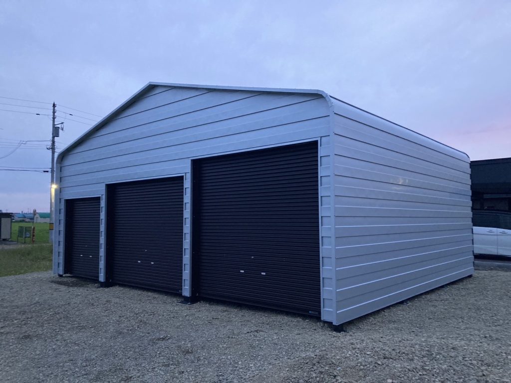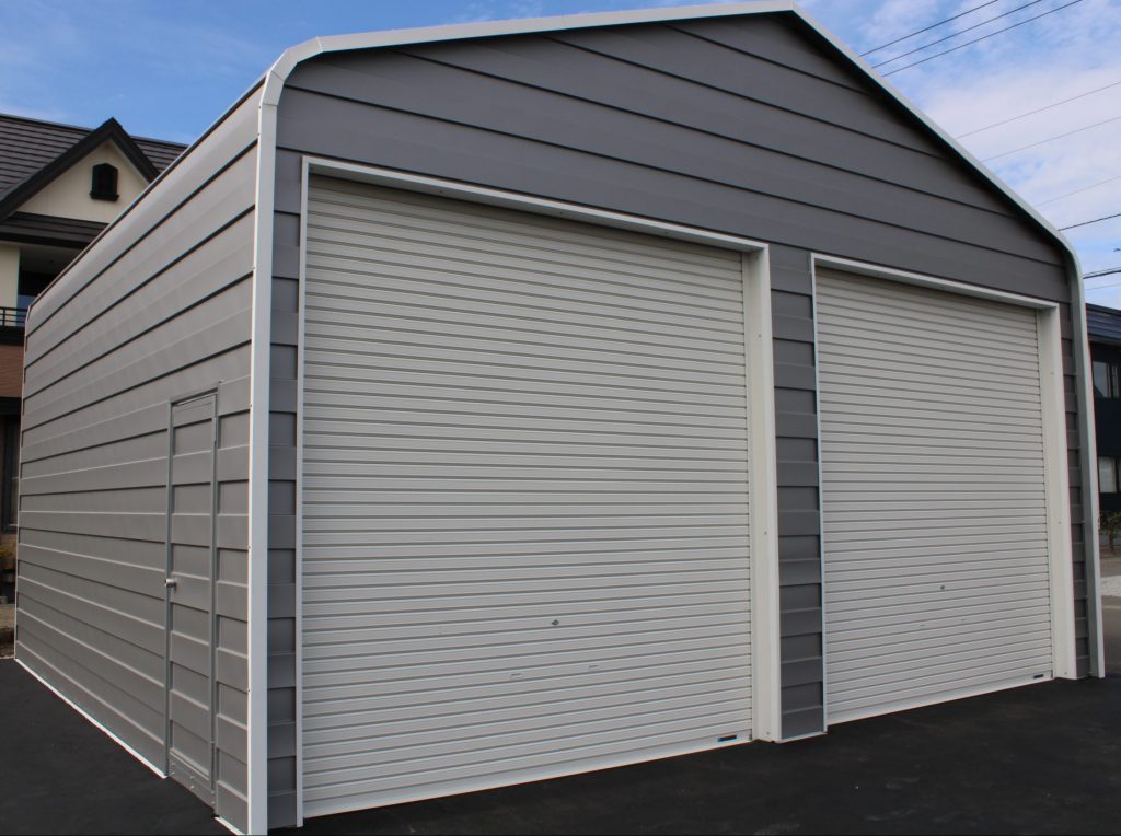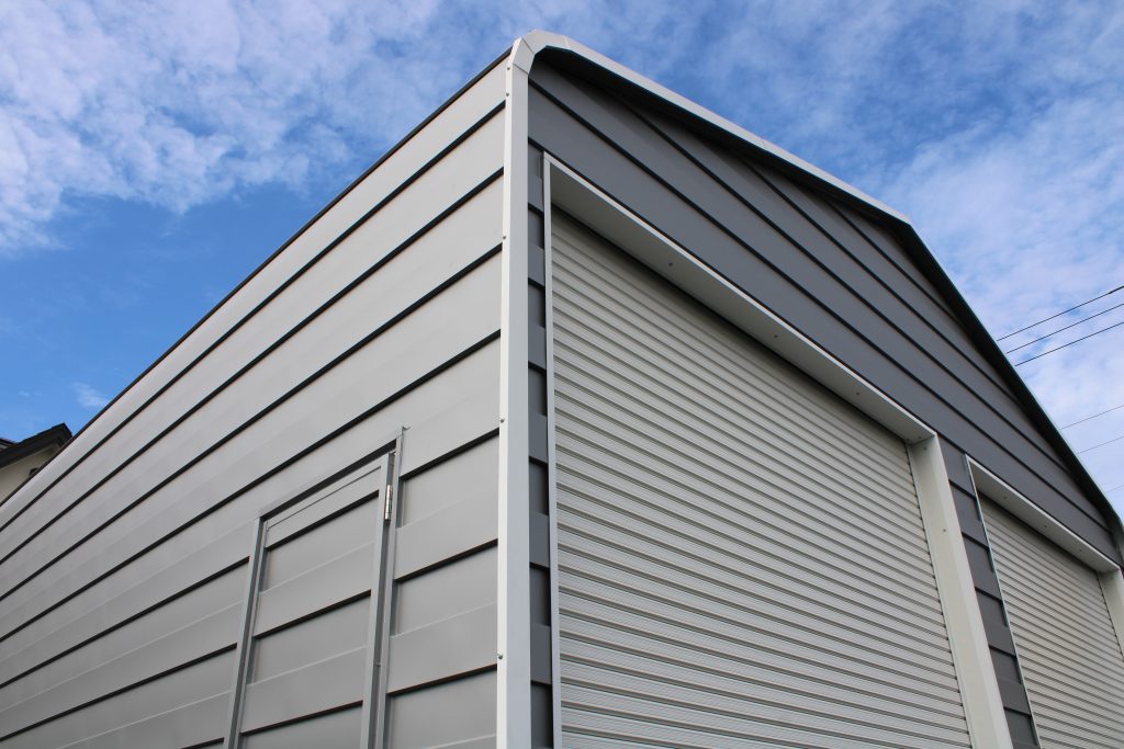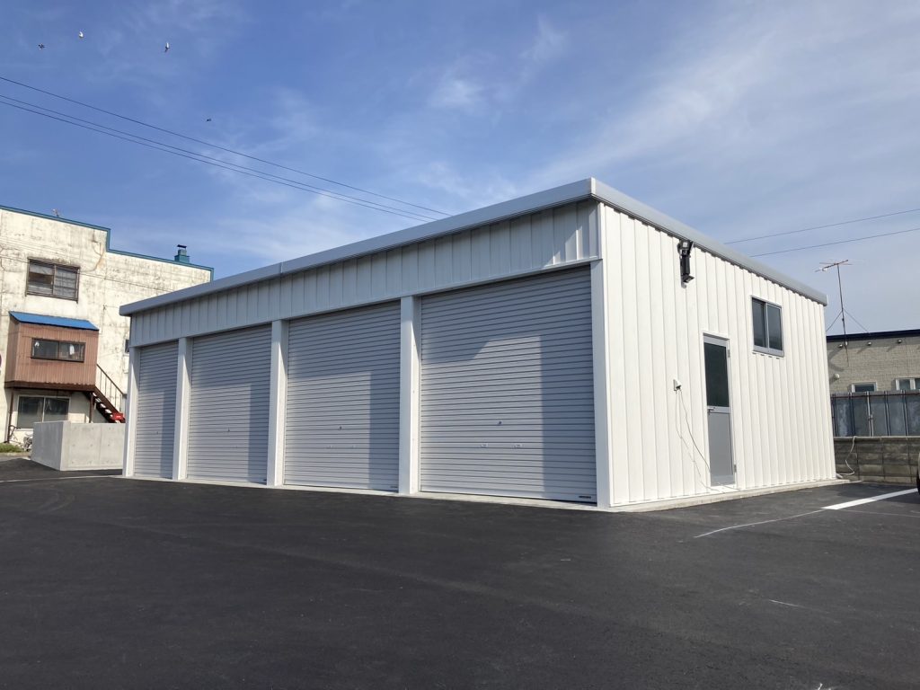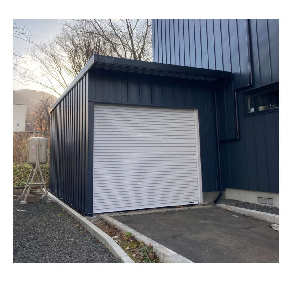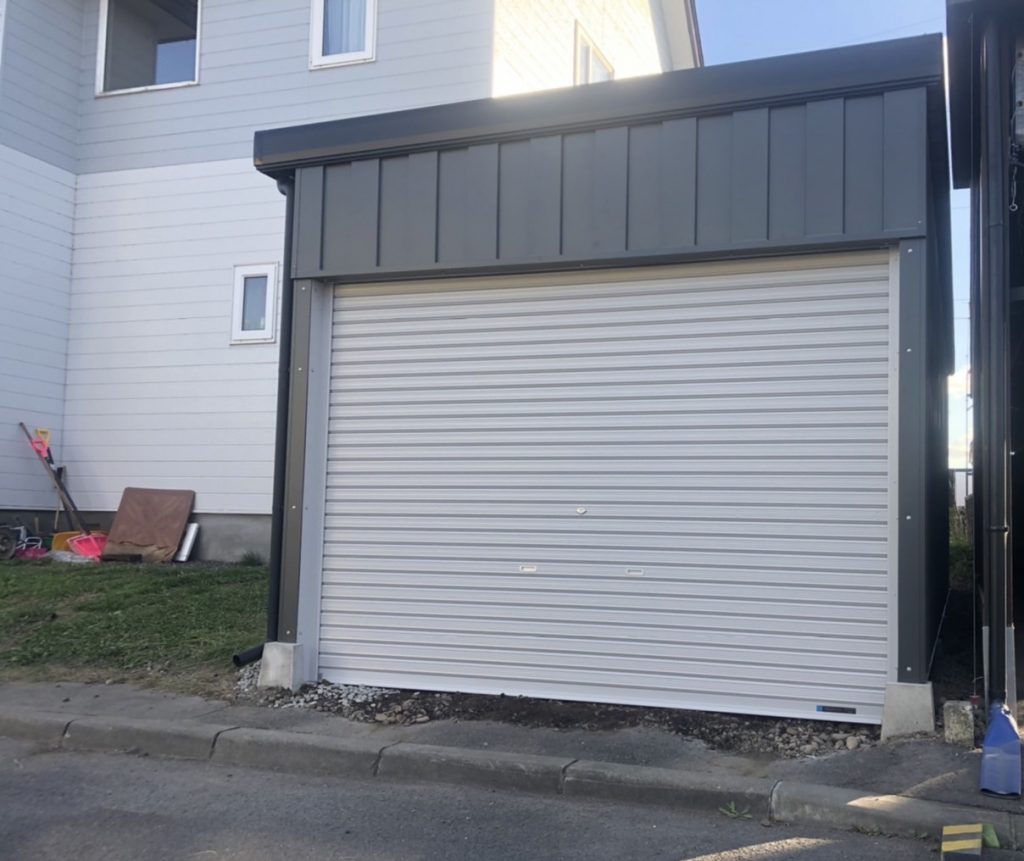 企業様敷地内施工ガレージ 鉄骨塗装色:グレー 外壁色:マットホワイト(縦) アルミ破風:シルバー シャッター:シルバーグレー ドレンパイプ:シルバー アルミドア:シルバー