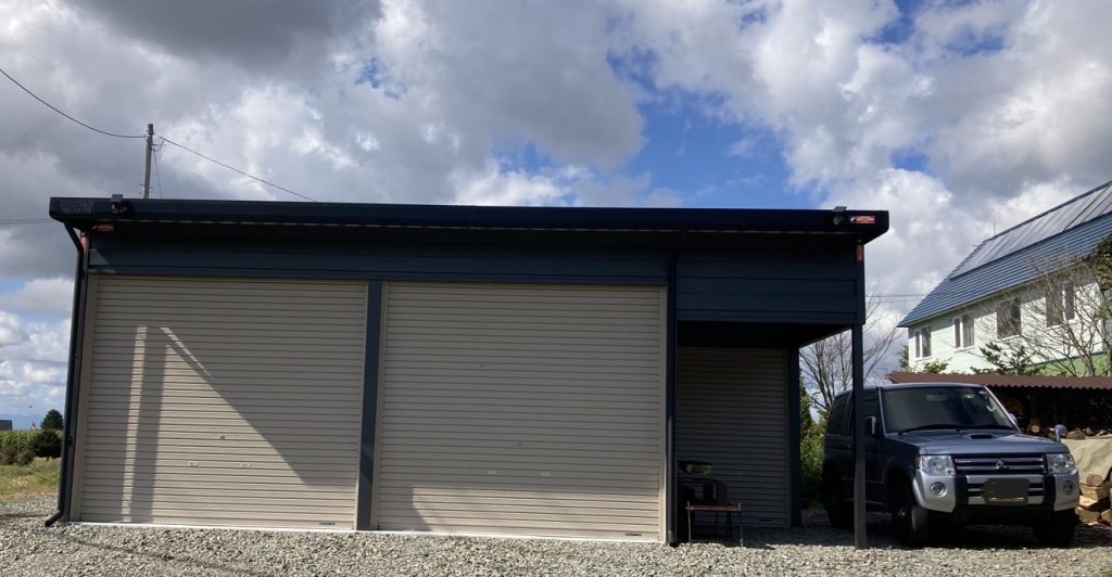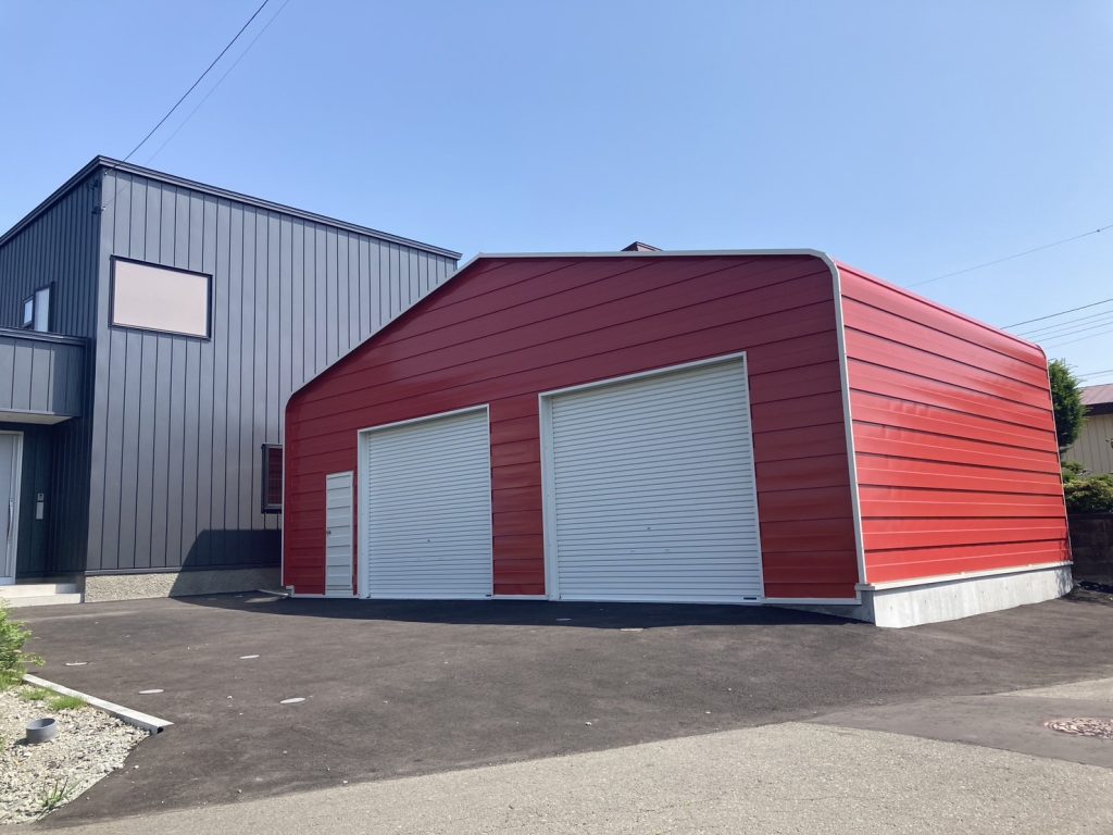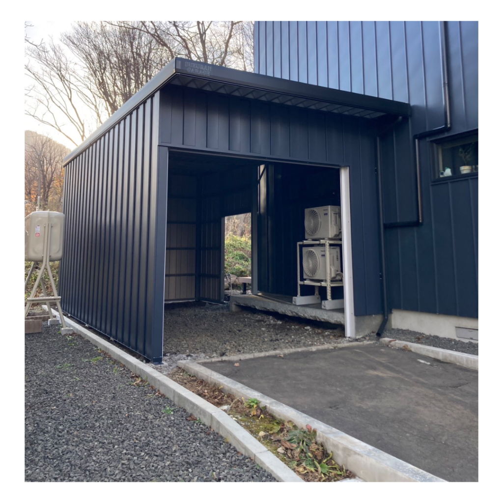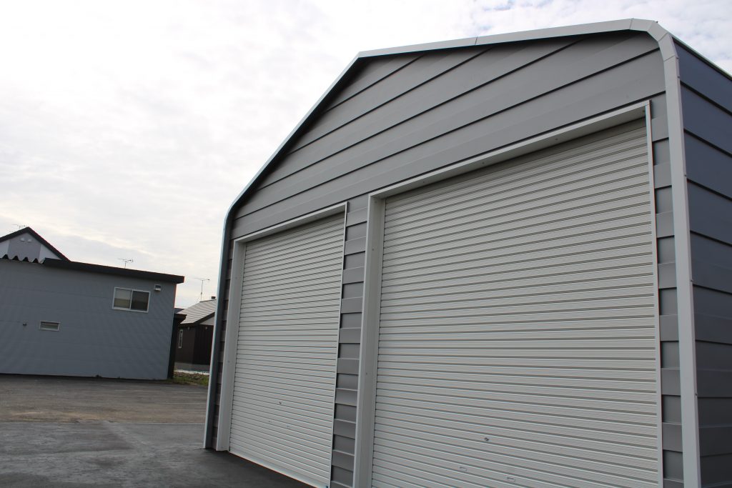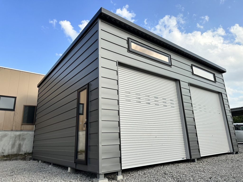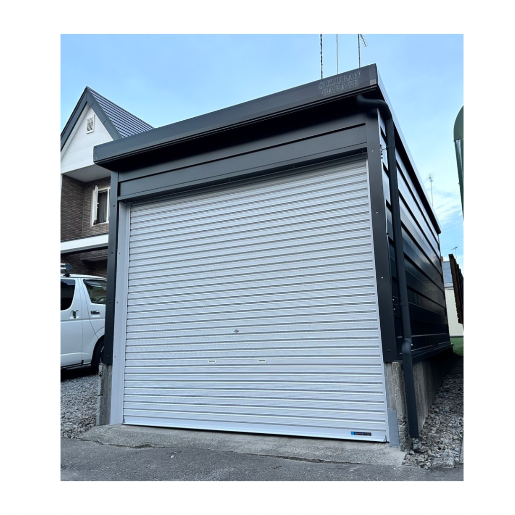 企業様敷地内施工ガレージ 鉄骨塗装色:グレー 外壁色:マットホワイト(縦) アルミ破風:シルバー シャッター:シルバーグレー ドレンパイプ:シルバー アルミドア:シルバー