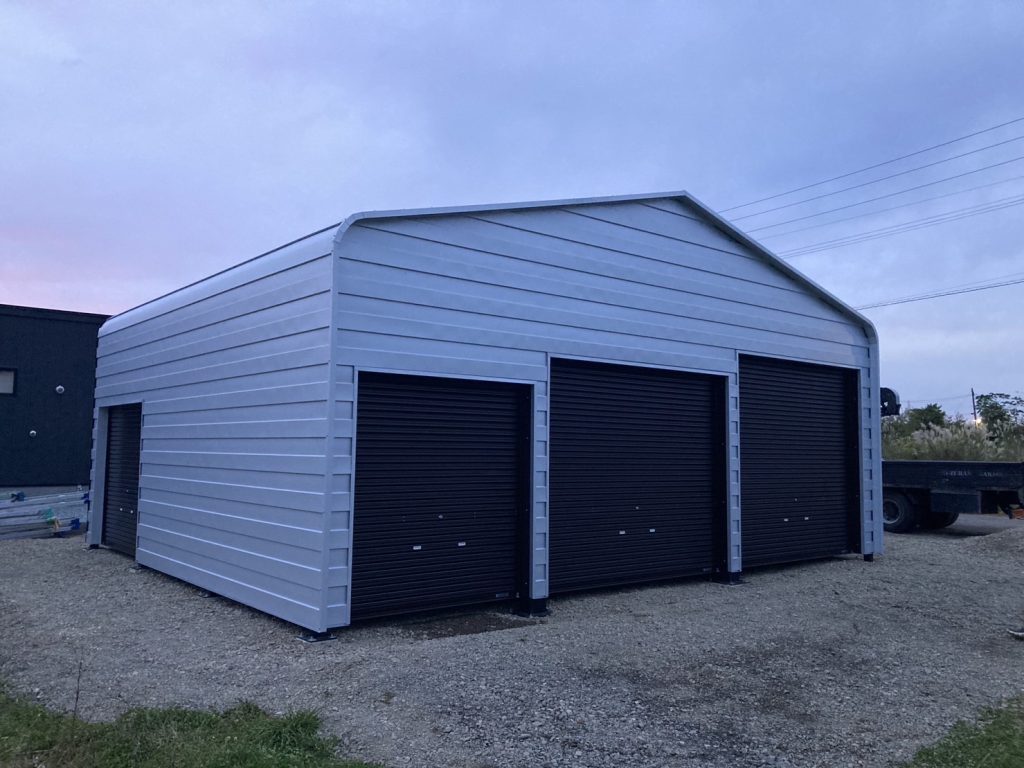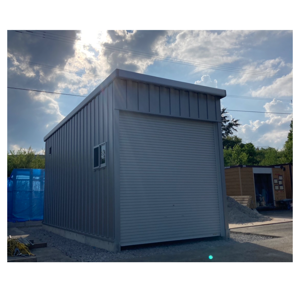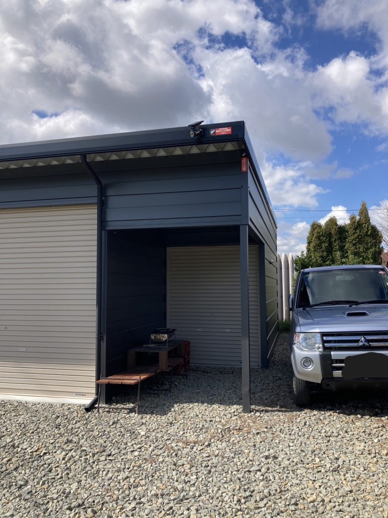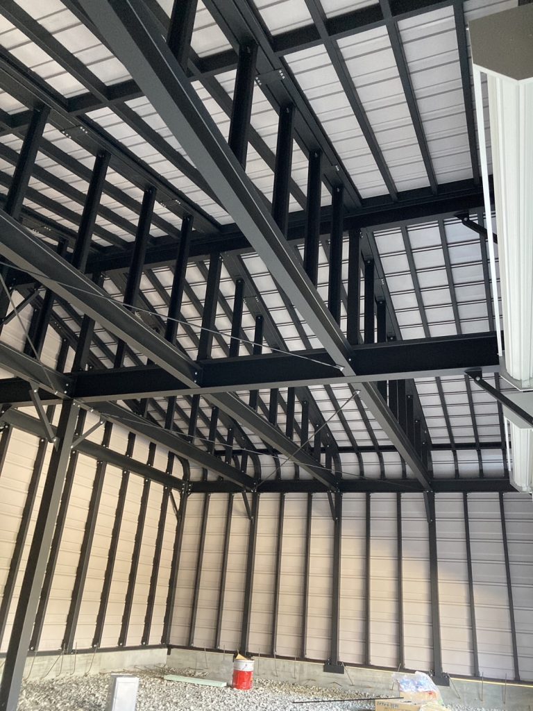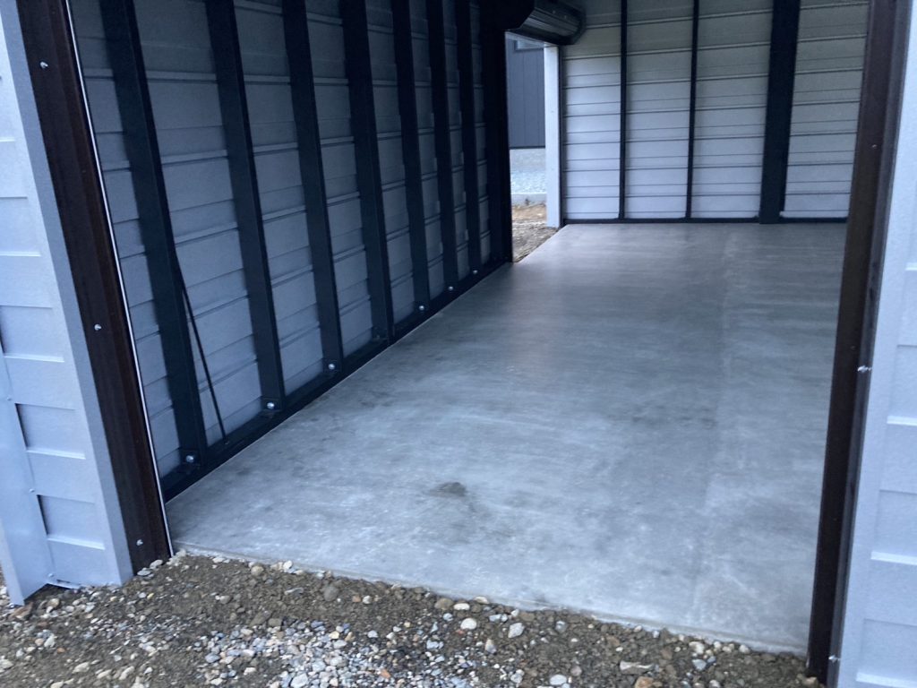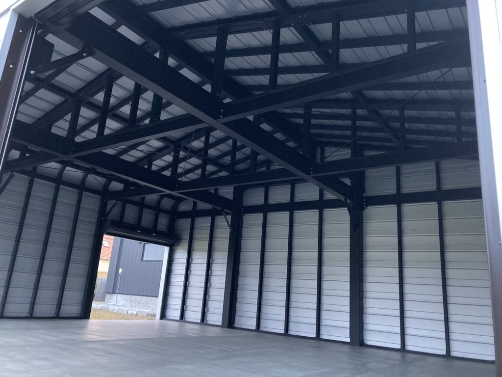企業様敷地内施工ガレージ 鉄骨塗装色:グレー 外壁色:マットホワイト(縦) アルミ破風:シルバー シャッター:シルバーグレー ドレンパイプ:シルバー アルミドア:シルバー