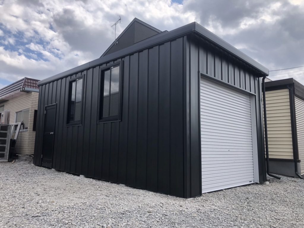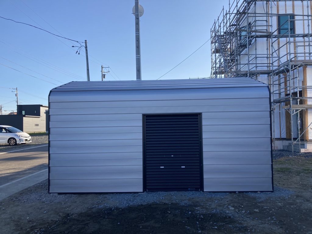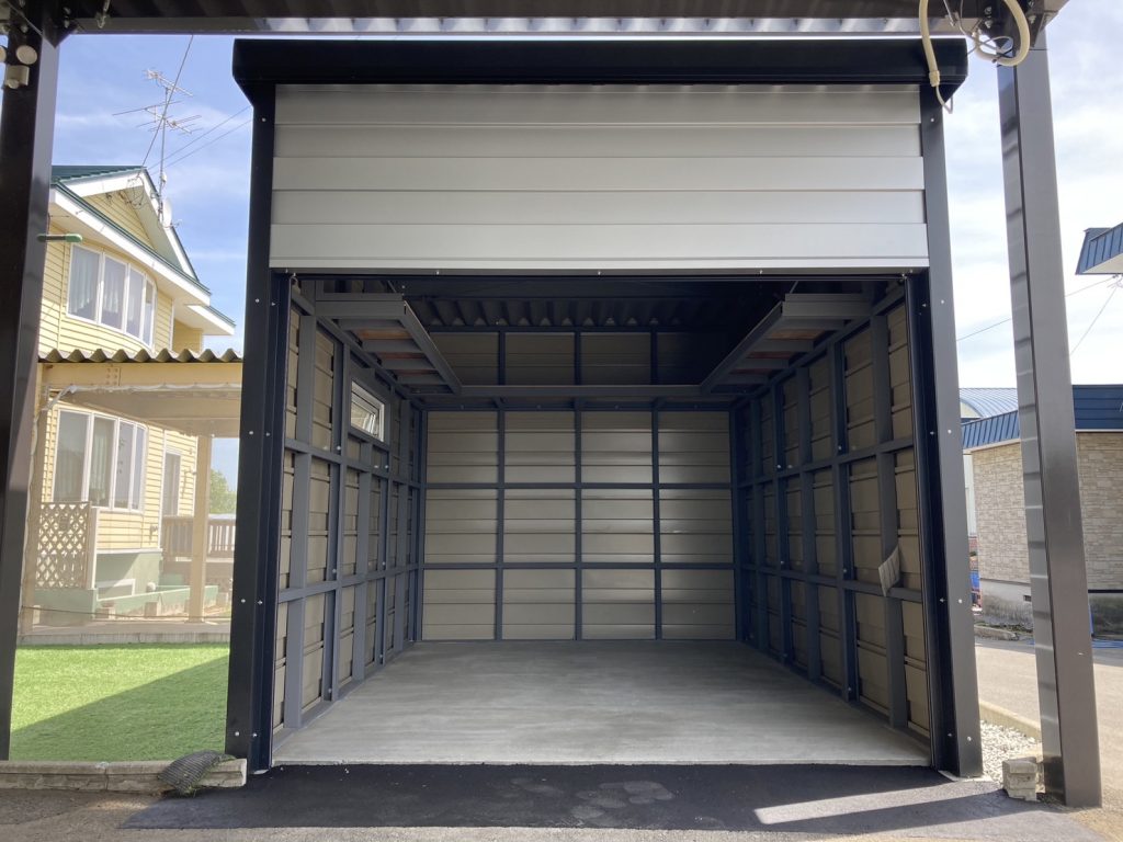 軽自動車用小さめUSA-G 鉄骨塗装色:ブラック 外壁色:シルバー(横) シャッター:ブラック