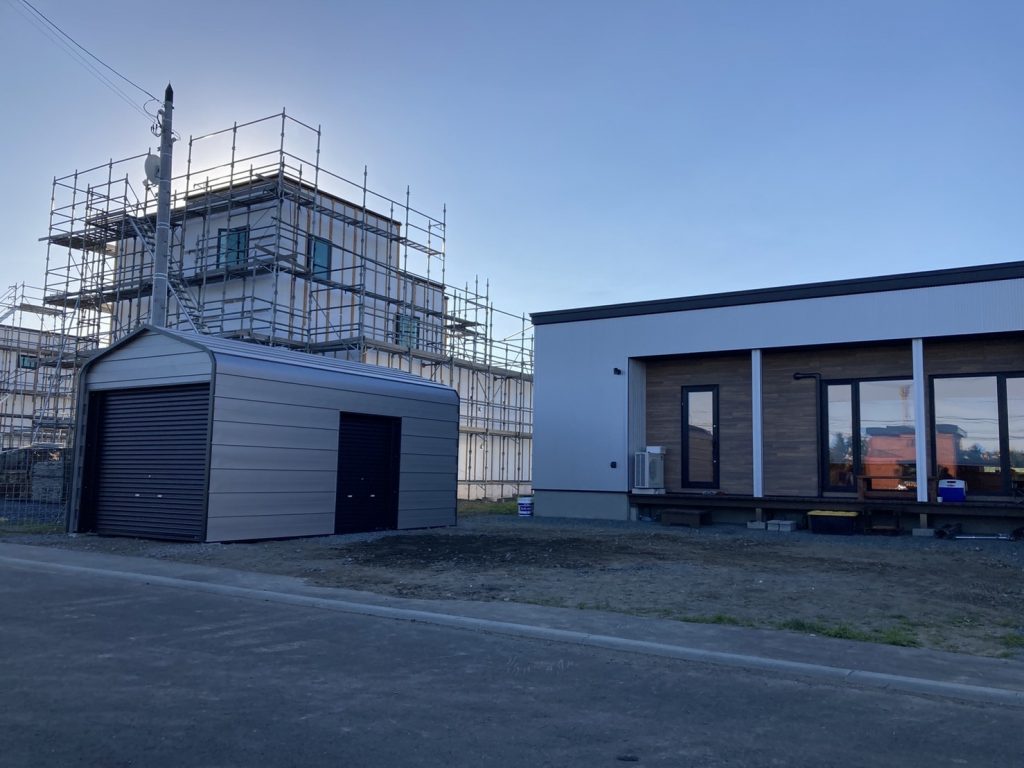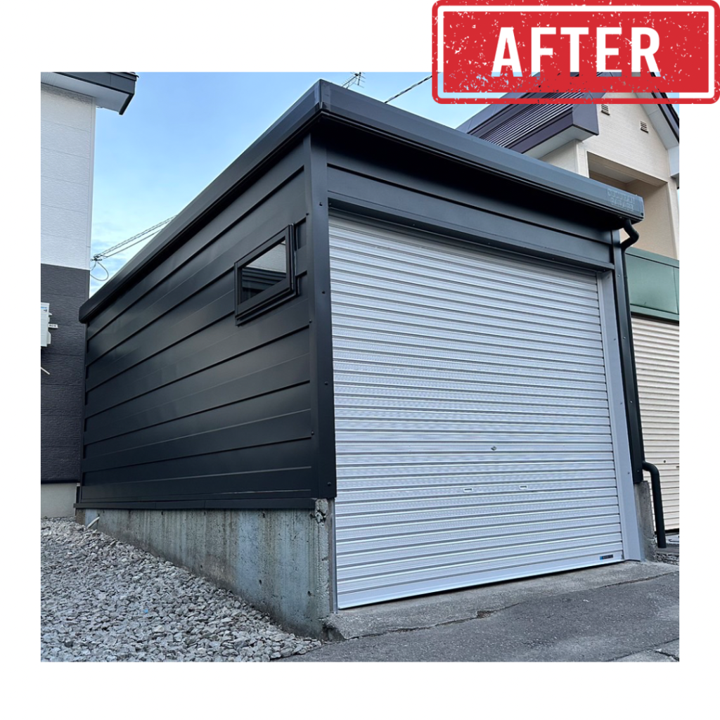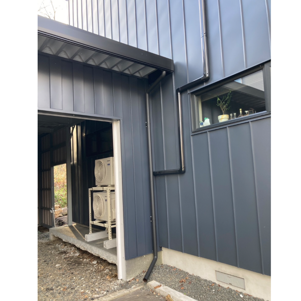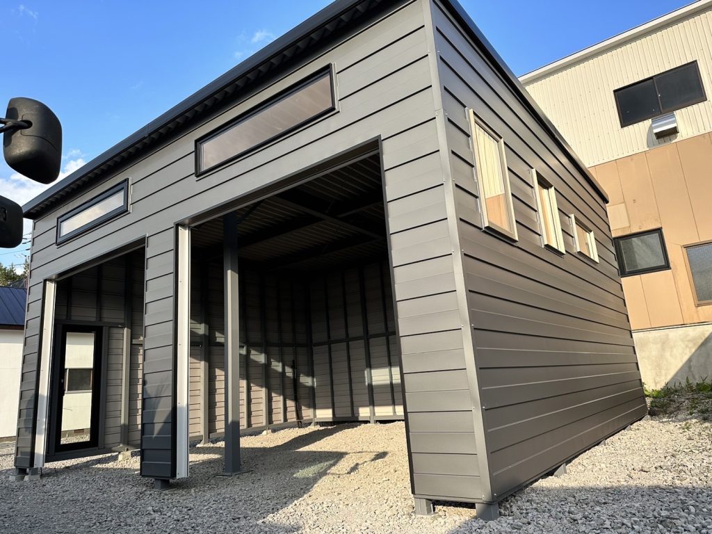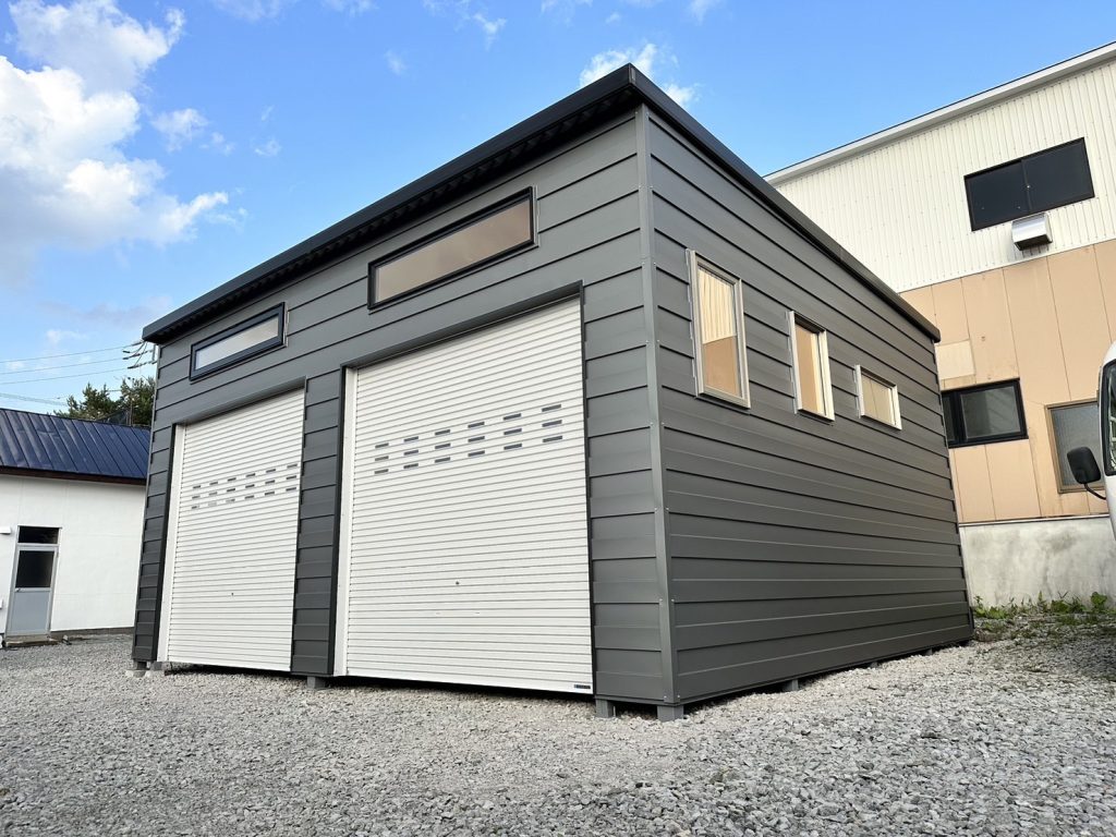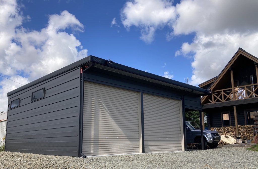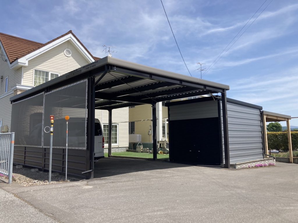 旭川施工 鉄骨塗装色:グレー 外壁色:ノアール(縦) アルミ破風:ブラック シャッター:シルバーグレー ドレンパイプ:ブラック アルミドア:ブラック