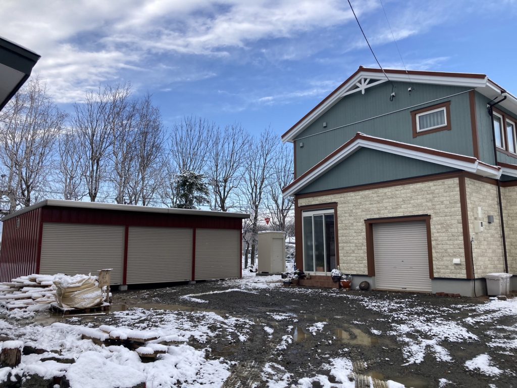 旭川施工 外壁色:グランドシルバー(横) アクセント:マットホワイト シャッター:シルキーホワイト アルミドア:外壁同様仕様