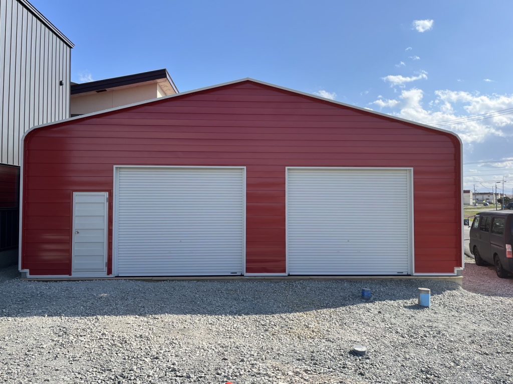 2台用スペース+フリースペースが3.6畳分!!特大アメリカンガレージ!! 鉄骨塗装色:ブラック 外壁色:レッド(横) シャッター:シルキーホワイト アルミドア(外壁材使用):ホワイトアイボリー