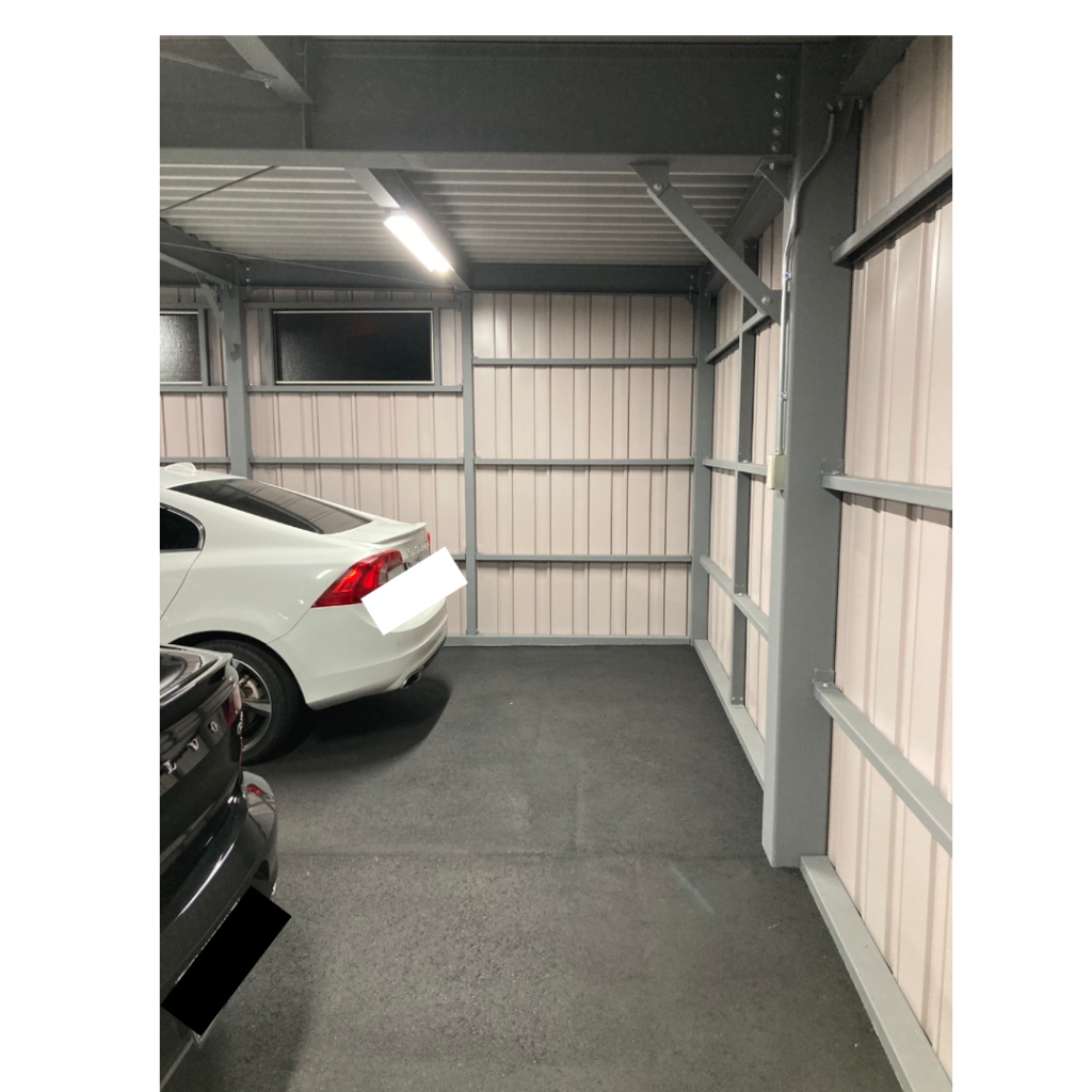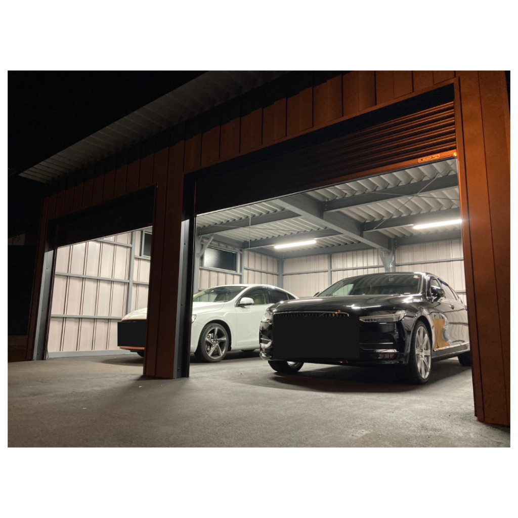 特注2台用ガレージ!!!中柱がないタイプなので広々とした空間になっています。 鉄骨塗装色:グレー 外壁色:サンドブラック(縦) アルミ破風:ブラック シャッター:ブラック(特注色) ドレンパイプ:ブラック アルミドア:ブラック(上下パネル) 窓枠:ブラック 換気扇 外注:電気工事