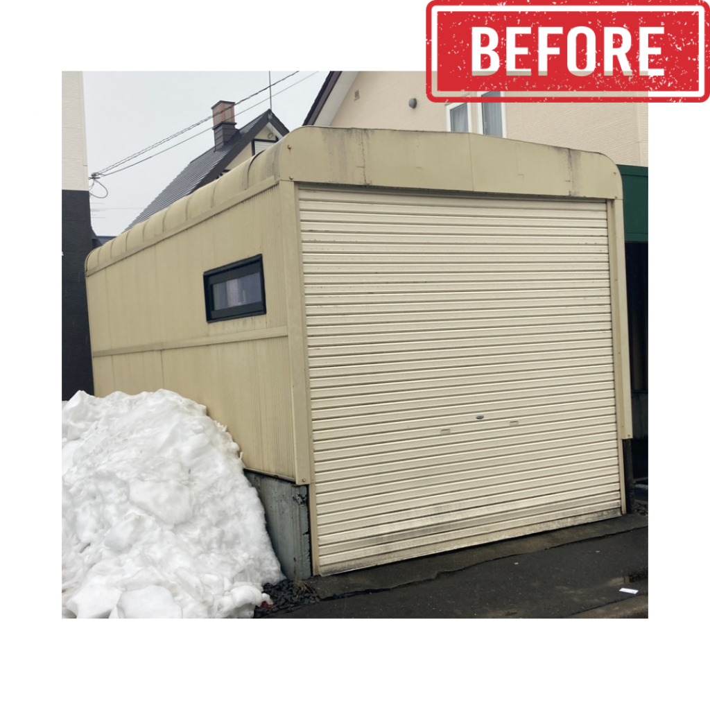 既存の布基礎を使用してガレージ建替!!!塗料保管庫に使用するため棚を設置しています。