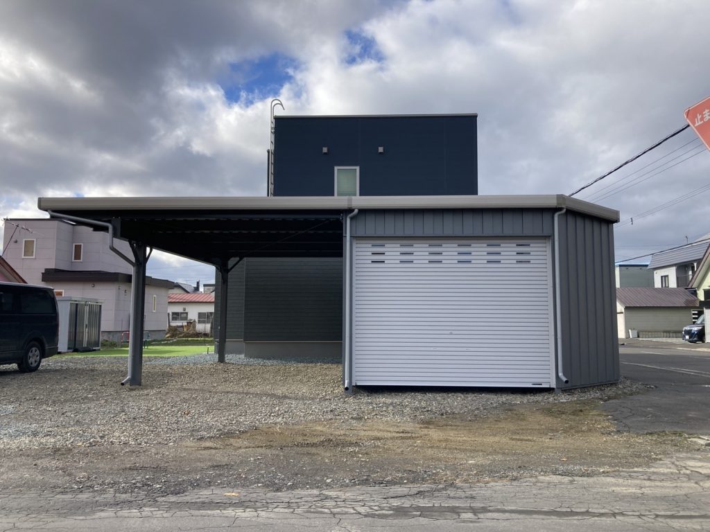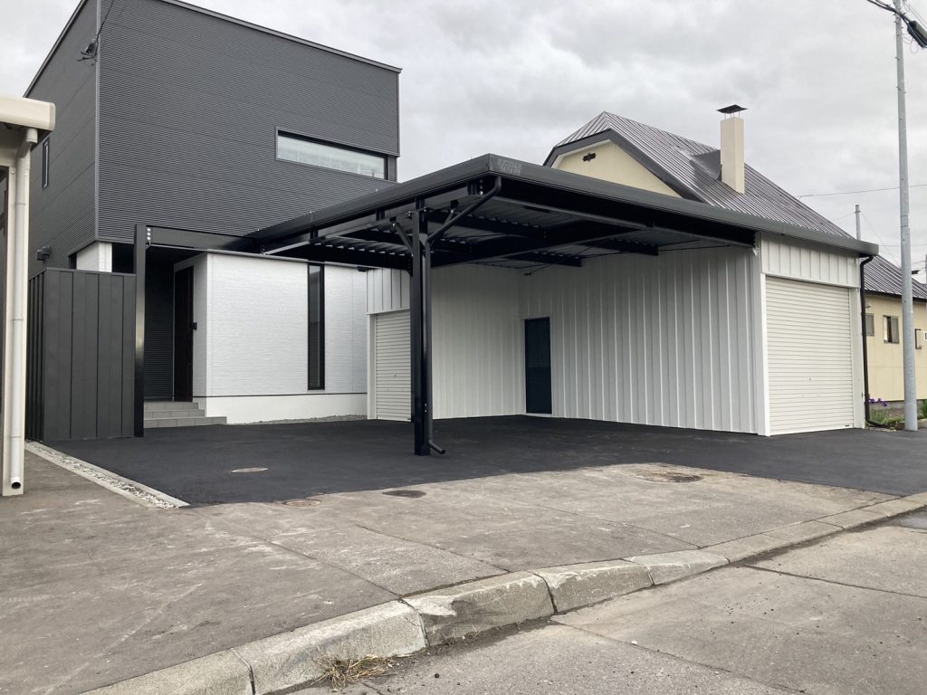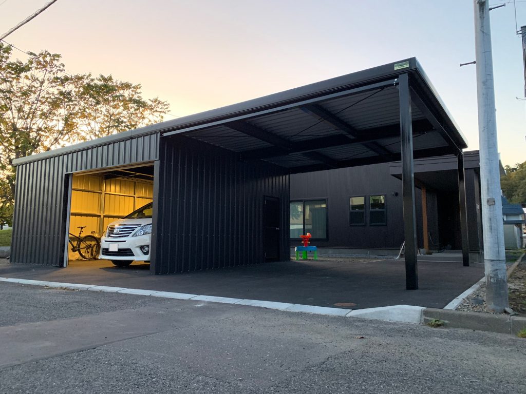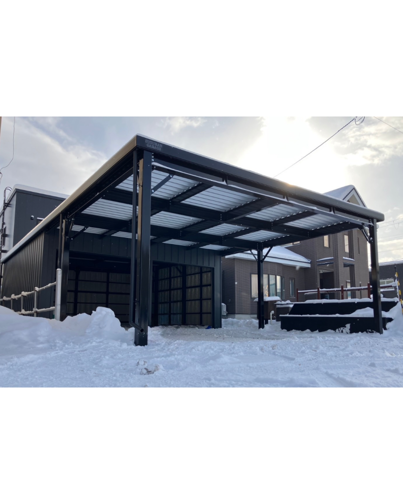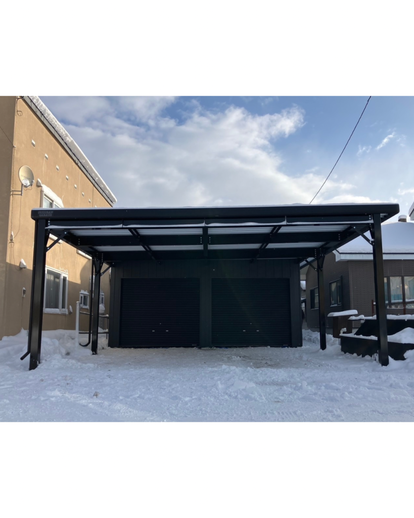 旭川施工 片袖付き1台用+ガレージ2台用カーポート 鉄骨塗装色:ブラック 外壁色(旧材):ブラック(縦) アルミ破風:ブラック シャッター:ホワイト ドレンパイプ:ブラック