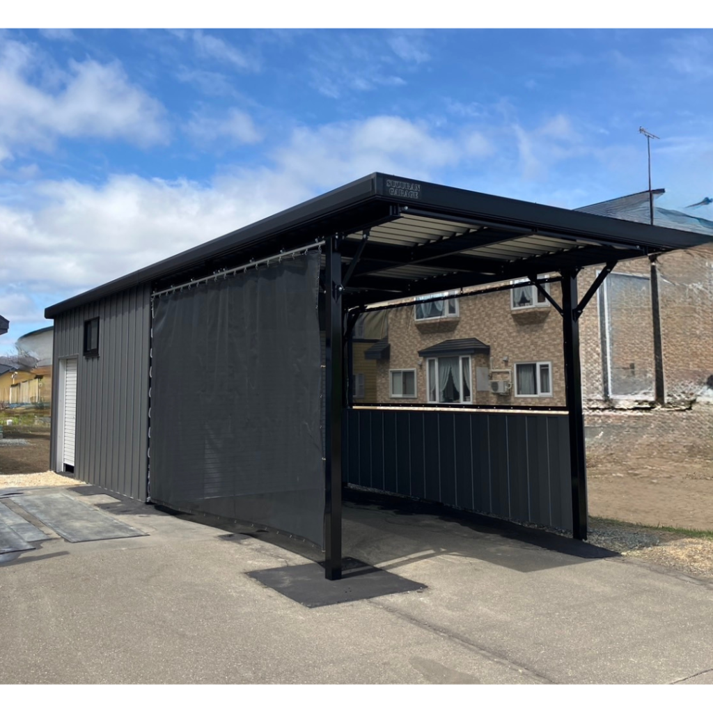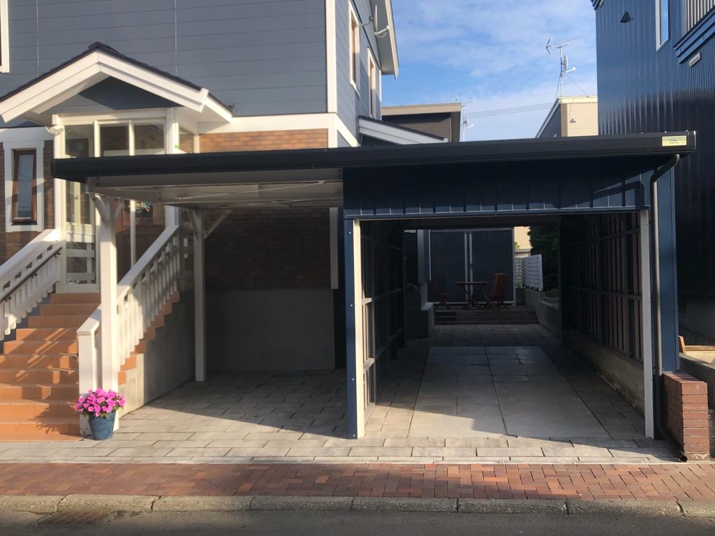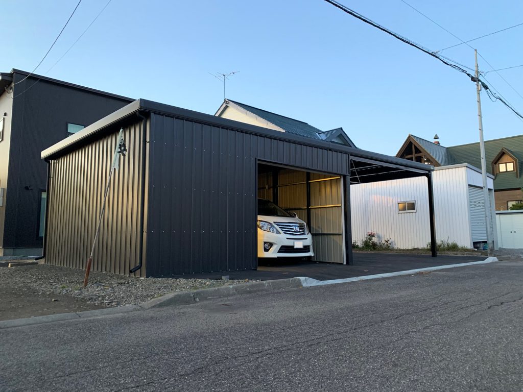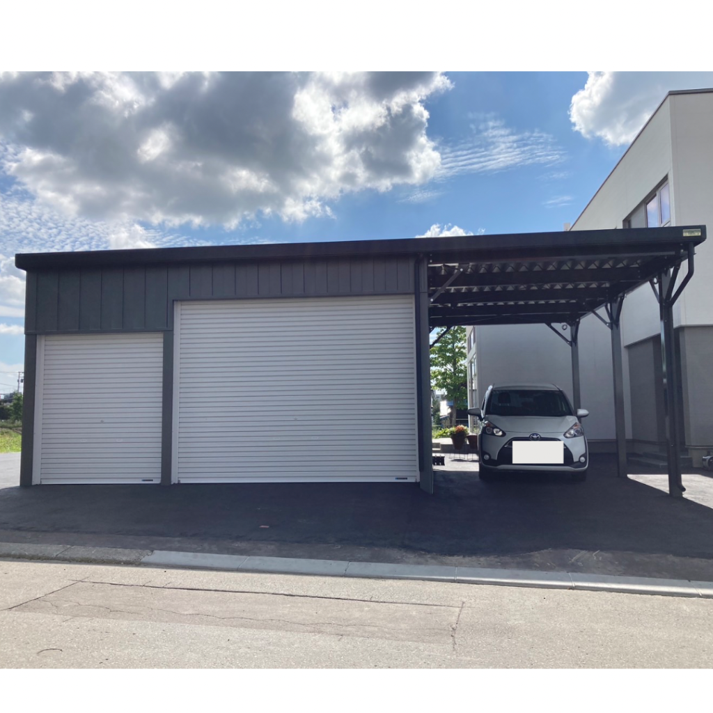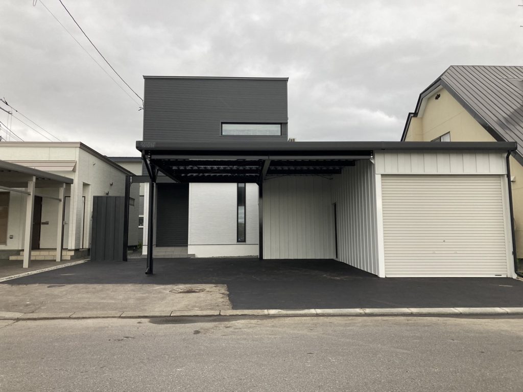旭川施工 片袖付き1台用+ガレージ2台用カーポート 鉄骨塗装色:ブラック 外壁色(旧材):ブラック(縦) アルミ破風:ブラック シャッター:ホワイト ドレンパイプ:ブラック