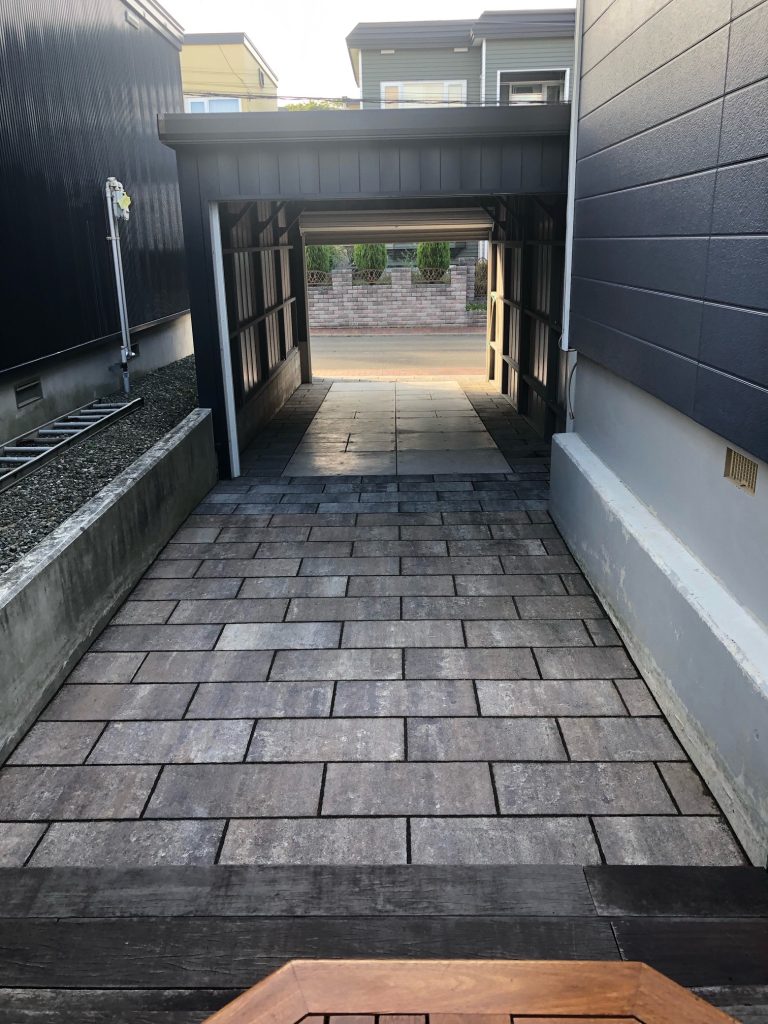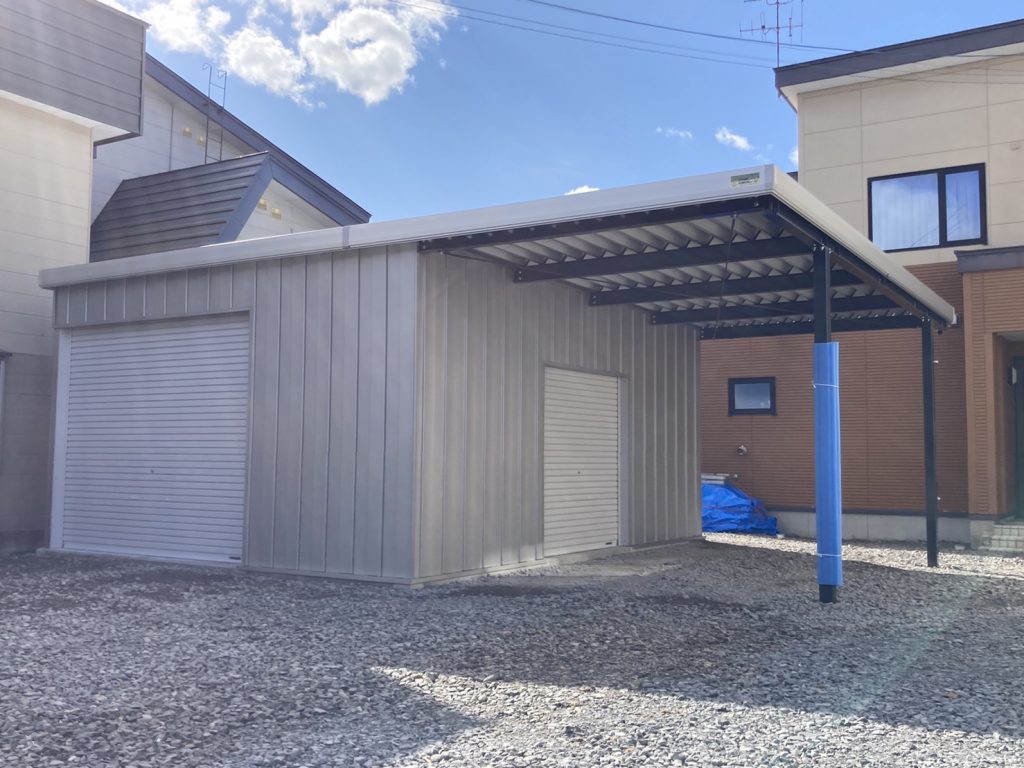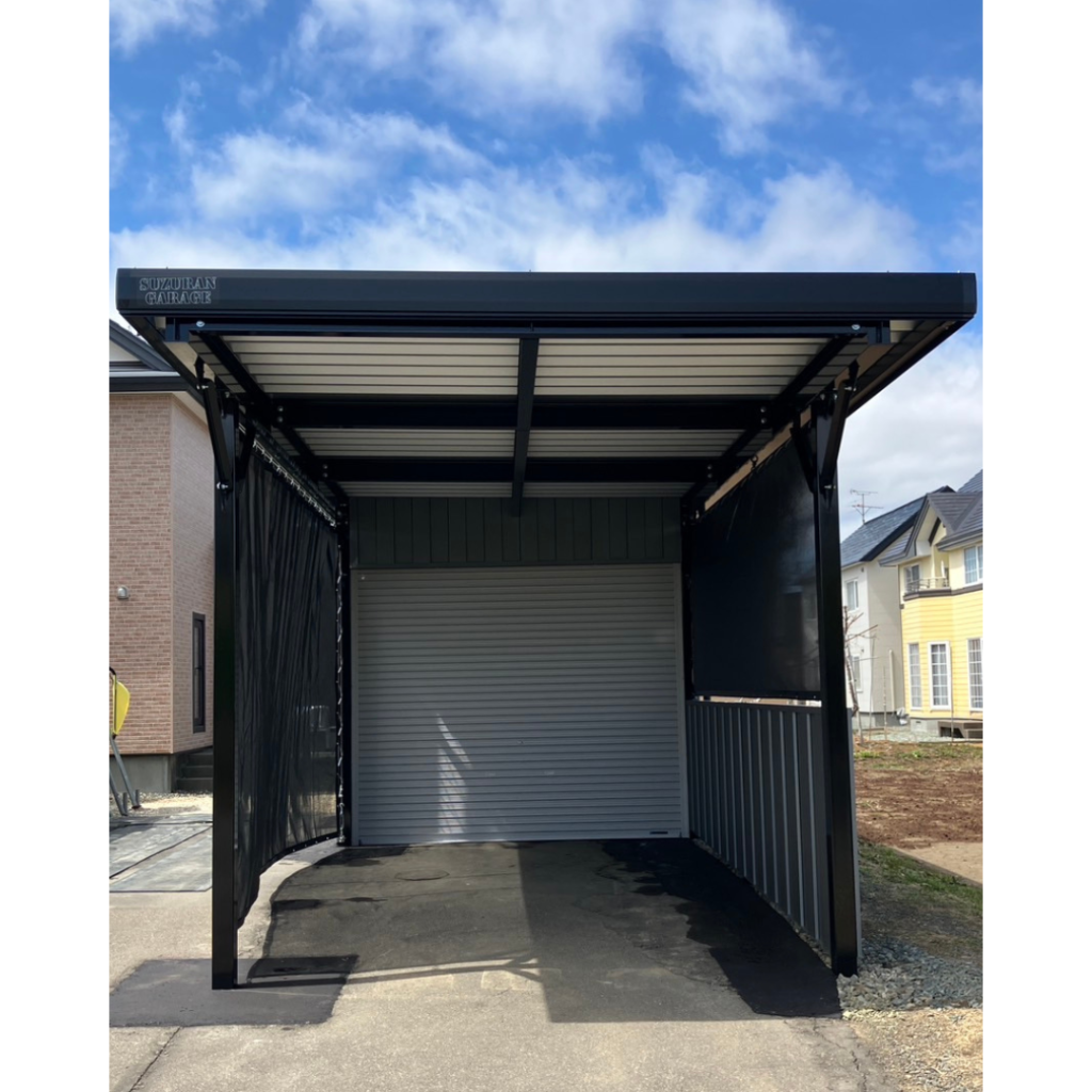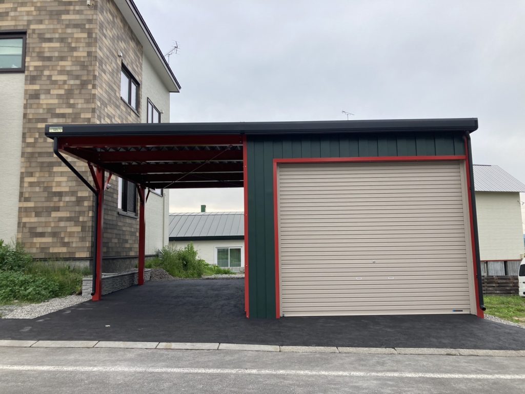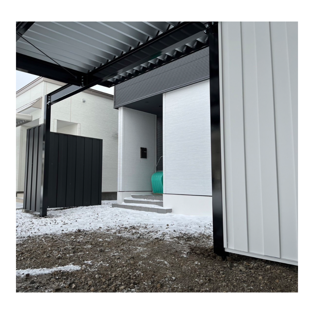 旭川施工 片袖付き1台用+ガレージ2台用カーポート 鉄骨塗装色:ブラック 外壁色(旧材):ブラック(縦) アルミ破風:ブラック シャッター:ホワイト ドレンパイプ:ブラック
