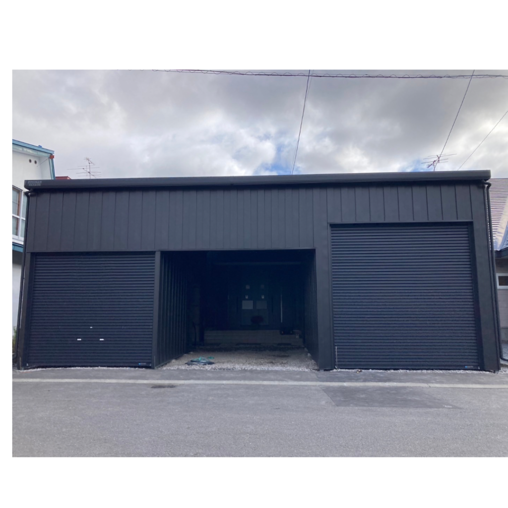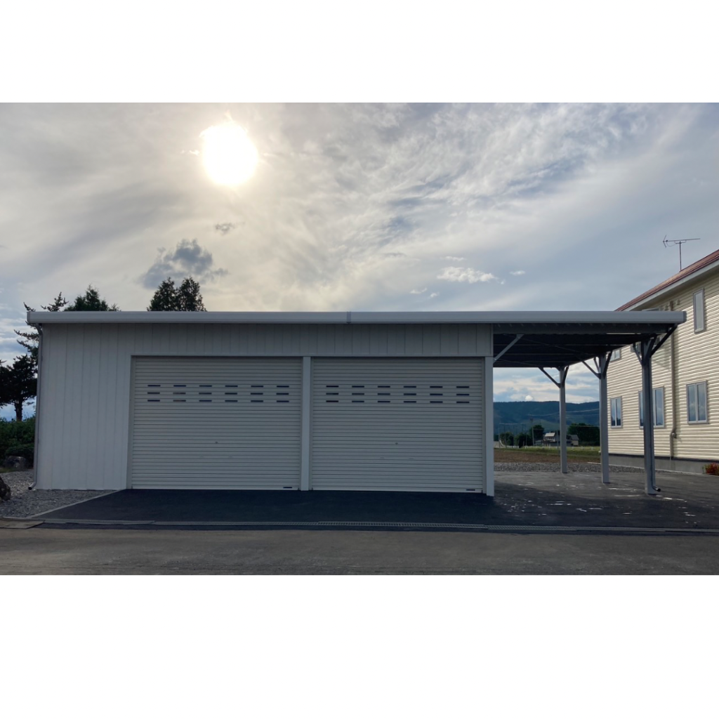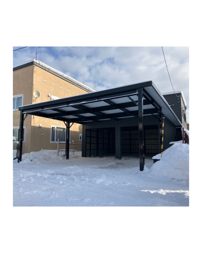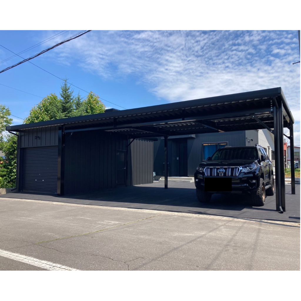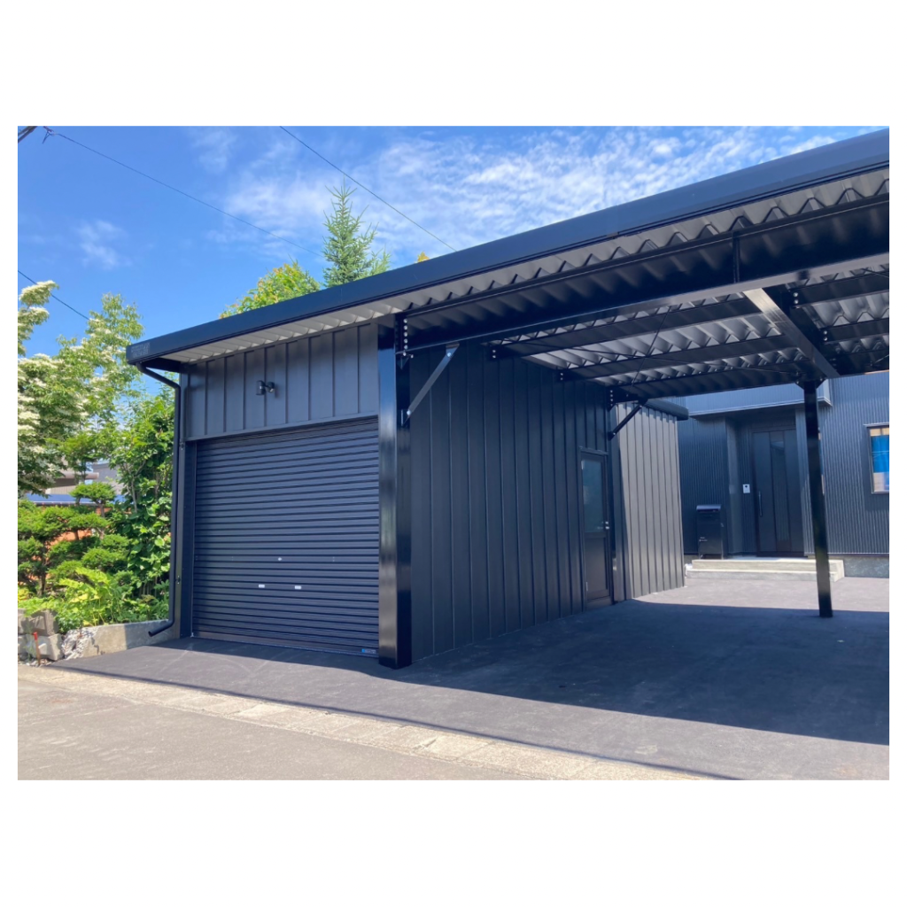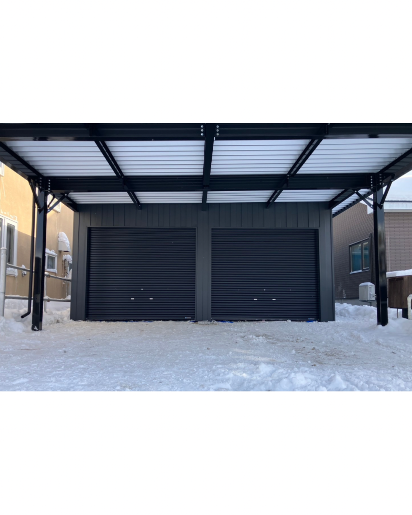 士別施工 鉄車両入庫可能用サイズの大型収納庫 正面からは車両、後部からは除雪が出せるように2連シャッター付 通常入口として屋根下側面にお子さんでも軽々開閉できる片引き戸使用。 カーポートは士別の豪雪にも耐える強鋼仕様。 カラーは重厚感あるブラック 骨塗装色:ブラック 外壁色:ブラック(縦) アルミ破風:ブラック シャッター:ペールベージュ採光窓あり ドレンパイプ:黒ブラック 横入口片引き戸:上曇り硝子下パネル