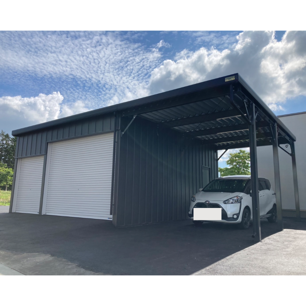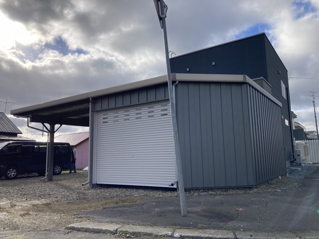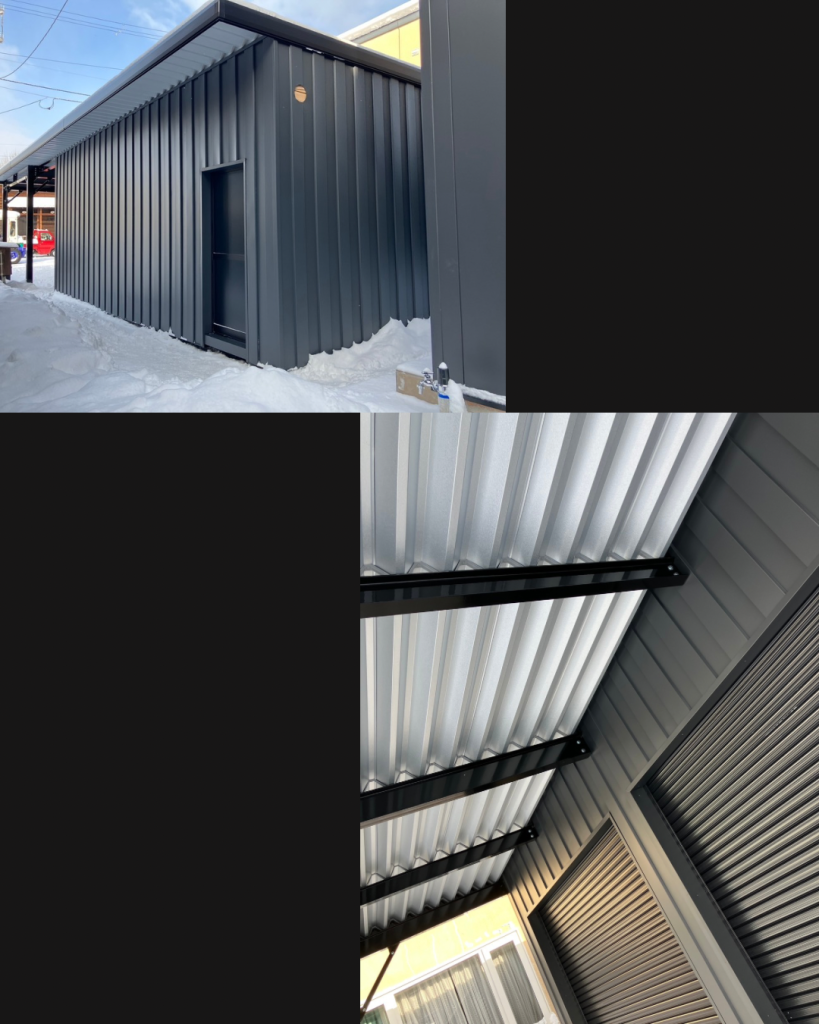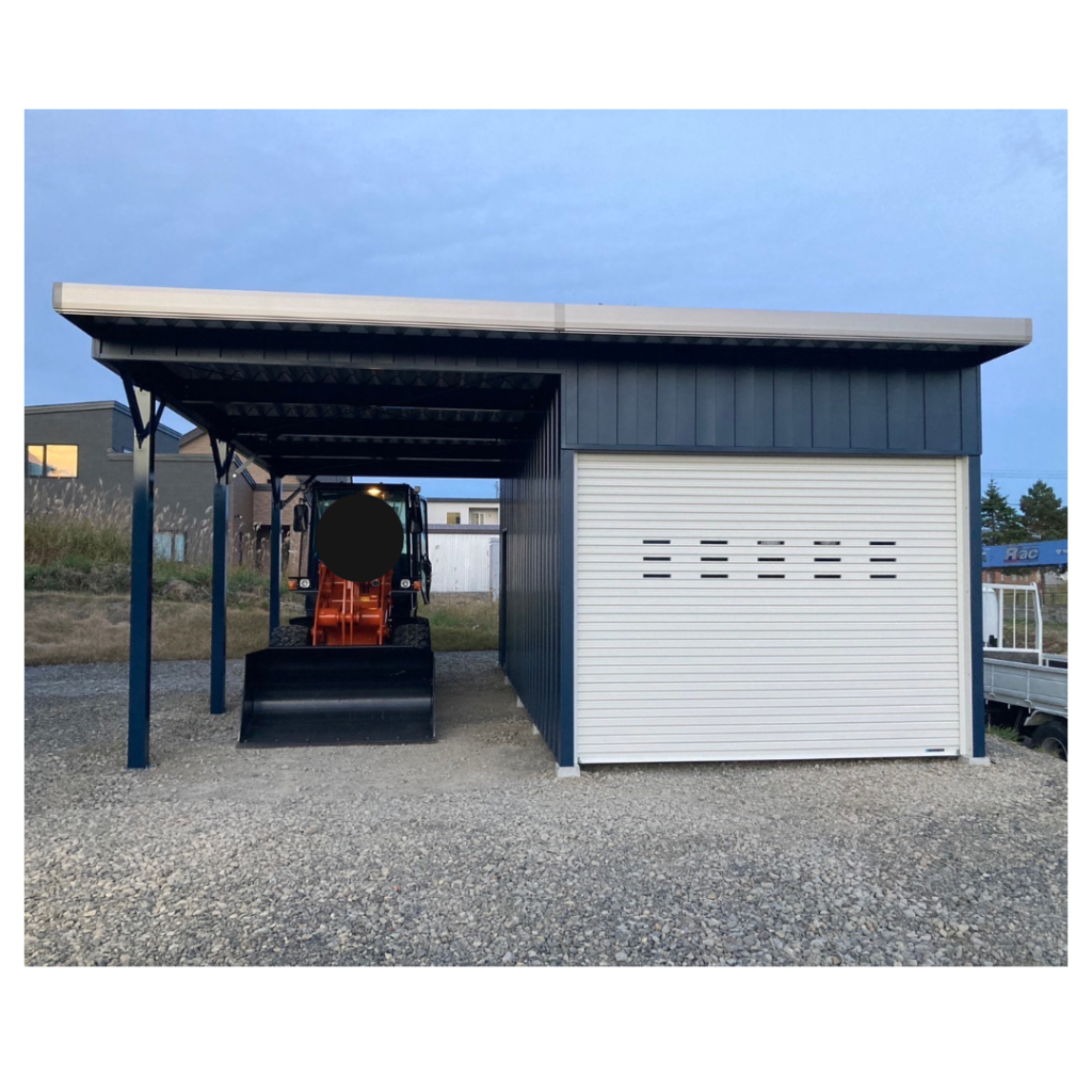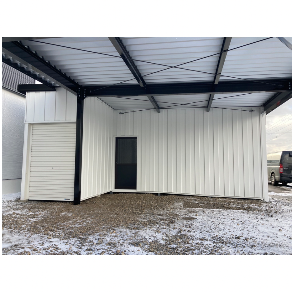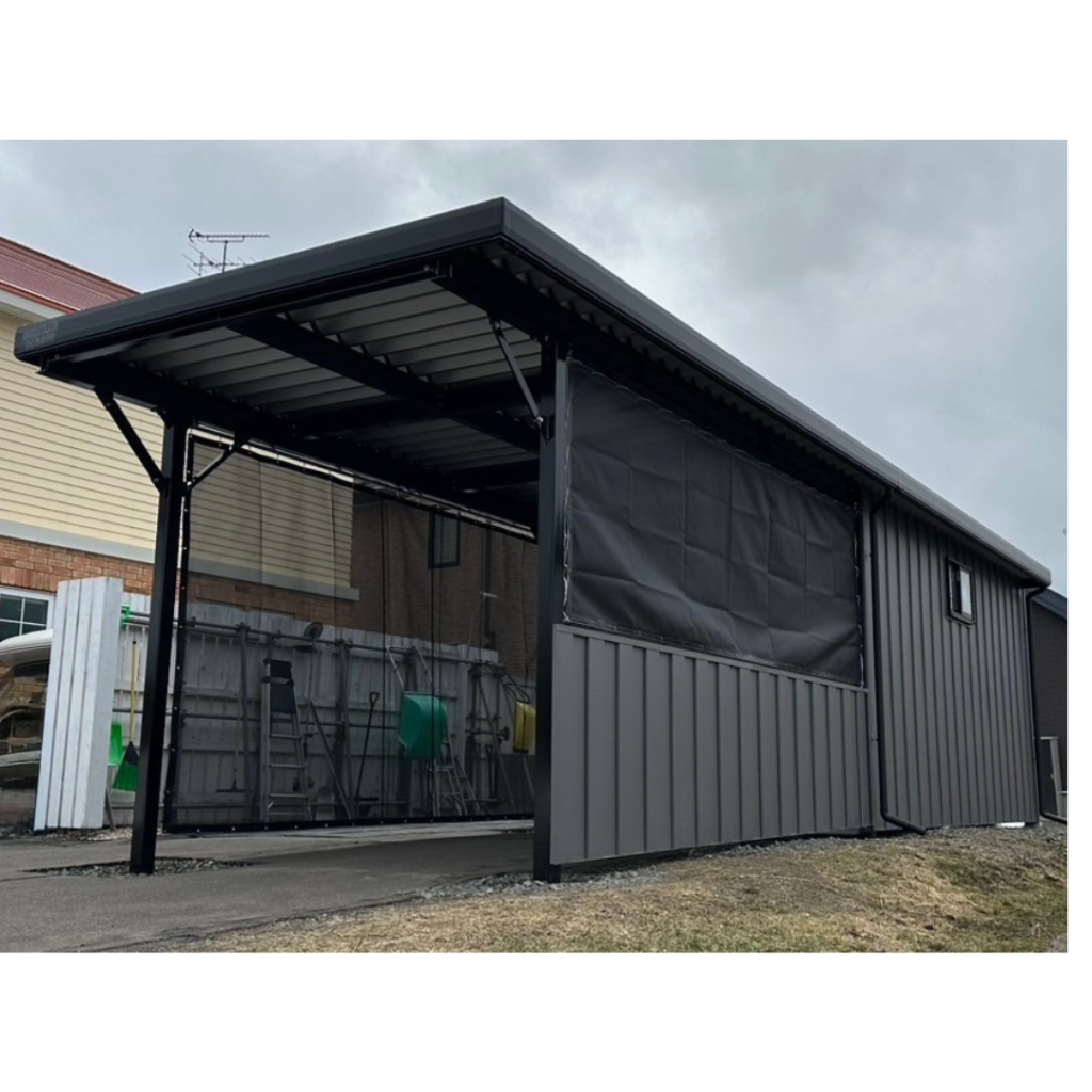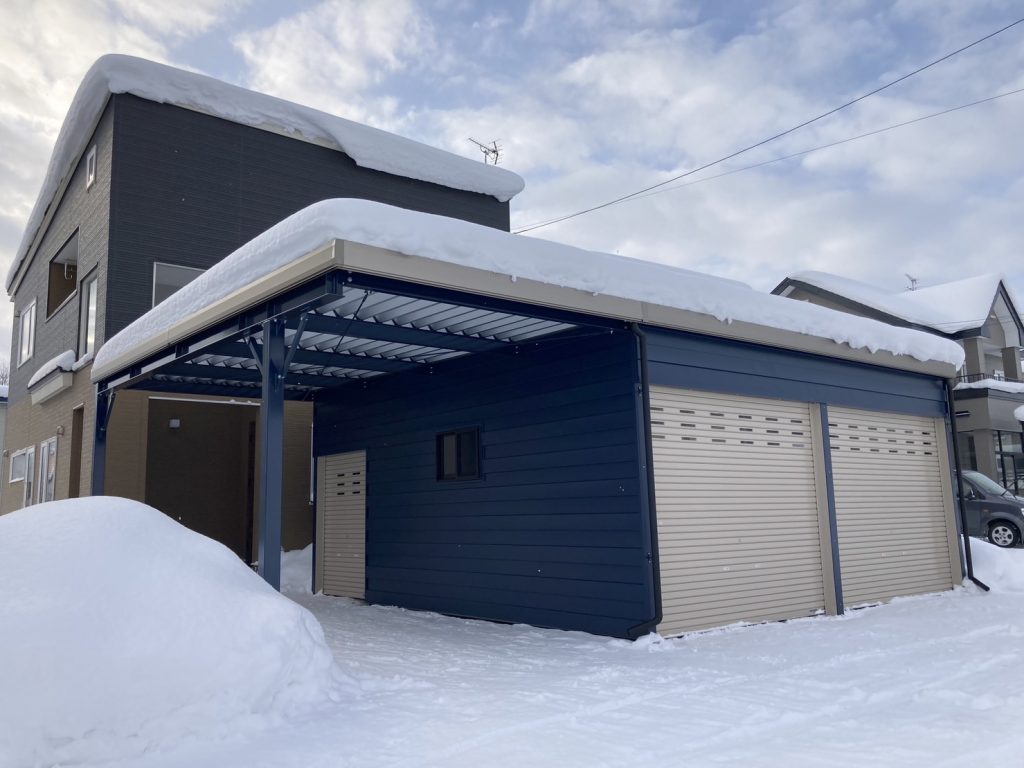 士別施工 鉄車両入庫可能用サイズの大型収納庫 正面からは車両、後部からは除雪が出せるように2連シャッター付 通常入口として屋根下側面にお子さんでも軽々開閉できる片引き戸使用。 カーポートは士別の豪雪にも耐える強鋼仕様。 カラーは重厚感あるブラック 骨塗装色:ブラック 外壁色:ブラック(縦) アルミ破風:ブラック シャッター:ペールベージュ採光窓あり ドレンパイプ:黒ブラック 横入口片引き戸:上曇り硝子下パネル