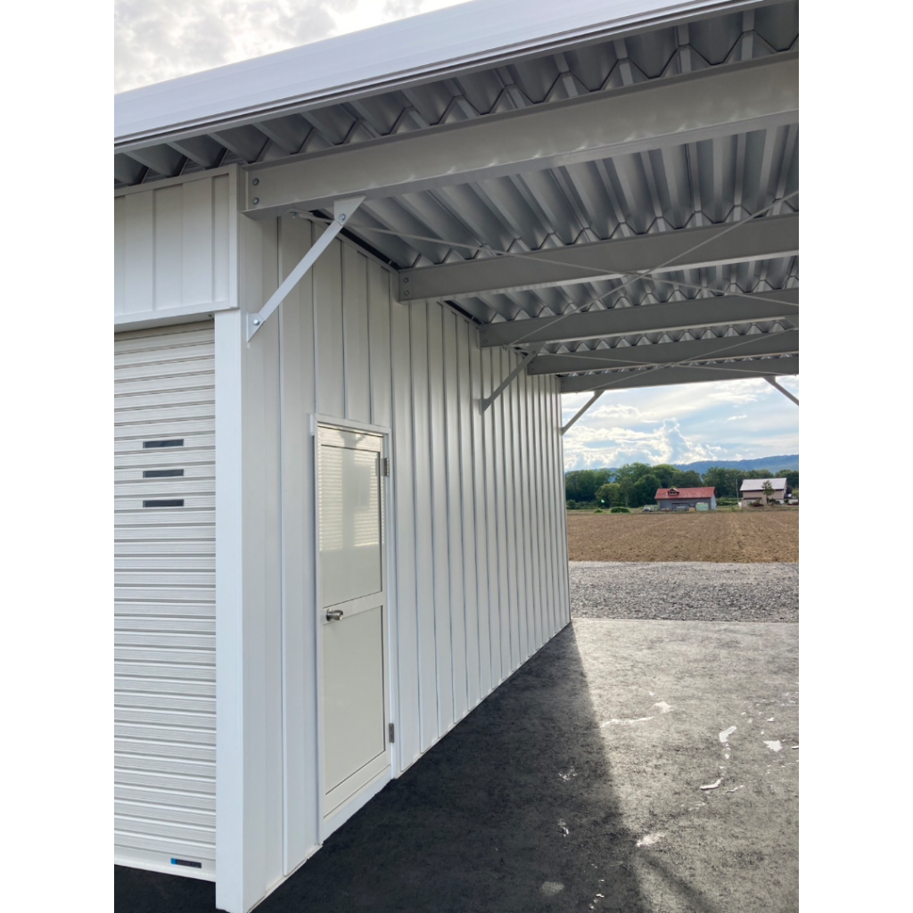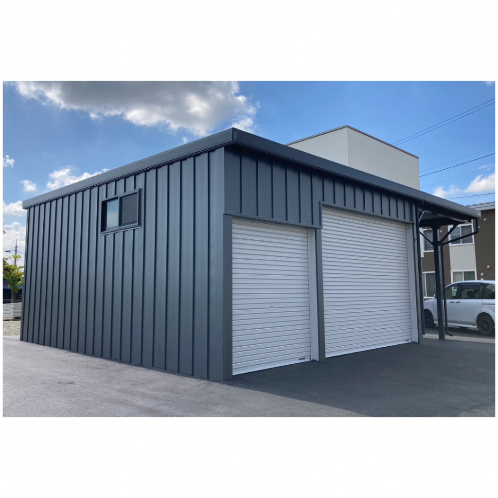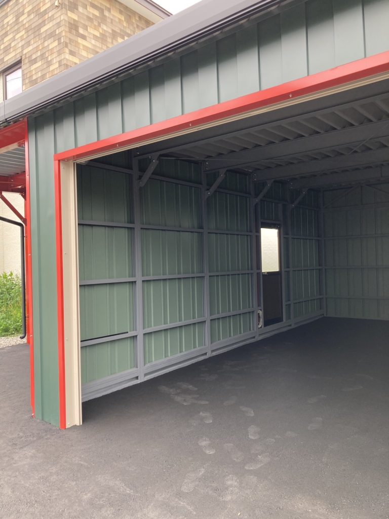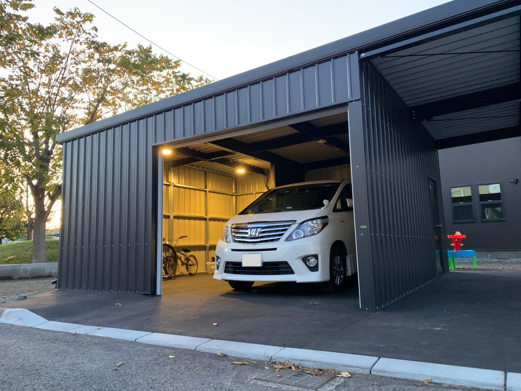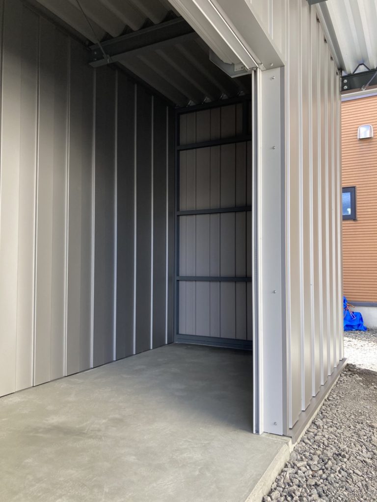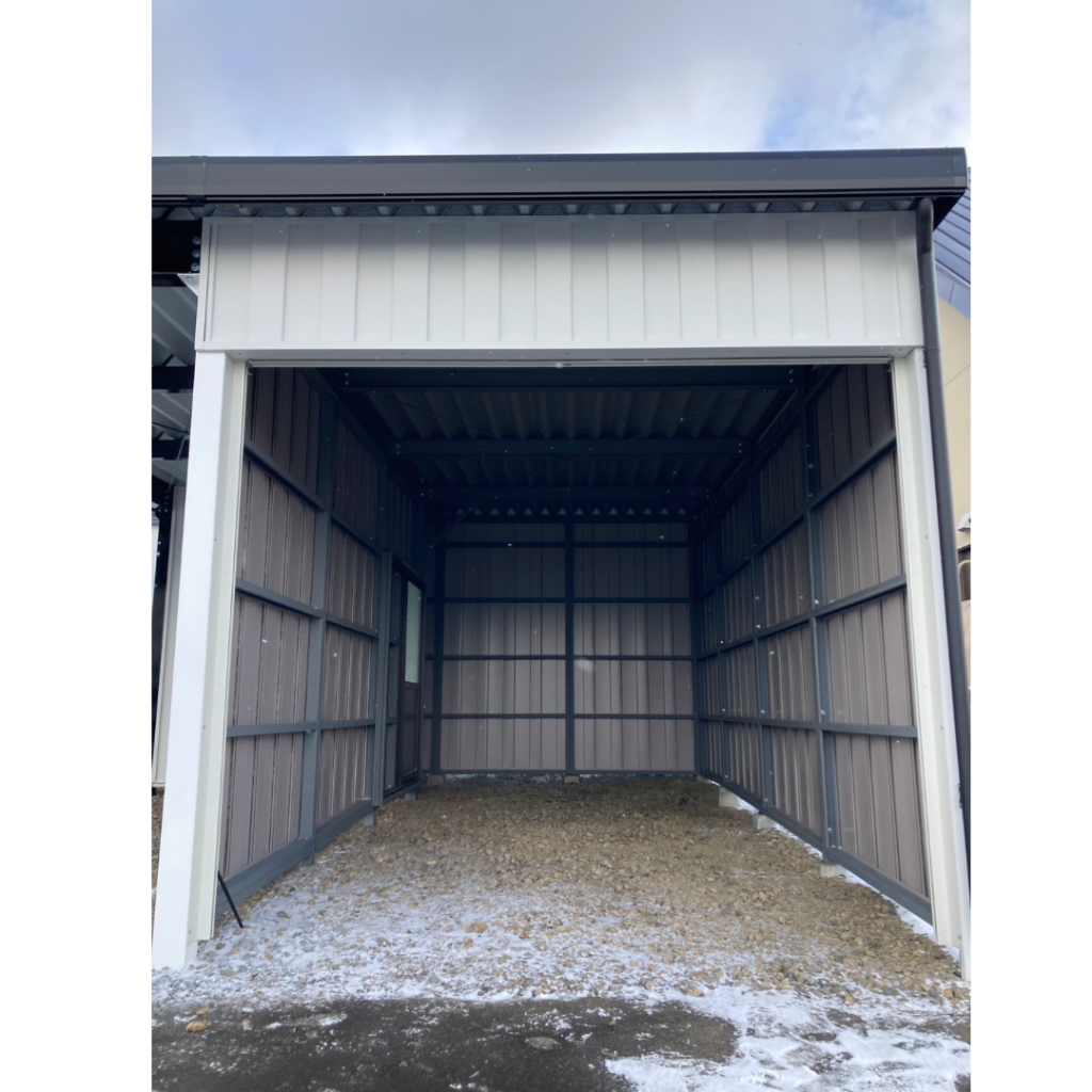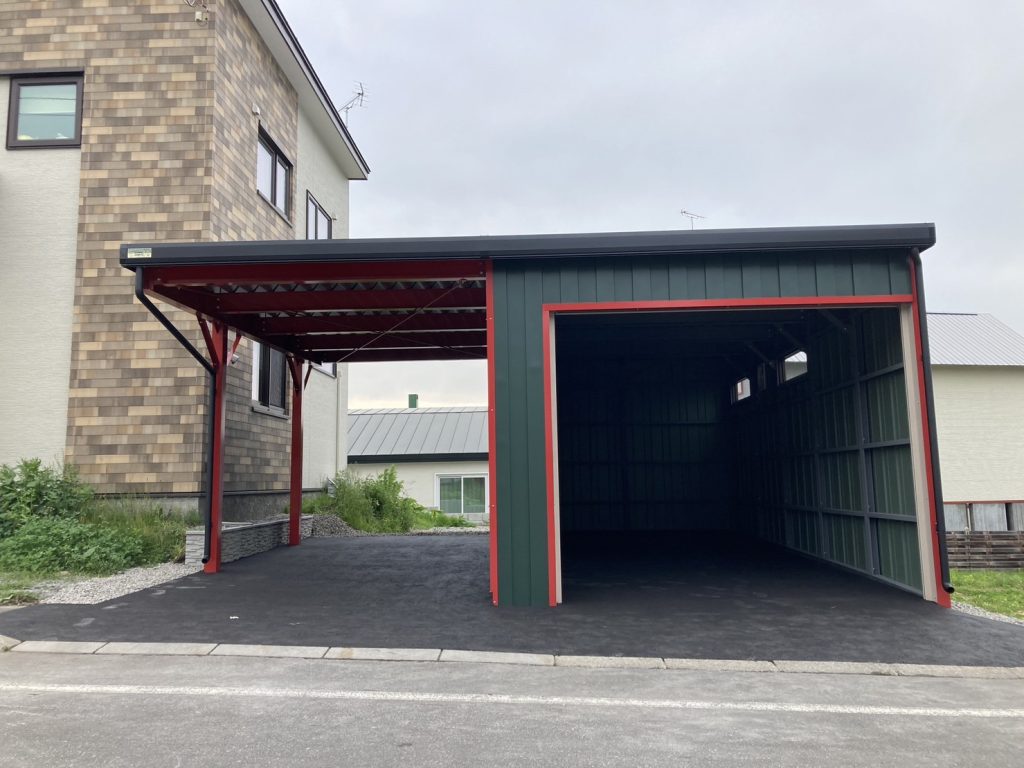 士別施工 鉄車両入庫可能用サイズの大型収納庫 正面からは車両、後部からは除雪が出せるように2連シャッター付 通常入口として屋根下側面にお子さんでも軽々開閉できる片引き戸使用。 カーポートは士別の豪雪にも耐える強鋼仕様。 カラーは重厚感あるブラック 骨塗装色:ブラック 外壁色:ブラック(縦) アルミ破風:ブラック シャッター:ペールベージュ採光窓あり ドレンパイプ:黒ブラック 横入口片引き戸:上曇り硝子下パネル
