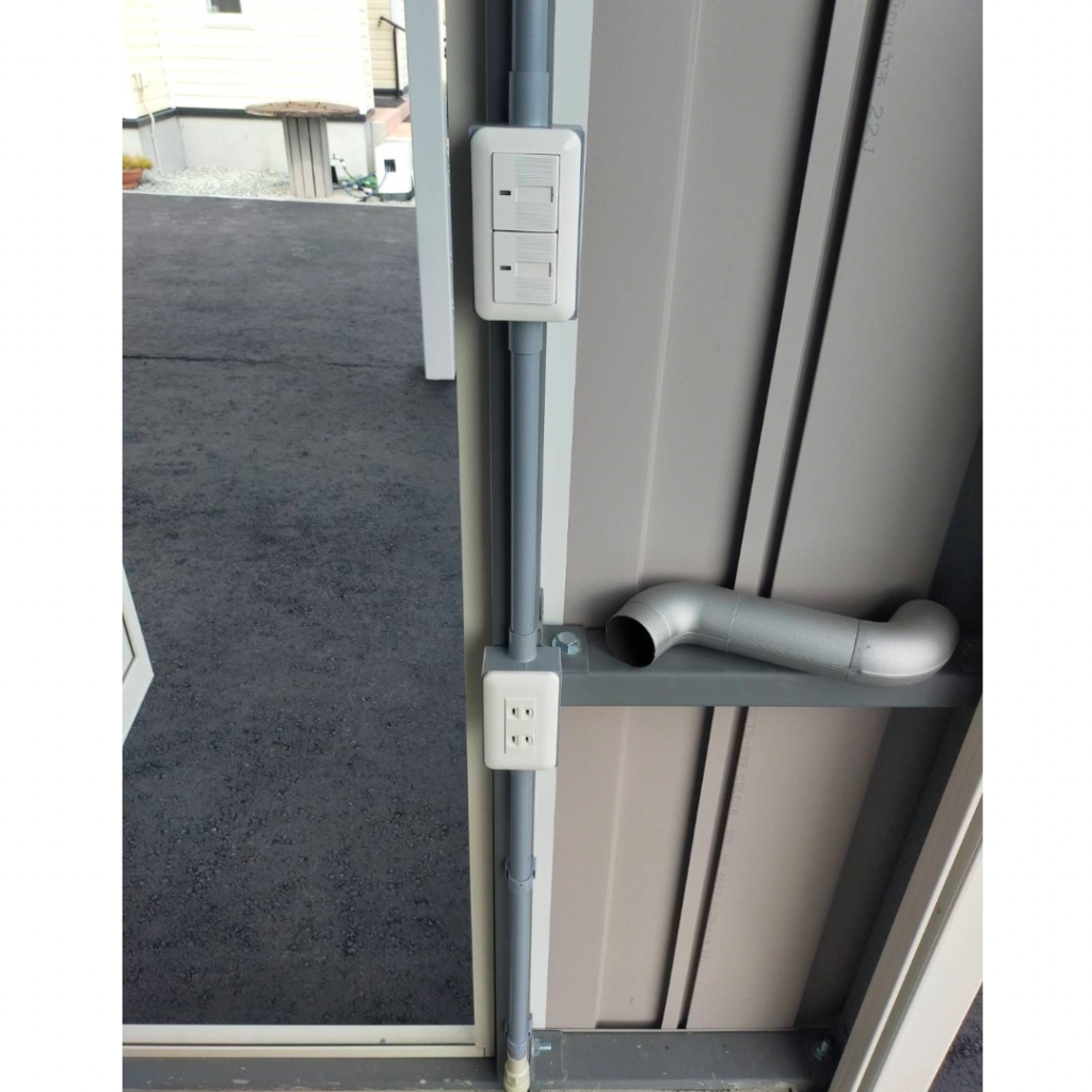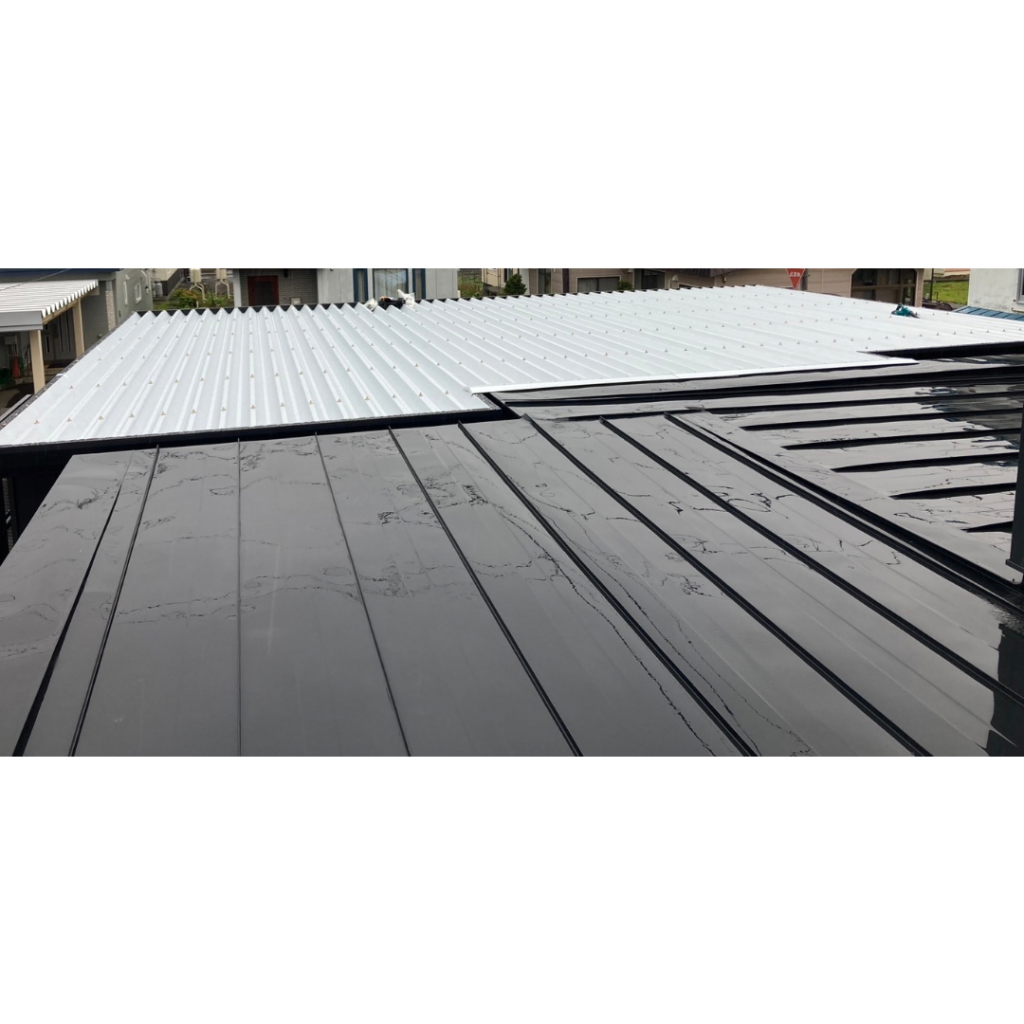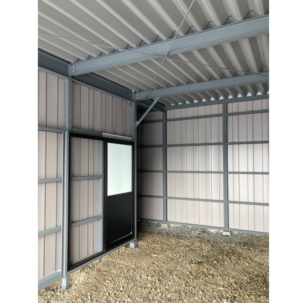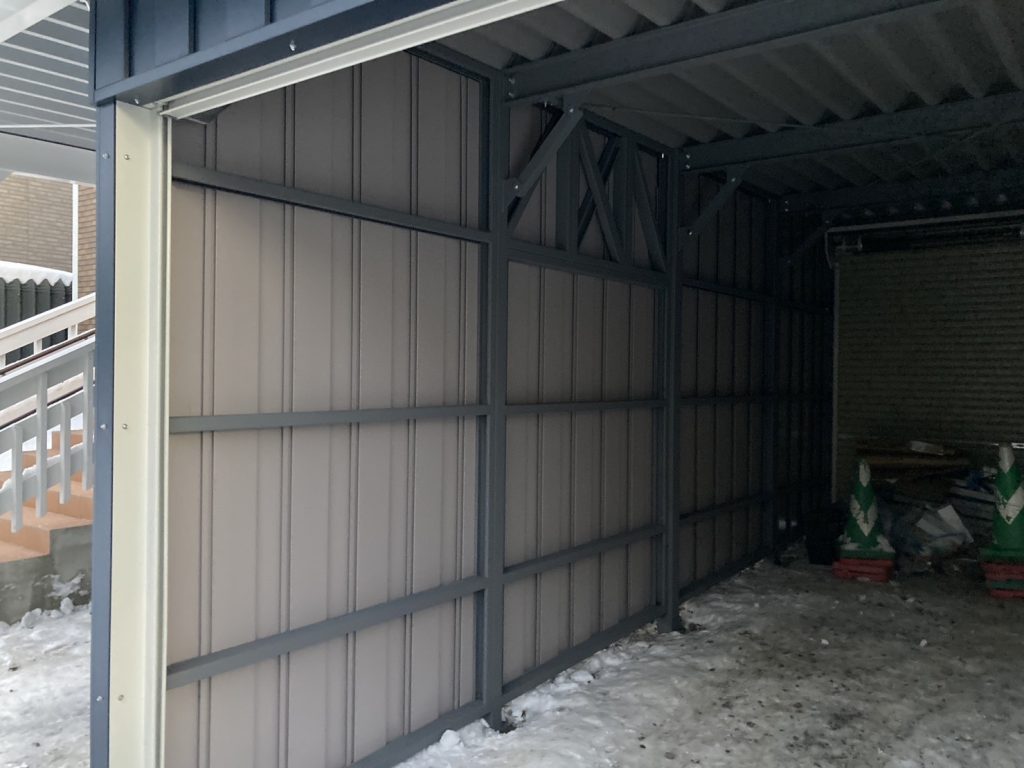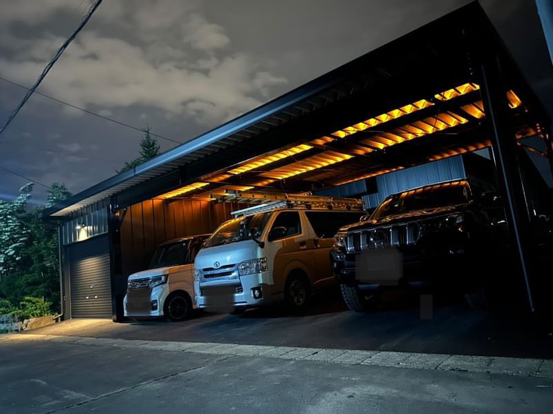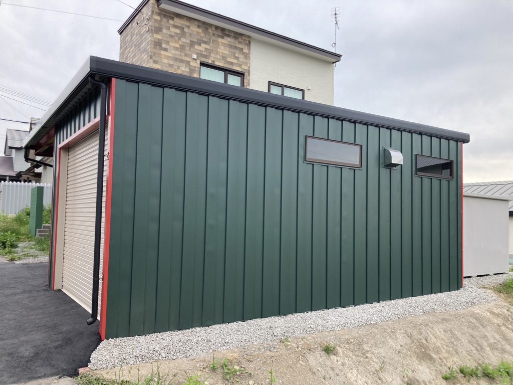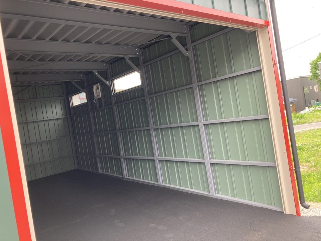 士別施工 鉄車両入庫可能用サイズの大型収納庫 正面からは車両、後部からは除雪が出せるように2連シャッター付 通常入口として屋根下側面にお子さんでも軽々開閉できる片引き戸使用。 カーポートは士別の豪雪にも耐える強鋼仕様。 カラーは重厚感あるブラック 骨塗装色:ブラック 外壁色:ブラック(縦) アルミ破風:ブラック シャッター:ペールベージュ採光窓あり ドレンパイプ:黒ブラック 横入口片引き戸:上曇り硝子下パネル