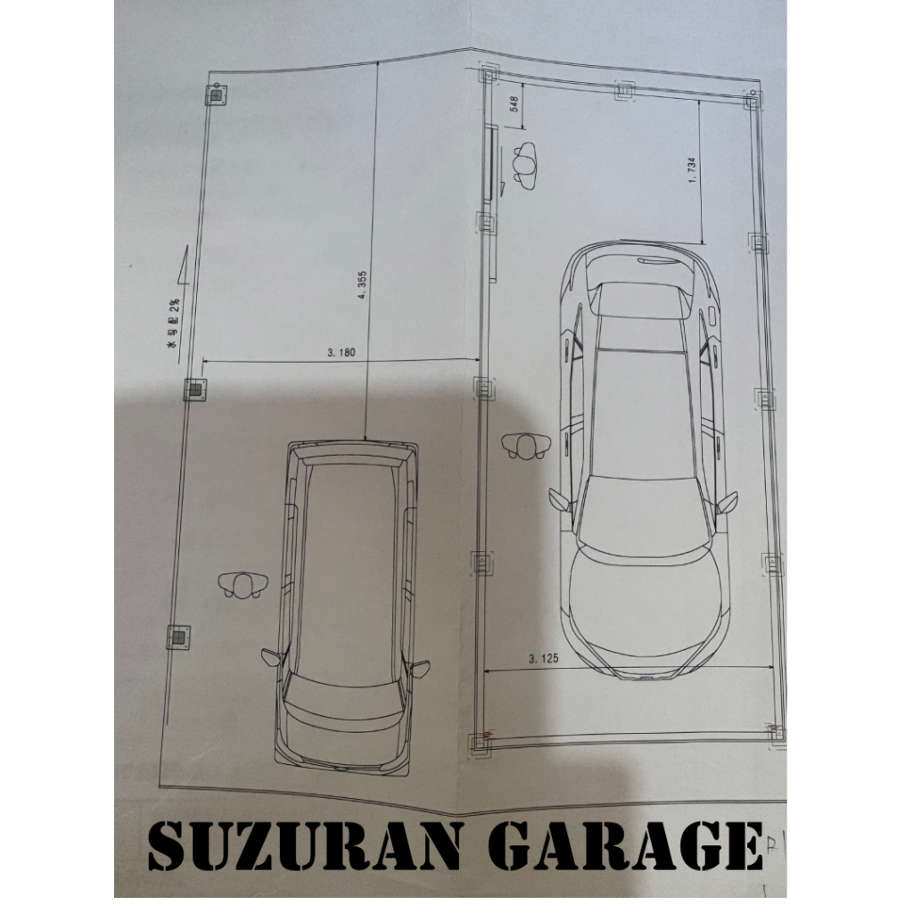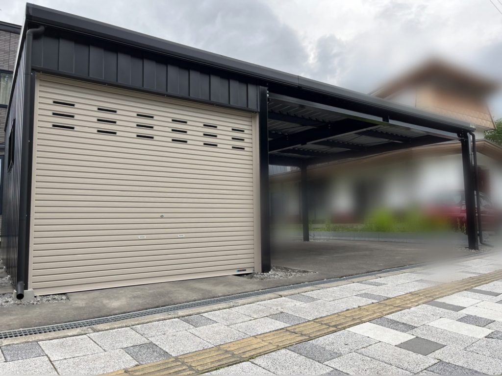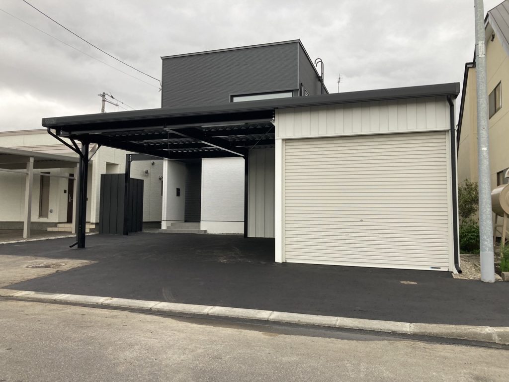 2台用並列ガレージの前に広々カーポートを設置!!! 鉄骨塗装色:ブラック 外壁色:墨(縦) アルミ破風:ブラック シャッター:ブラック ドレンパイプ:ブラック 片開きドア:ブラック