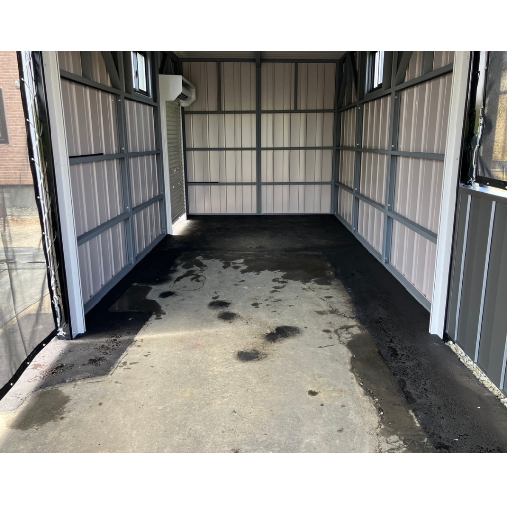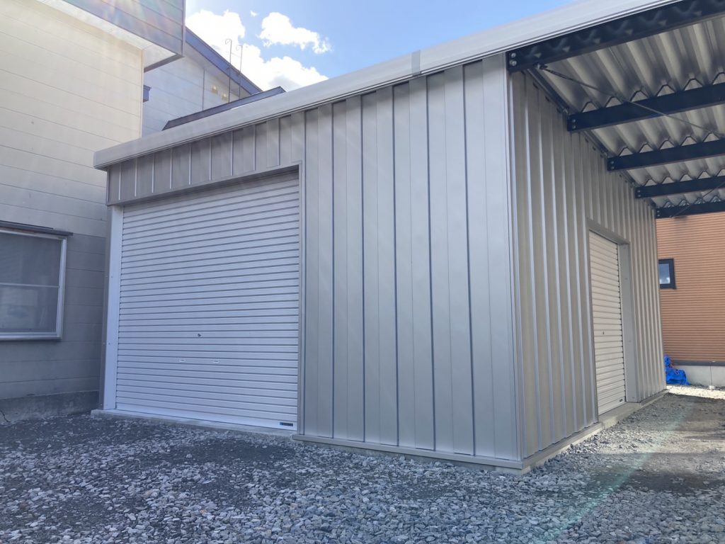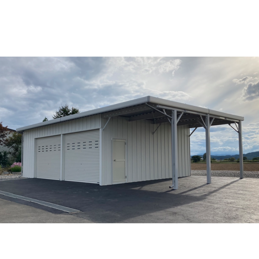 幅10M!!!ガレージ部分は袖壁を作って中は広々!!オプションの棚も設置しています。 鉄骨塗装色:ホワイト 外壁色:マットホワイト(縦) アルミ破風:シルバー シャッター:シルキーホワイト ドレンパイプ:シルバー アルミドア:ホワイト(上下パネル)※電気工事外注