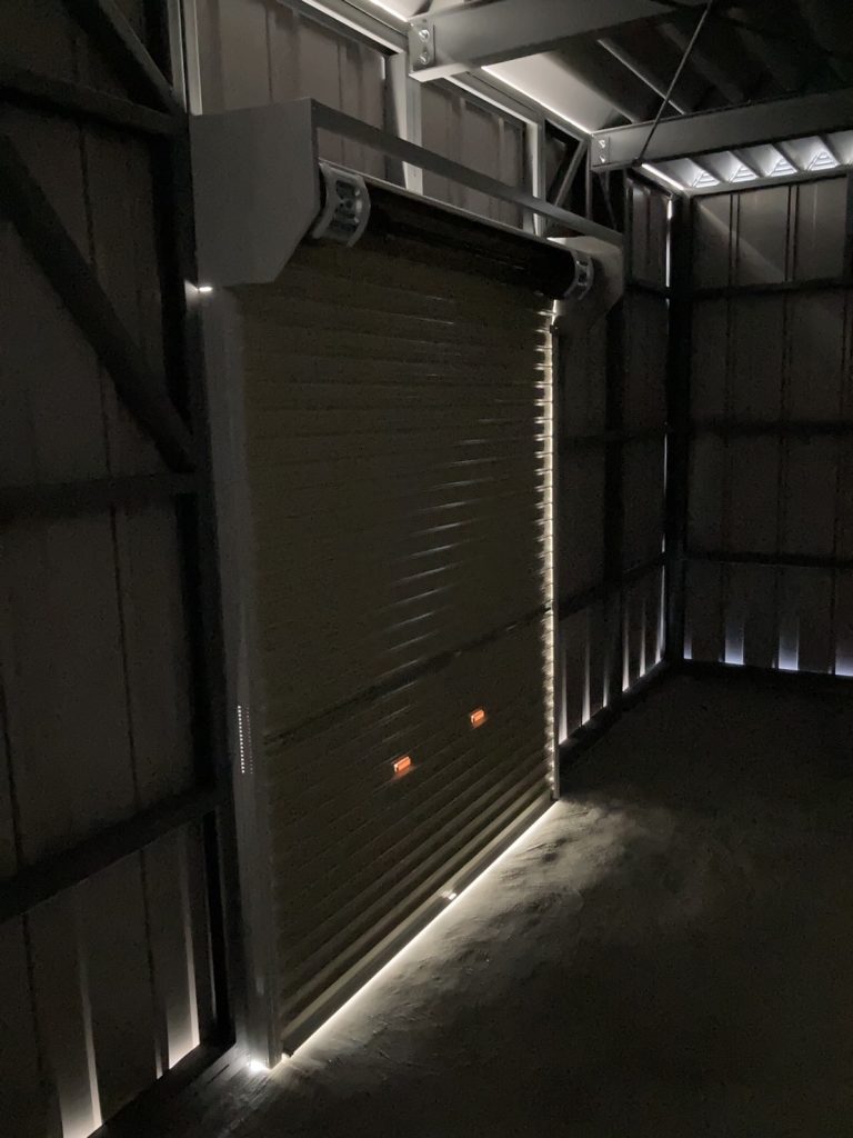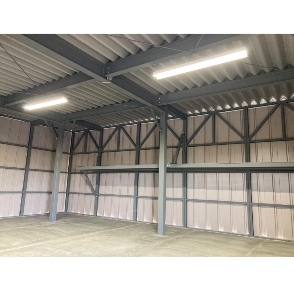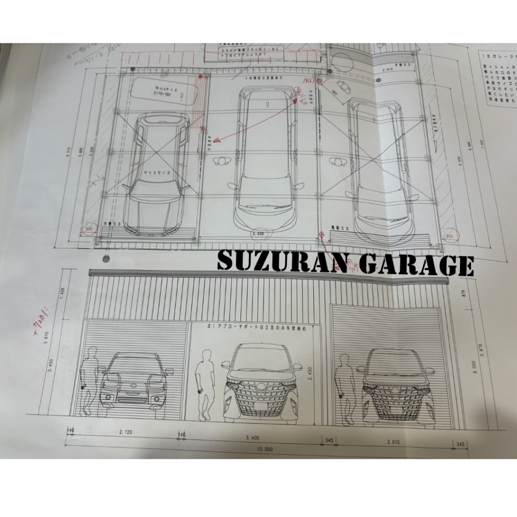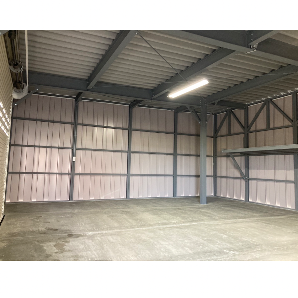 幅10M!!!ガレージ部分は袖壁を作って中は広々!!オプションの棚も設置しています。 鉄骨塗装色:ホワイト 外壁色:マットホワイト(縦) アルミ破風:シルバー シャッター:シルキーホワイト ドレンパイプ:シルバー アルミドア:ホワイト(上下パネル)※電気工事外注