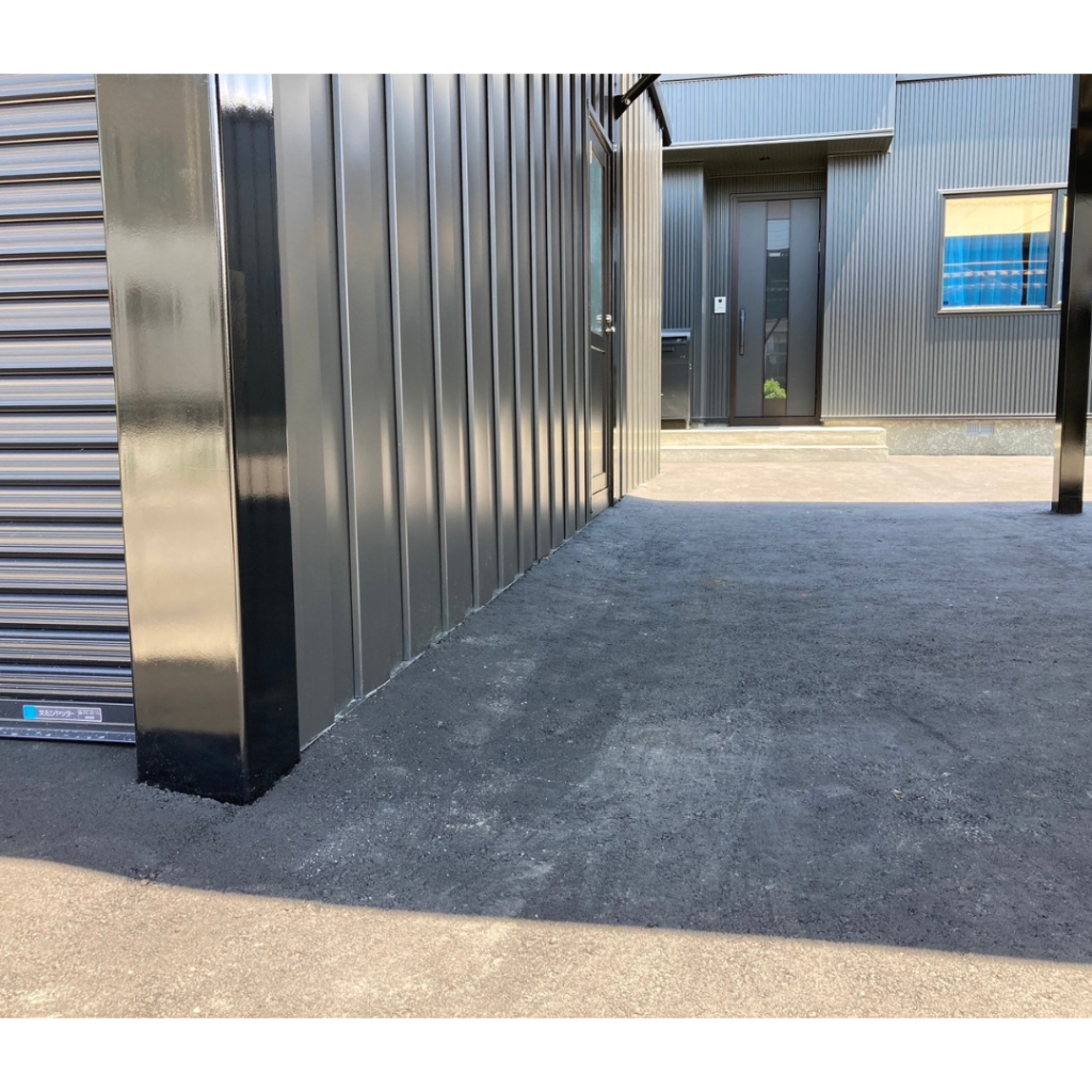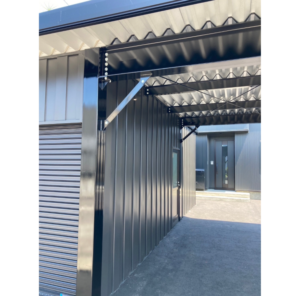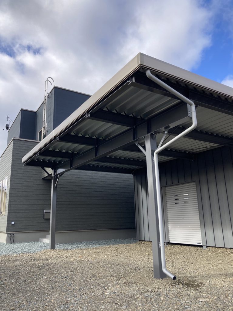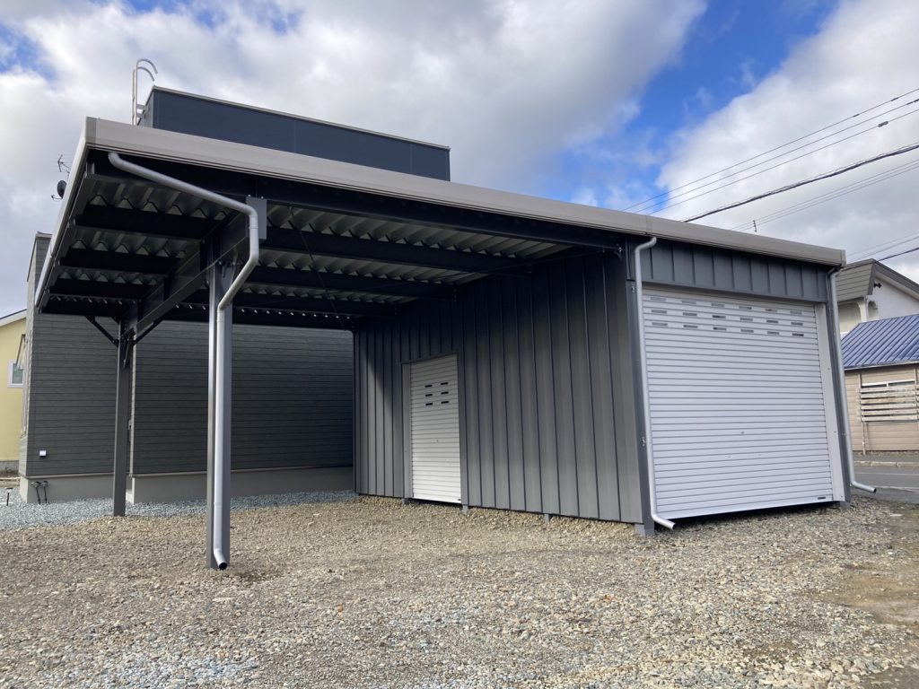全て繋げて使い勝手抜群です!! 鉄骨塗装色:ブラック 外壁色:ロイヤルグレー(縦) アルミ破風:グレー シャッター:シルバーグレー ドレンパイプ:シルバー
