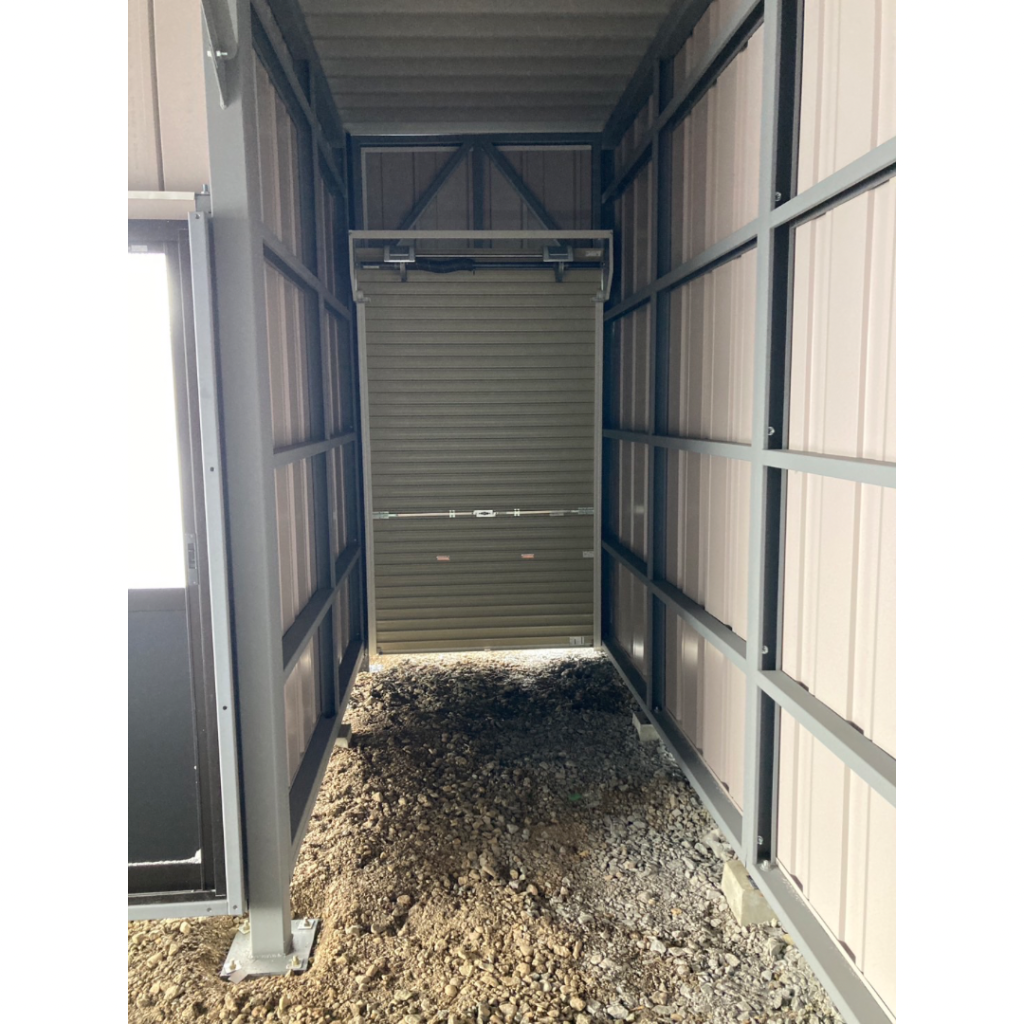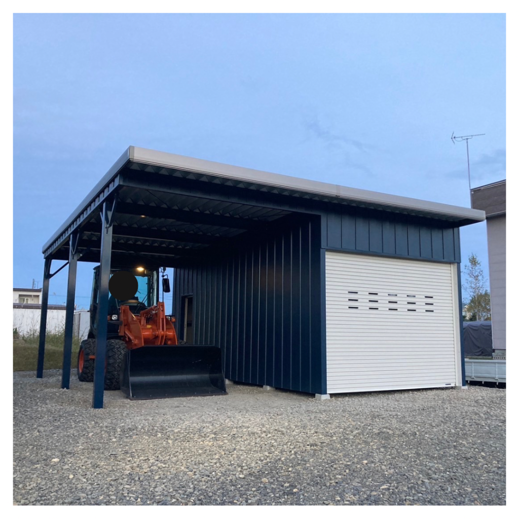 タイヤショベル入庫の高さと広さを確保!!! 鉄骨塗装色:ロイヤルブルー 外壁色:ロイヤルブルー(縦) アルミ破風:アーバングレー シャッター:シルキーホワイト 片引きドア:アーバングレー