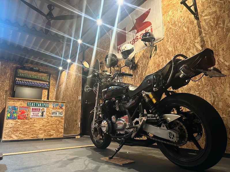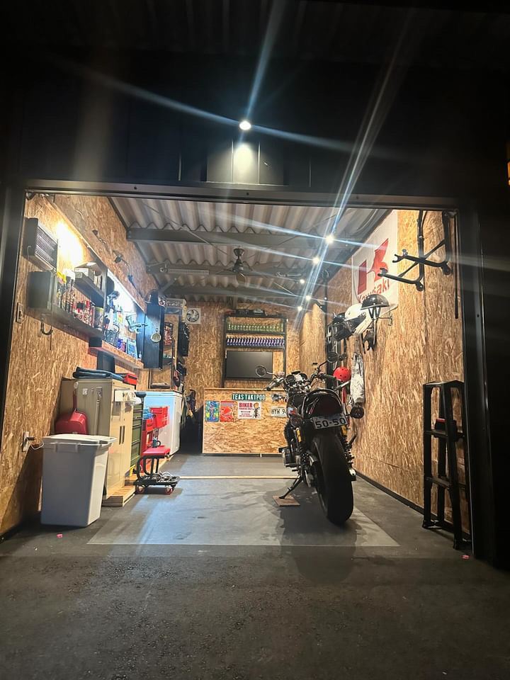 傾斜のある敷地に施工。用途に合わせてシャッター・間口の高さを変えてコストダウン!!!(バイク用・車用) 鉄骨塗装色:サンドブラック 外壁色:サンドブラック(縦) アルミ破風:ブラック シャッター:シルバーグレー ドレンパイプ:ブラック アルミドア:ブラック 窓枠:ブラック