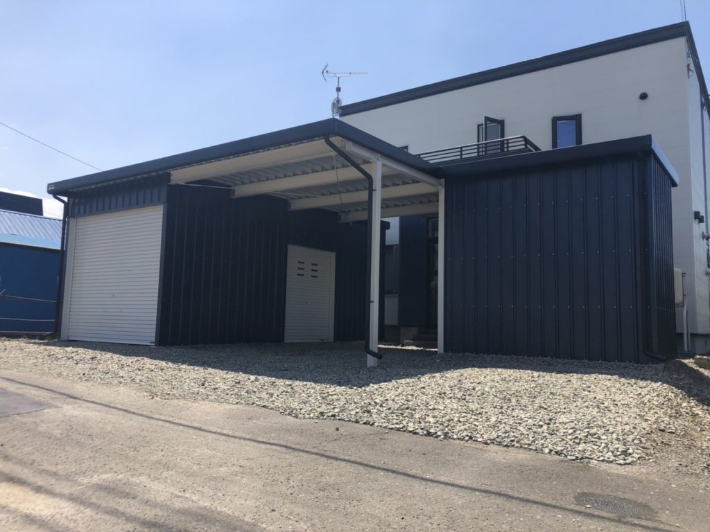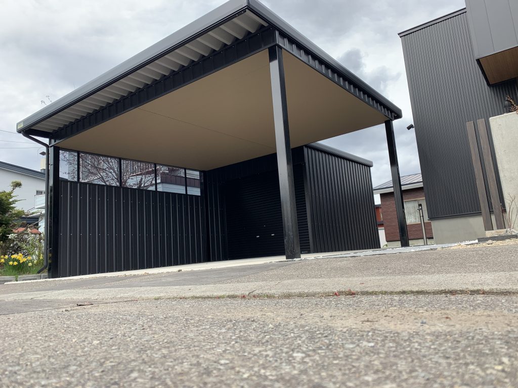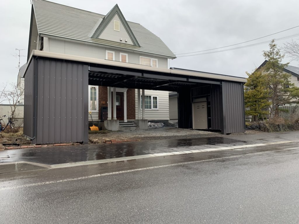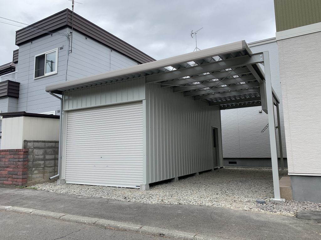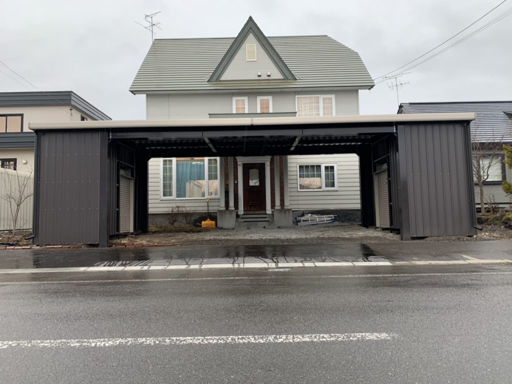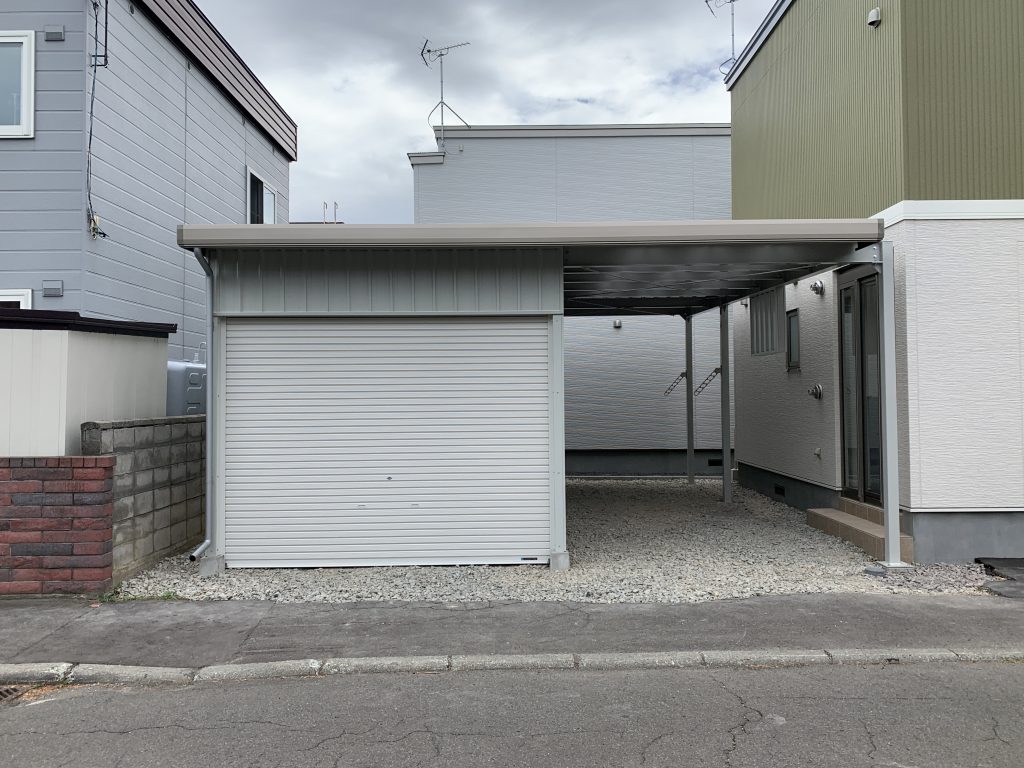 富良野施工 1台用ガレージ+アプローチカーポート+ストレージ+青空スペース -