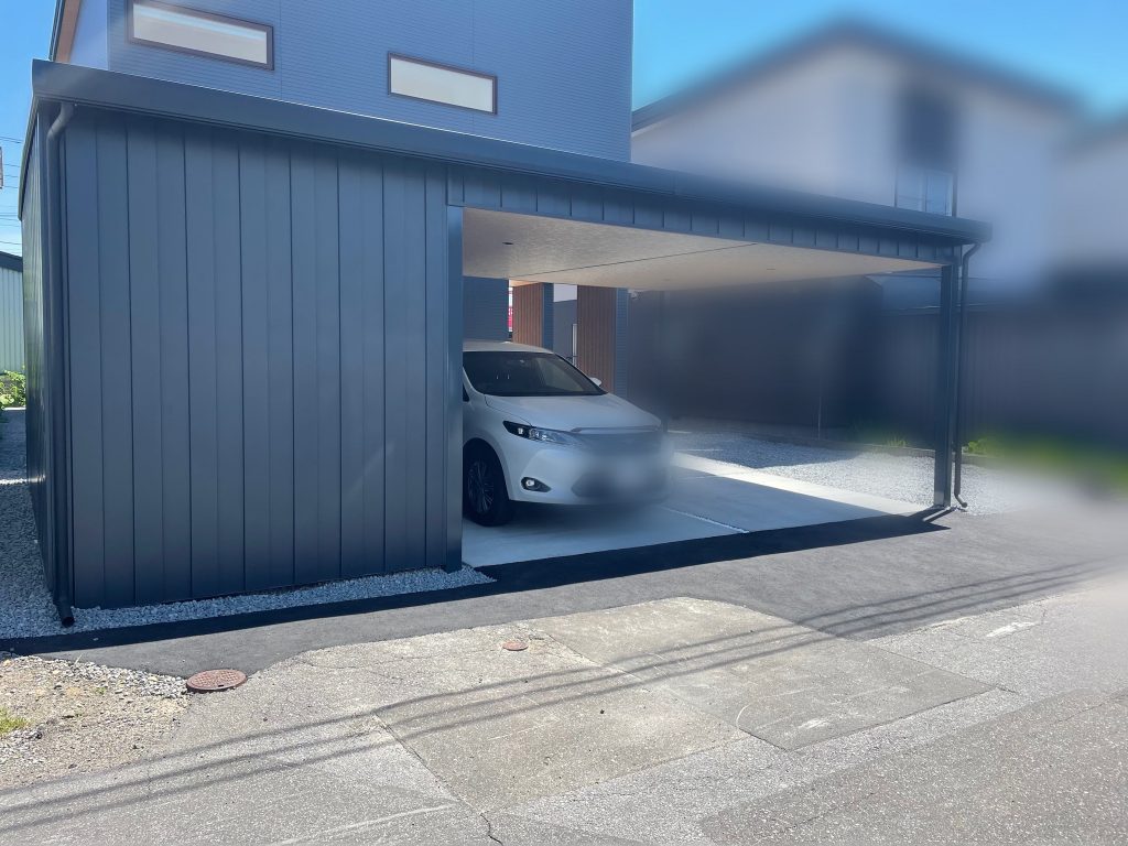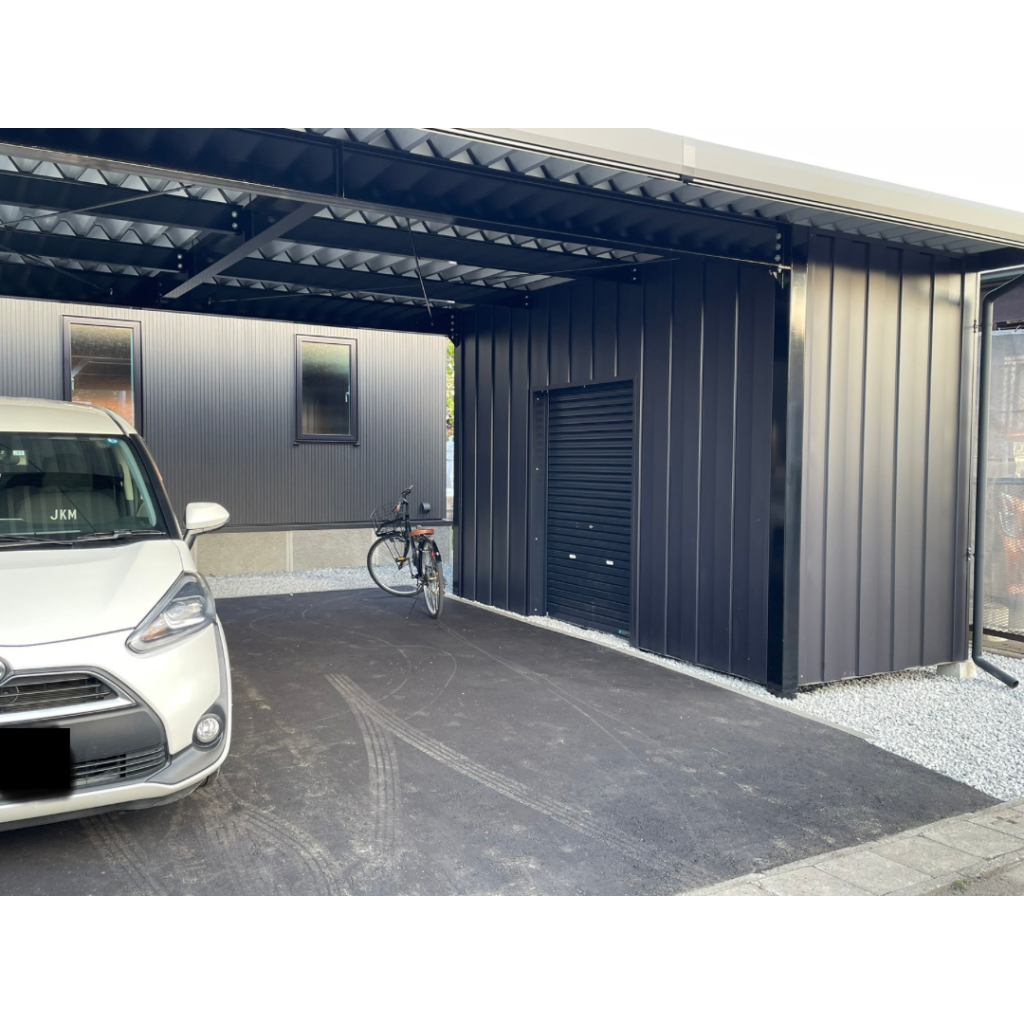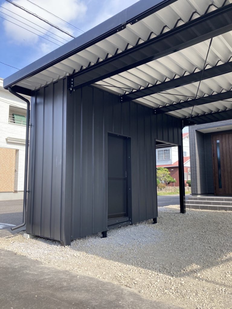 特注ストレージポート(収納棚あり) 鉄骨塗装色:チャコールグレー 外壁色:チャコールグレー(縦) アルミ破風:ブラック シャッター:シルバーグレー ドレンパイプ:ブラック