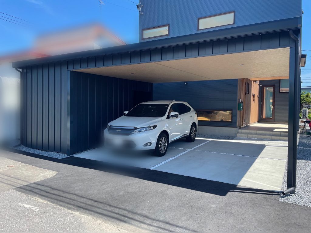 3ナンバーの車でも余裕の空間を確保できる広さです!! 鉄骨塗装色:ブラック 外壁色:サンドブラック(縦) アルミ破風:ブラック シャッター:シルバーグレー ドレンパイプ:ブラック