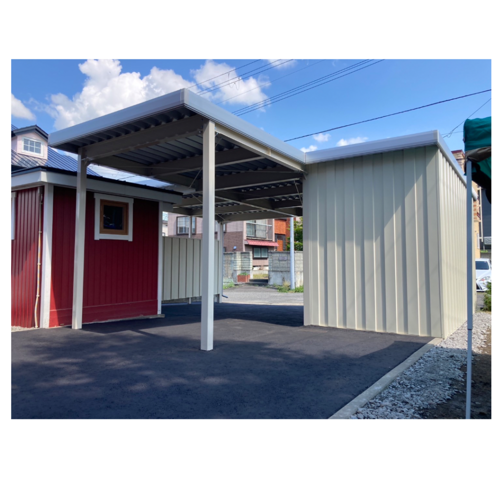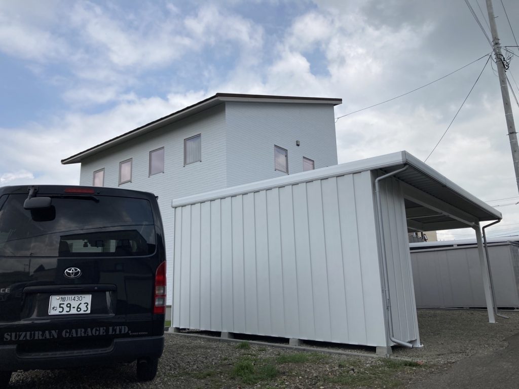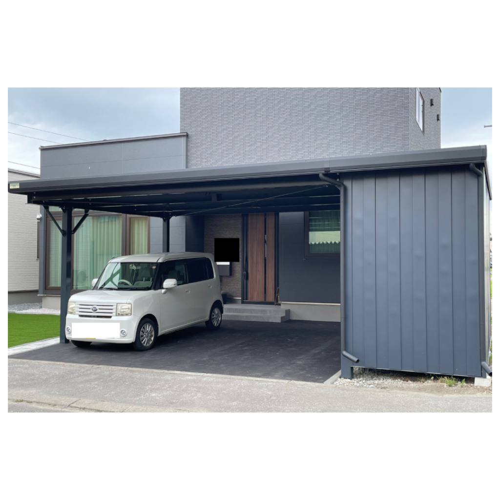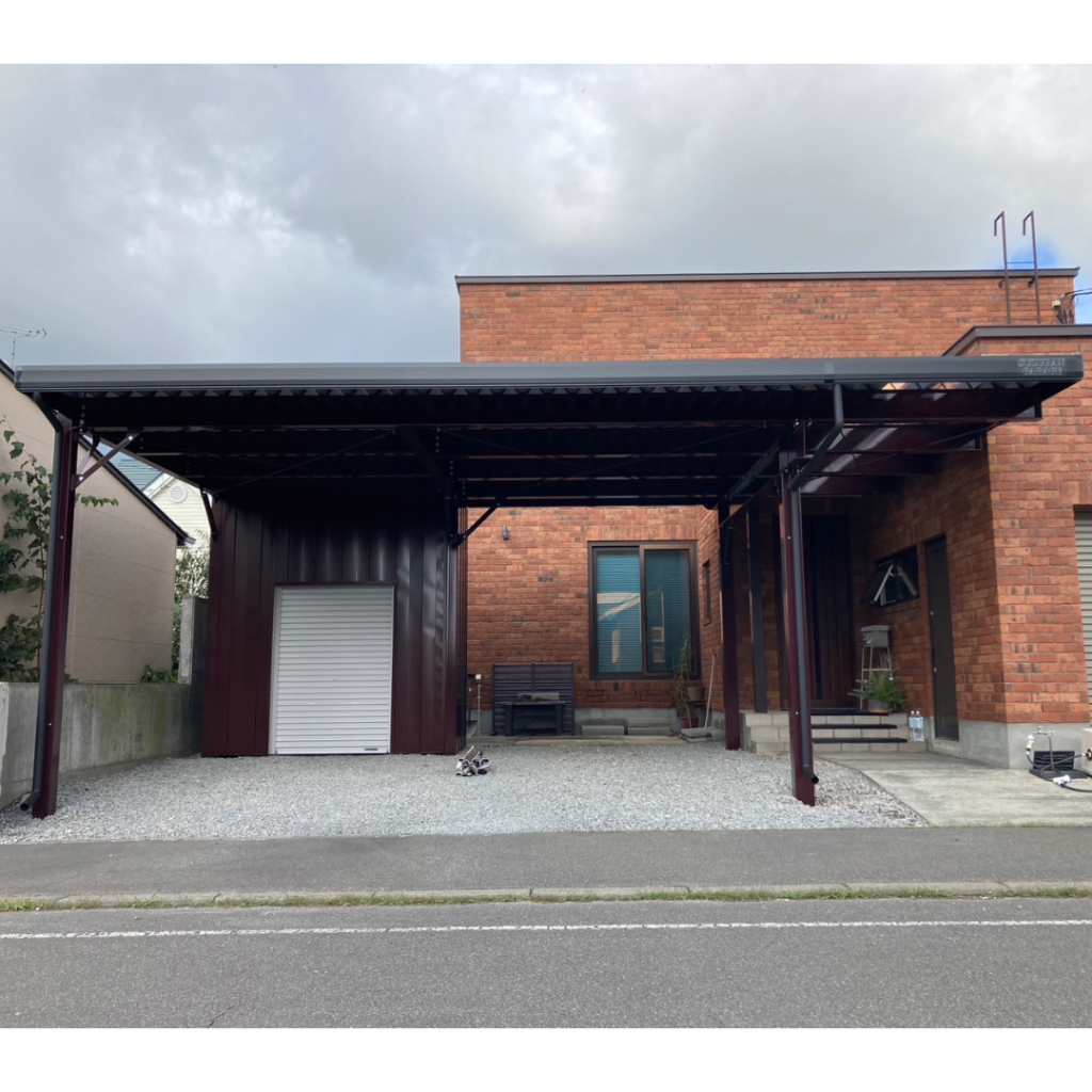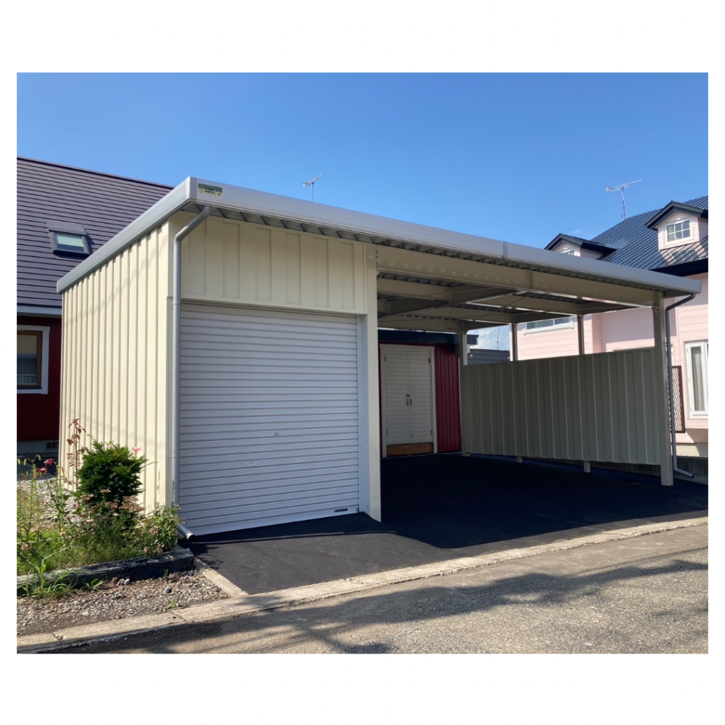 カーポート部分は全てアルミカーポートスタイル。 収納部は軽量鉄骨にて収納部を造作。 収納後部は簡易フリースペースになり、除雪道具などを 簡単に周囲から見えない部分で簡単収納 柱桁アルミ素材:プラチナステン 外壁色:ホワイトアイボリー(縦) アルミ破風:アーバングレー シャッター:ペールベージュ採光窓無 ドレンパイプ:シルバー アルミドア:上曇り下パネル プラチナステン