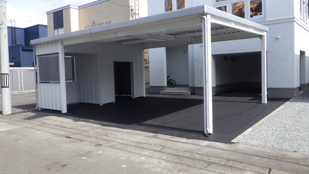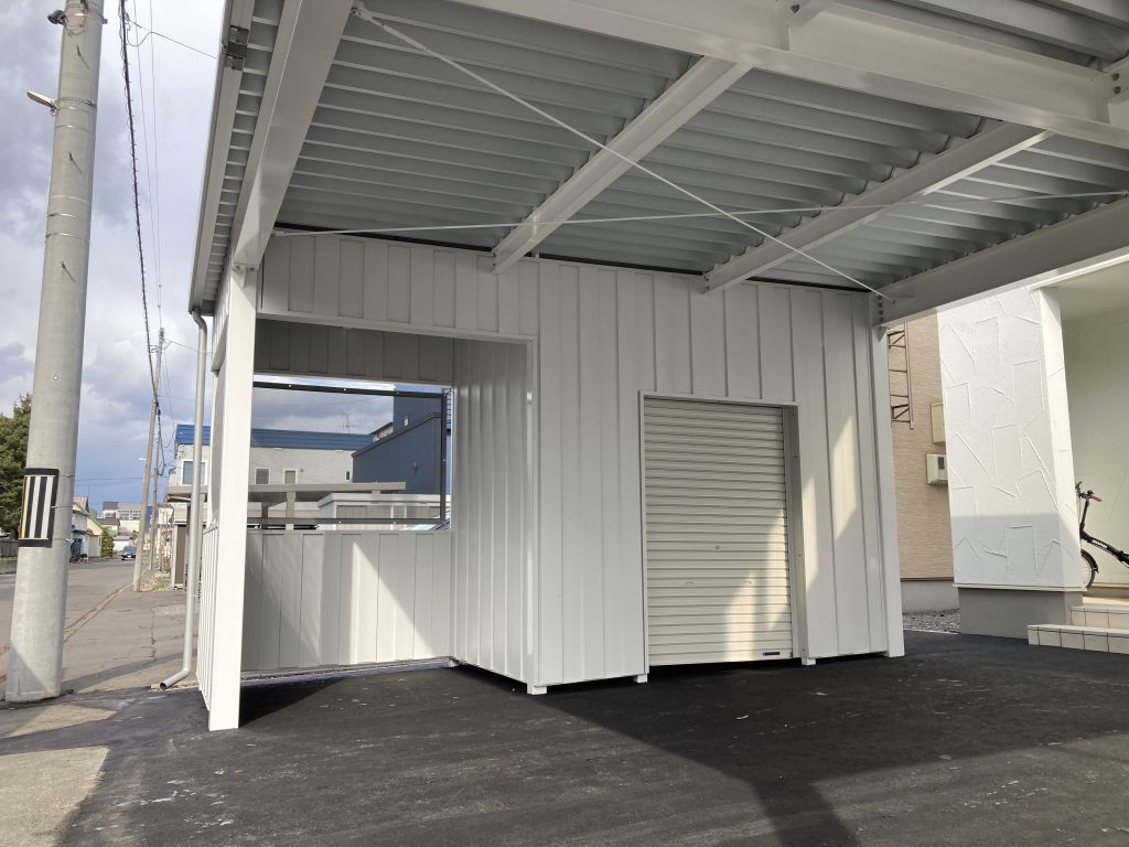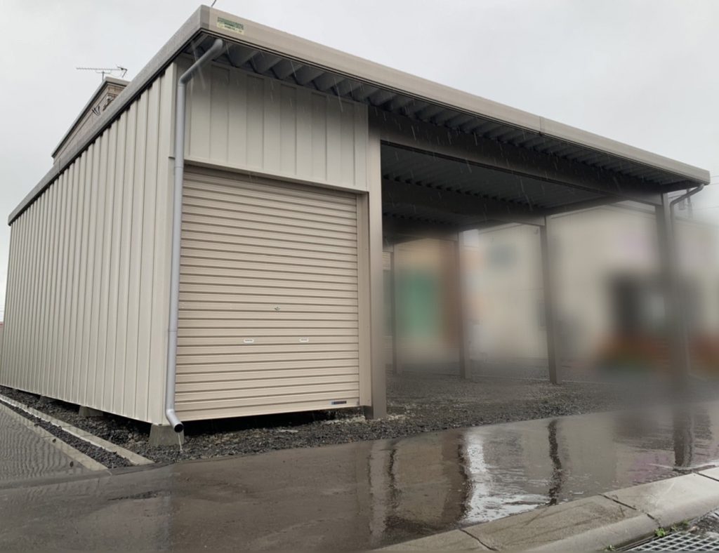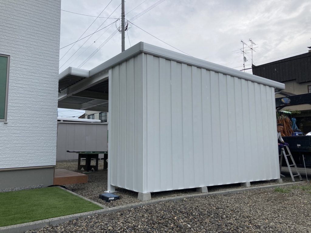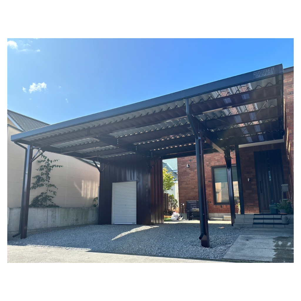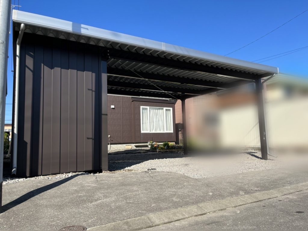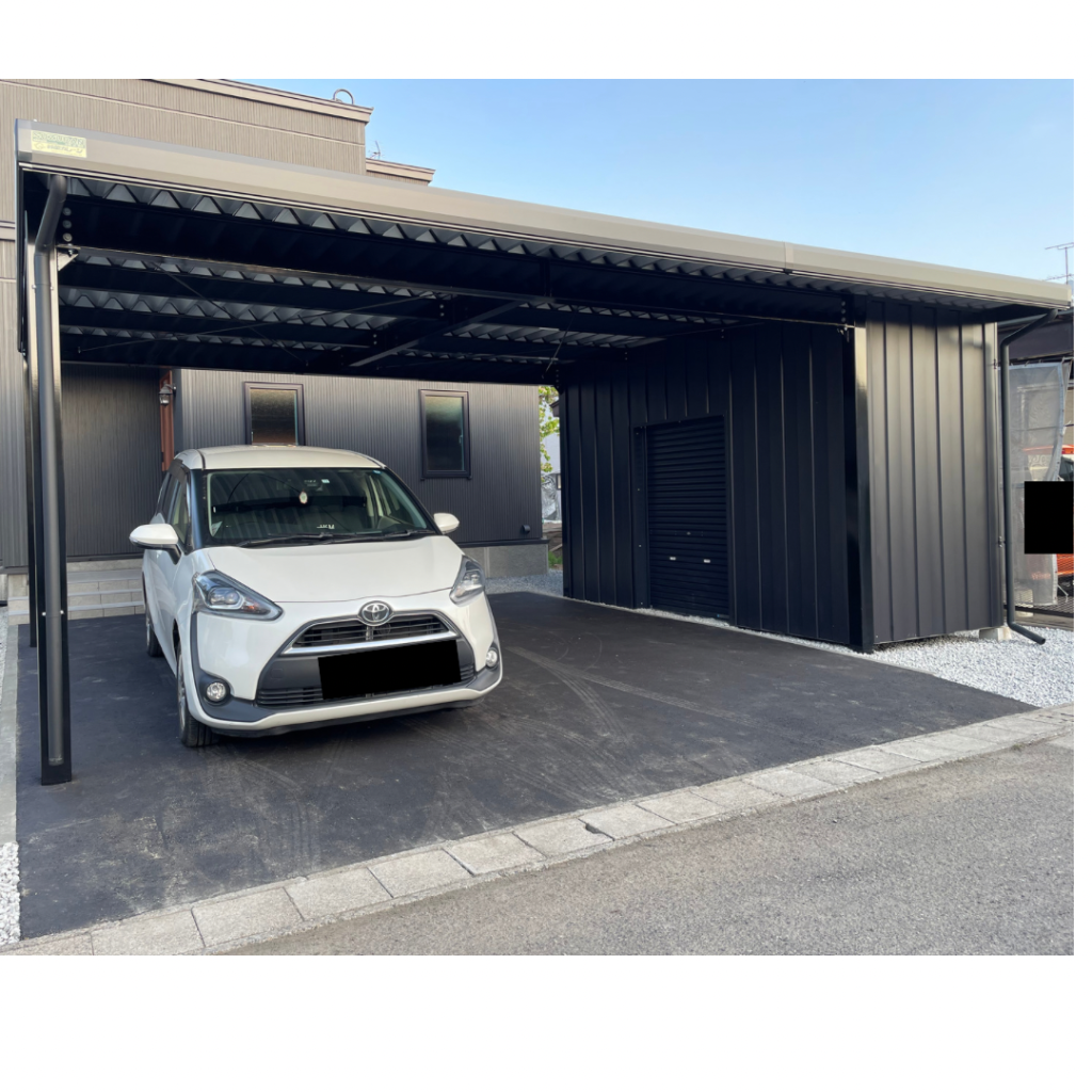 カーポート部分は全てアルミカーポートスタイル。 収納部は軽量鉄骨にて収納部を造作。 収納後部は簡易フリースペースになり、除雪道具などを 簡単に周囲から見えない部分で簡単収納 柱桁アルミ素材:プラチナステン 外壁色:ホワイトアイボリー(縦) アルミ破風:アーバングレー シャッター:ペールベージュ採光窓無 ドレンパイプ:シルバー アルミドア:上曇り下パネル プラチナステン
