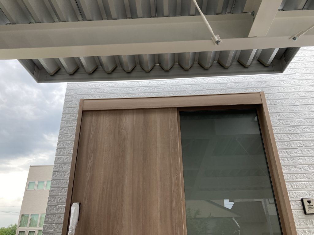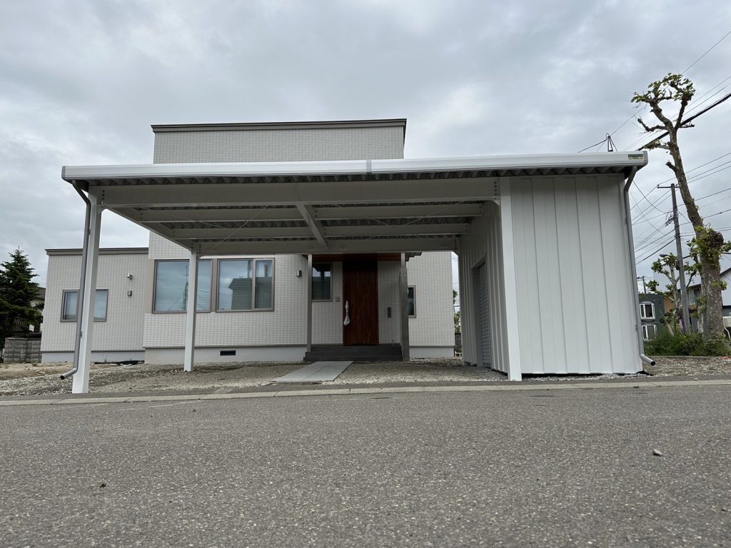 旭川施工 住宅窓からの採光確保と玄関上のみ屋根延長 鉄骨塗装色:ホワイト 外壁色:ホワイト(縦) アルミ破風:シルバー シャッター:シルキーホワイト採光窓無 ドレンパイプ:シルバー