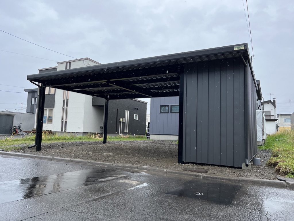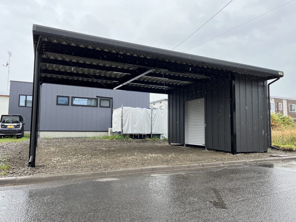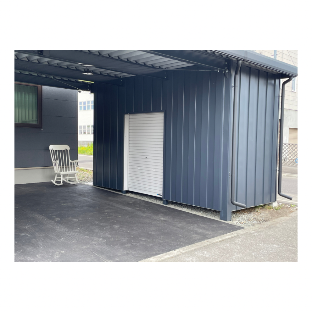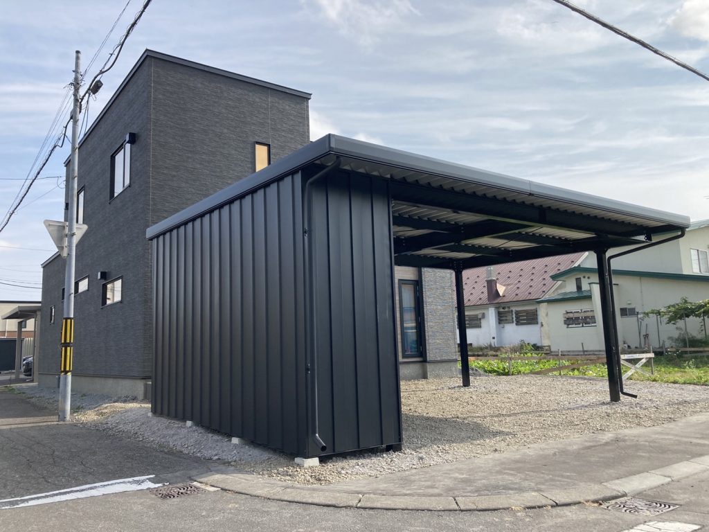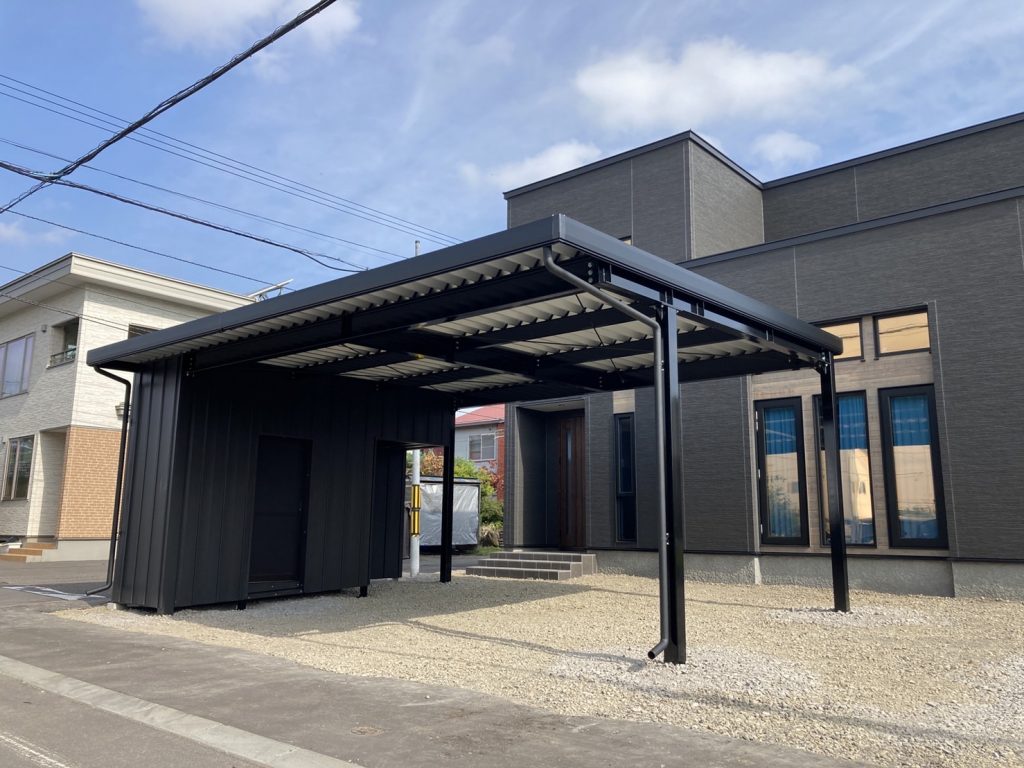 旭川施工 特注2台用ストレージポート 鉄骨塗装色:チャコールグレー 外壁色:チャコールグレー(縦) 天井:金属サイディング アルミ破風:ブラック シャッター:ダークグリーン ドレンパイプ:ブラック