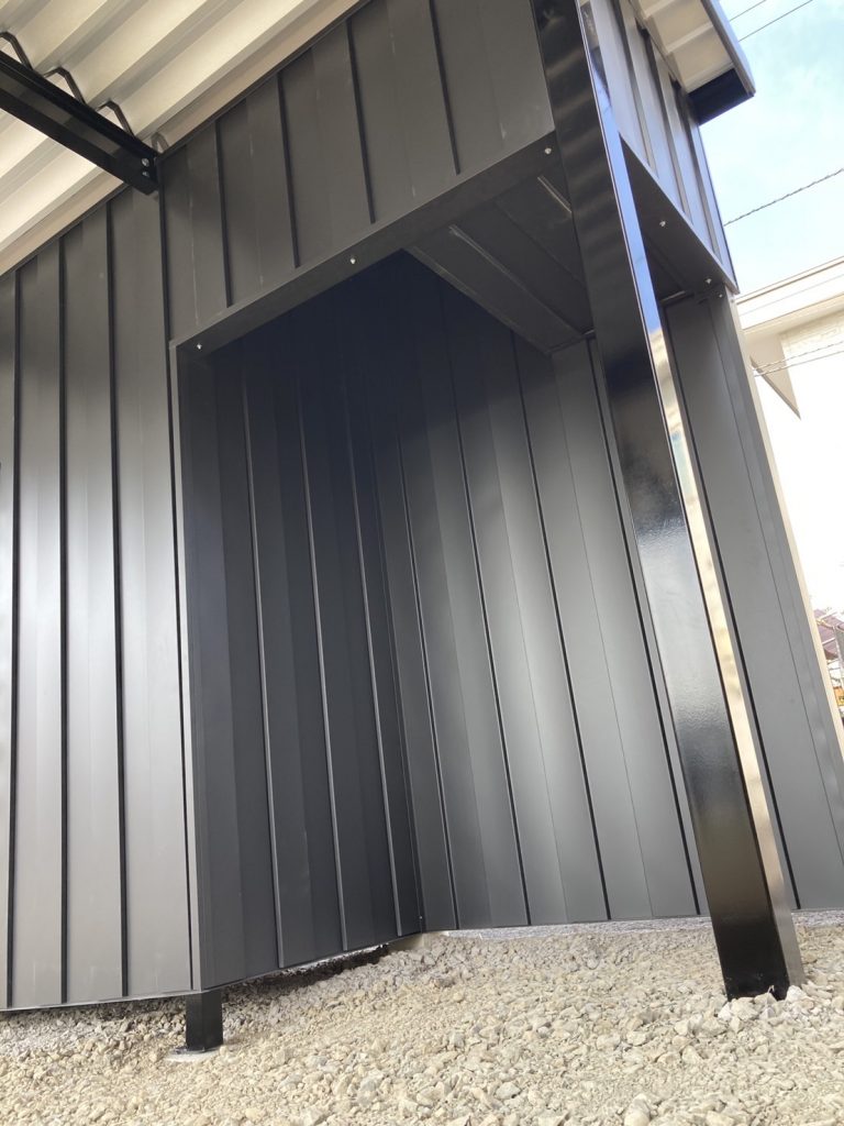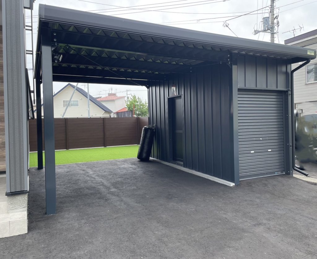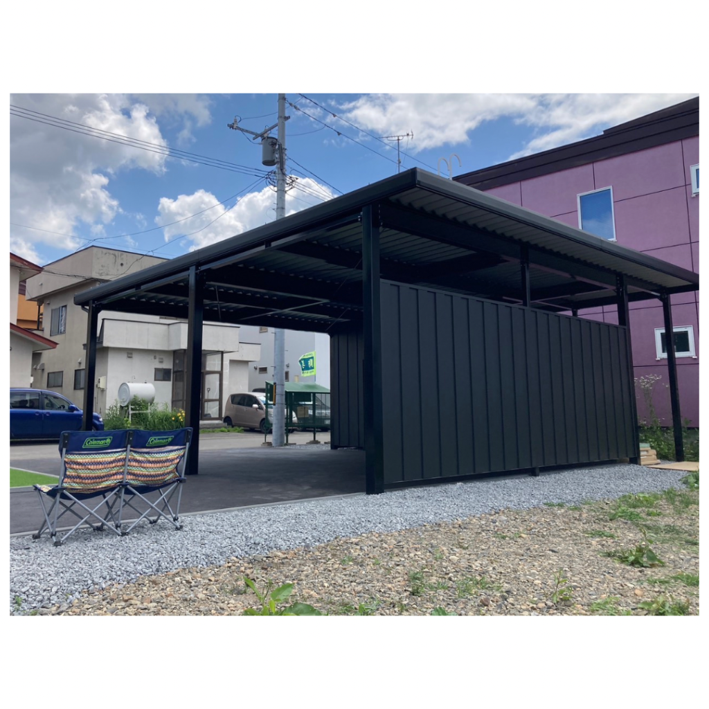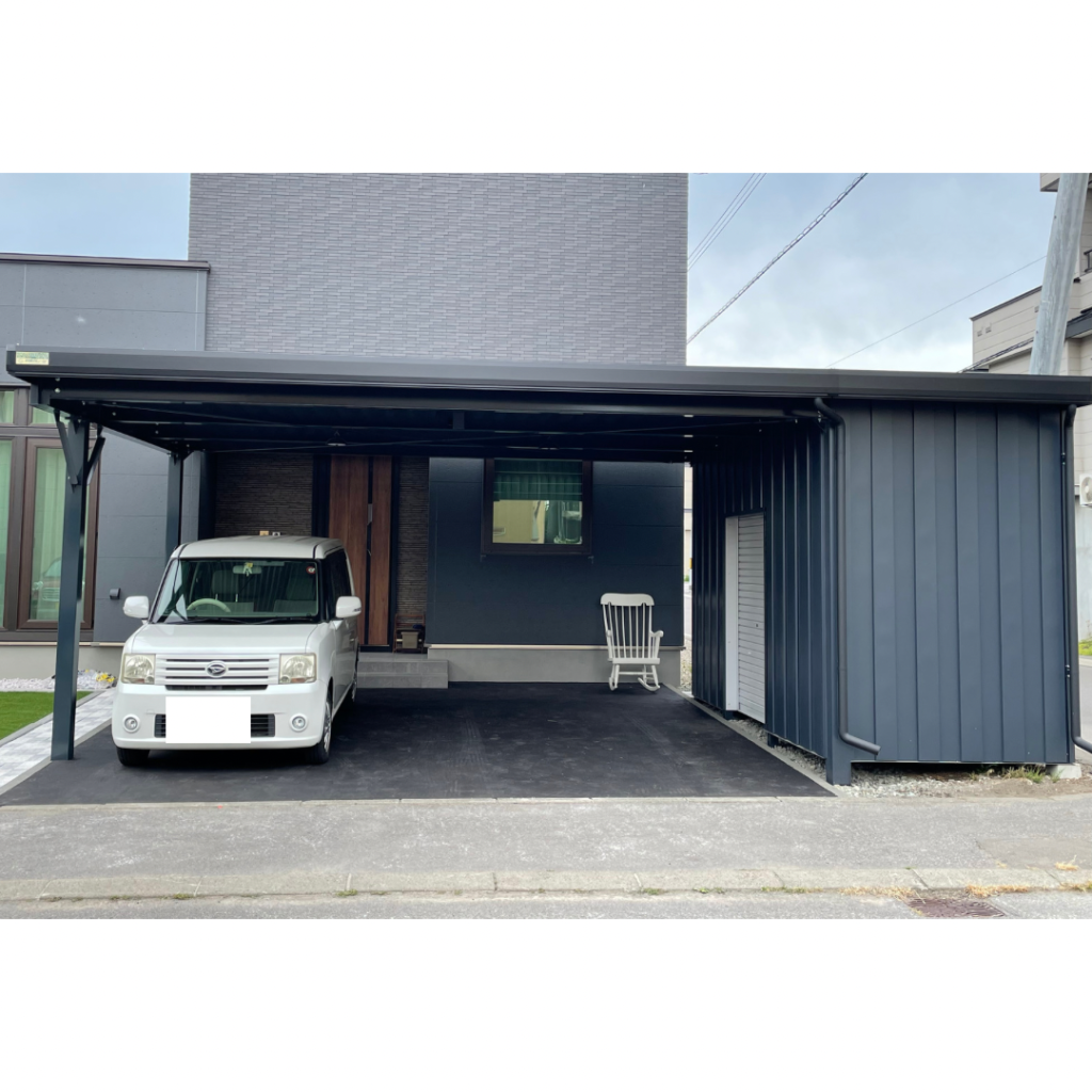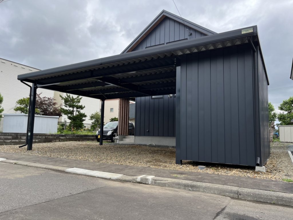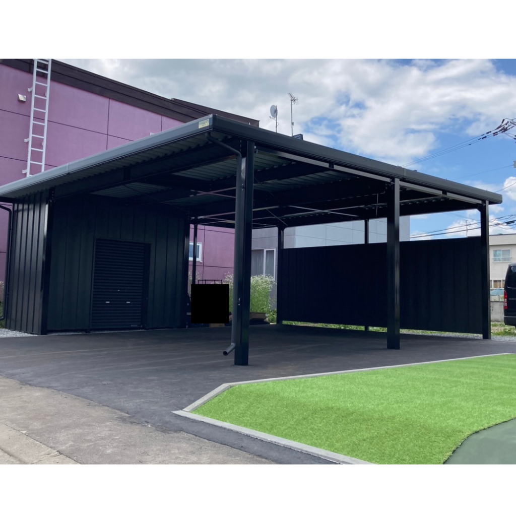 旭川施工 特注2台用ストレージポート 鉄骨塗装色:チャコールグレー 外壁色:チャコールグレー(縦) 天井:金属サイディング アルミ破風:ブラック シャッター:ダークグリーン ドレンパイプ:ブラック