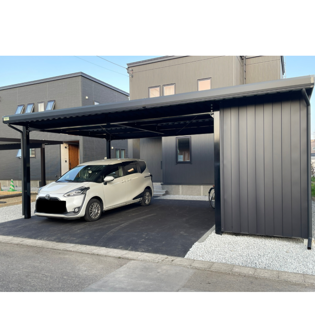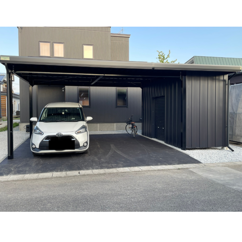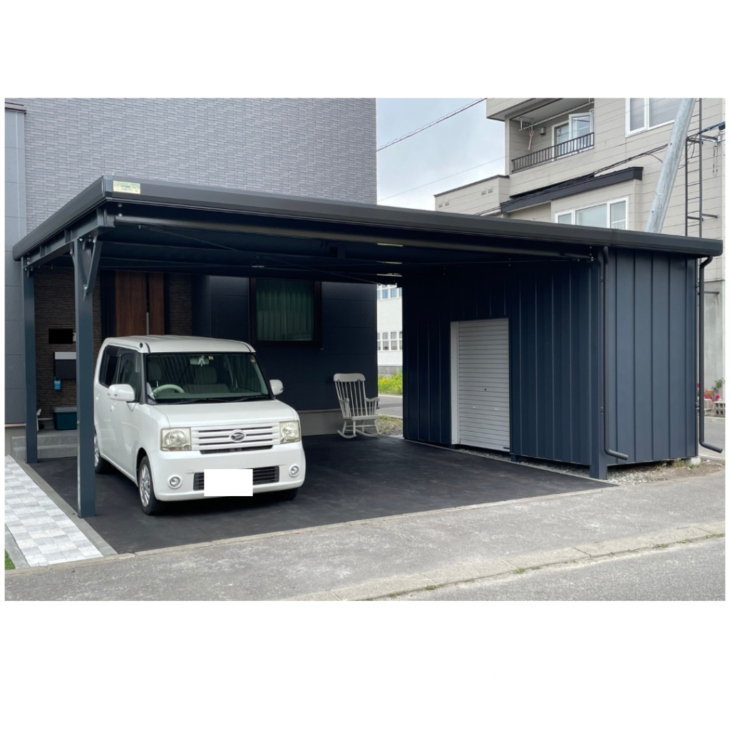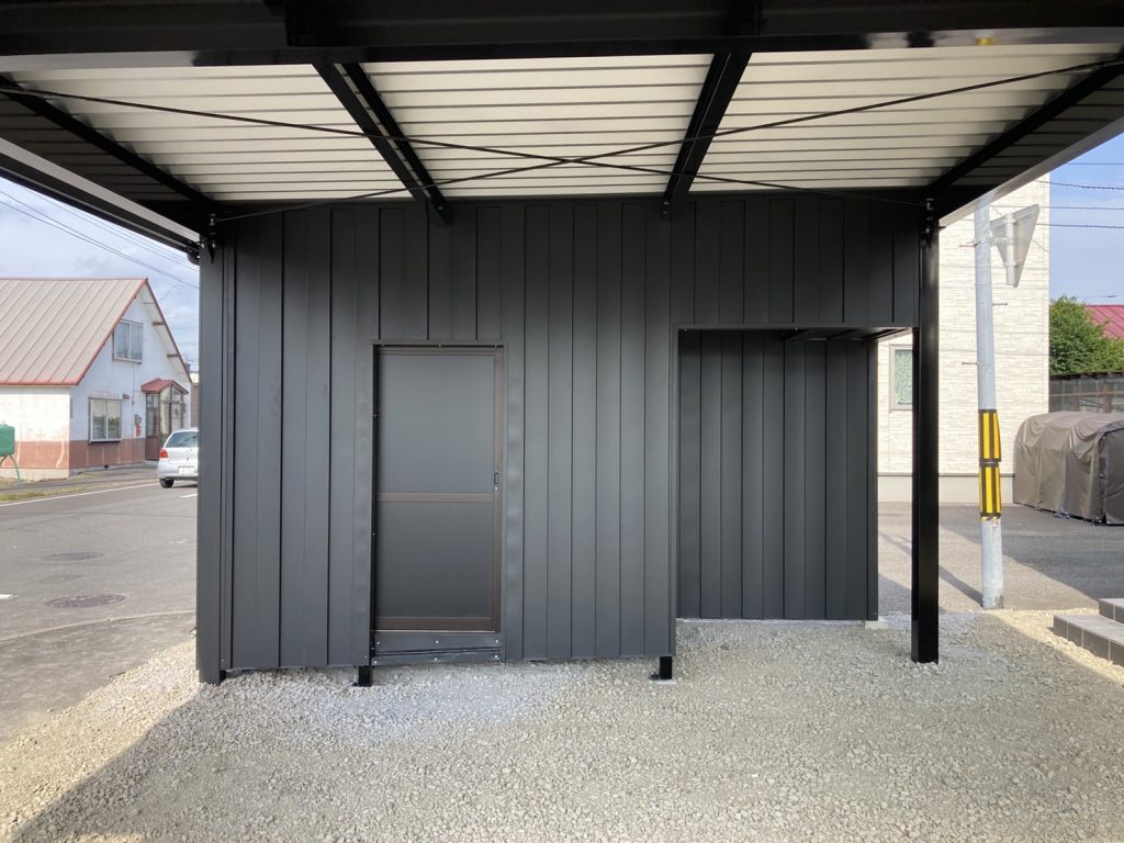 旭川施工 特注2台用ストレージポート 鉄骨塗装色:チャコールグレー 外壁色:チャコールグレー(縦) 天井:金属サイディング アルミ破風:ブラック シャッター:ダークグリーン ドレンパイプ:ブラック
