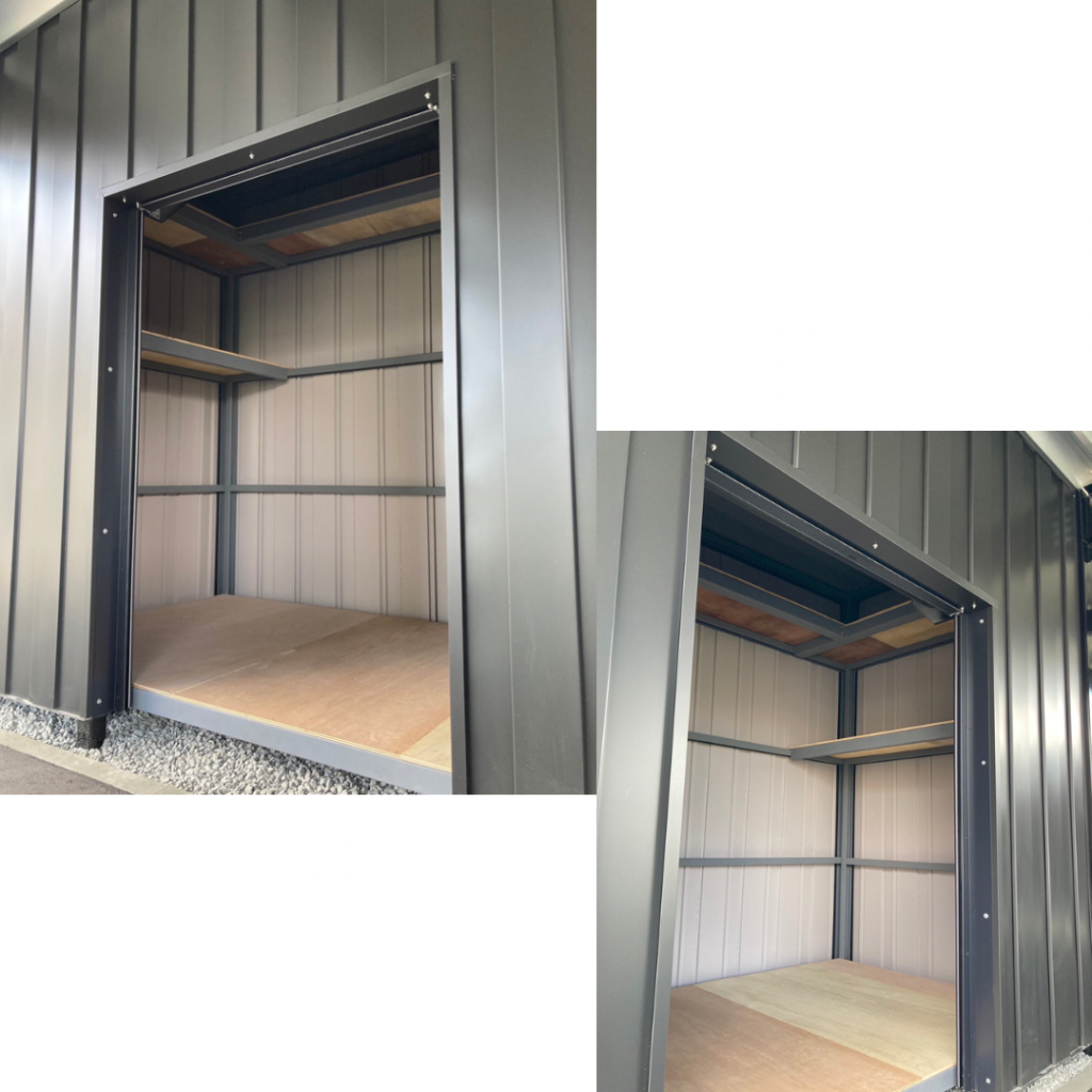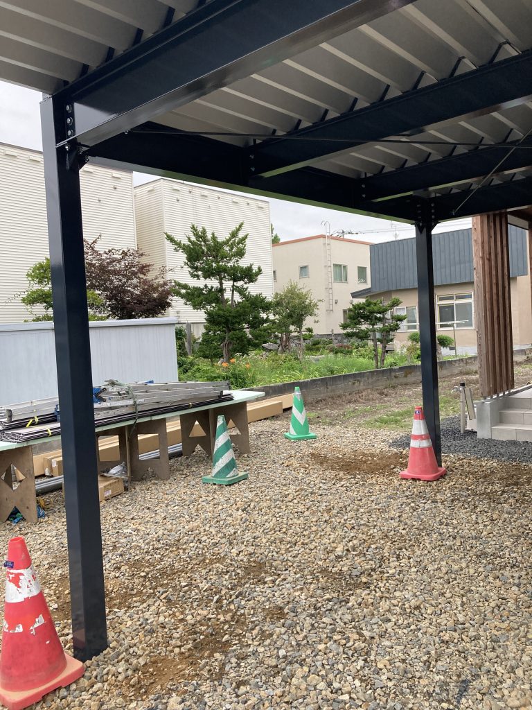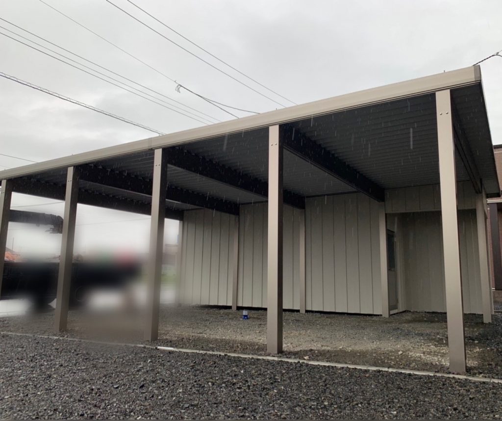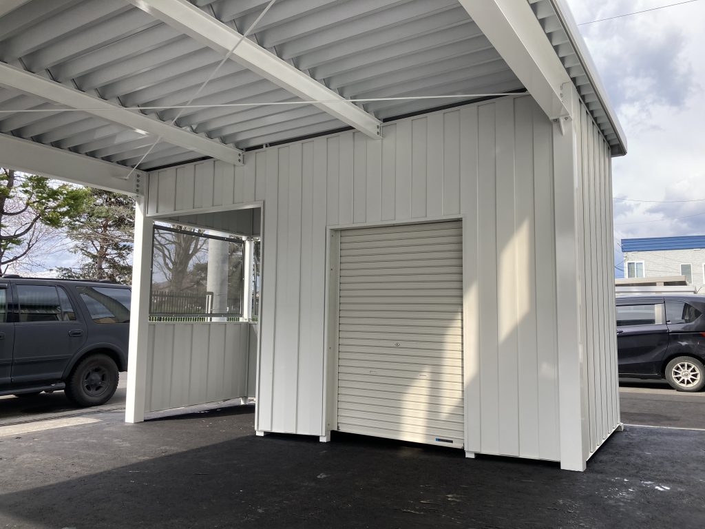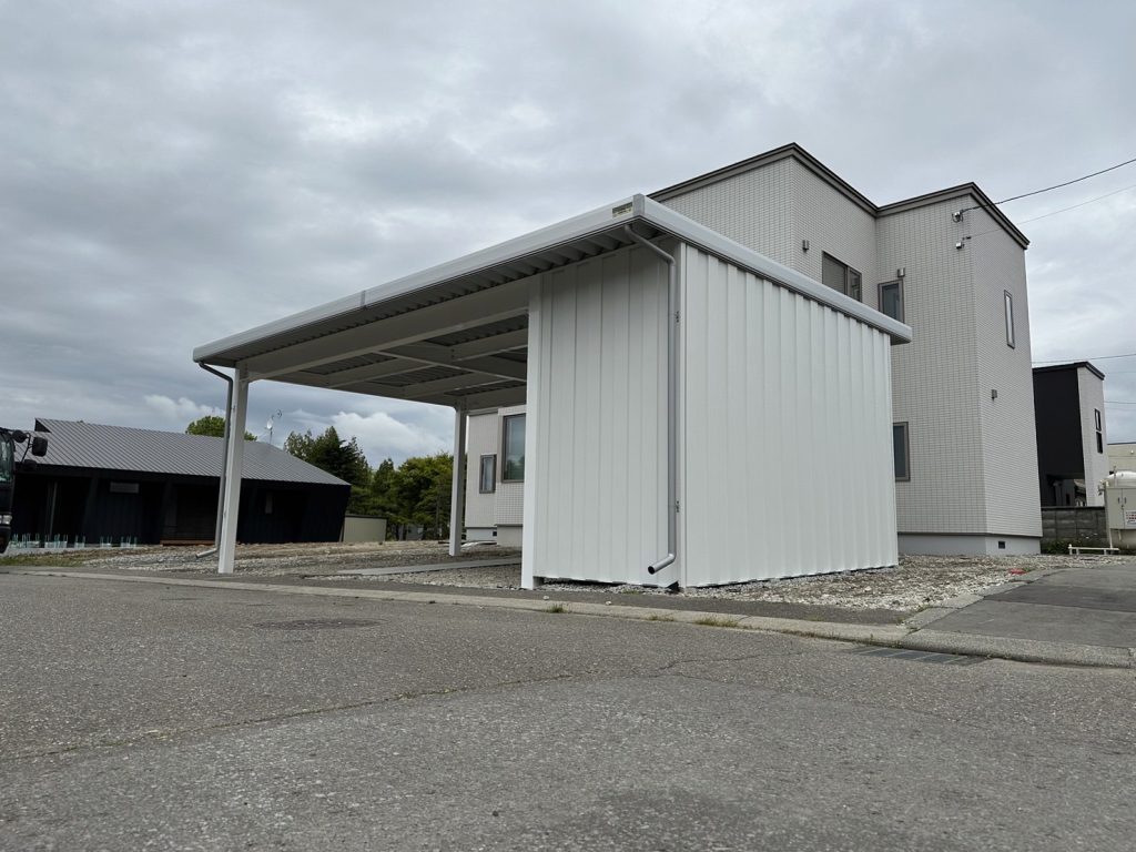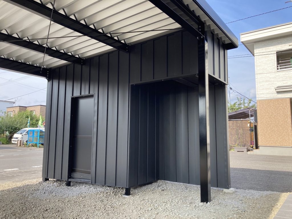 旭川施工 特注2台用ストレージポート 鉄骨塗装色:チャコールグレー 外壁色:チャコールグレー(縦) 天井:金属サイディング アルミ破風:ブラック シャッター:ダークグリーン ドレンパイプ:ブラック