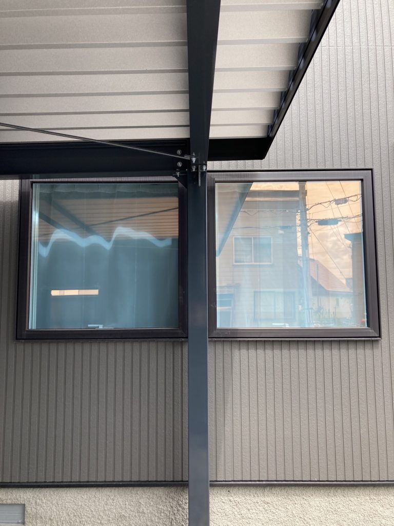通常2台用より20㎝幅広(有効5m38㎝)出入庫を考えて柱の位置を後退させて設置!!玄関位置・除雪経路も考えたお家前の空間をしっかり考えた施工です!! 鉄骨塗装色:チャコールグレー 外壁色:チャコールグレー(縦) アルミ破風:ブラック シャッター:シルバーグレー ドレンパイプ:ブラック